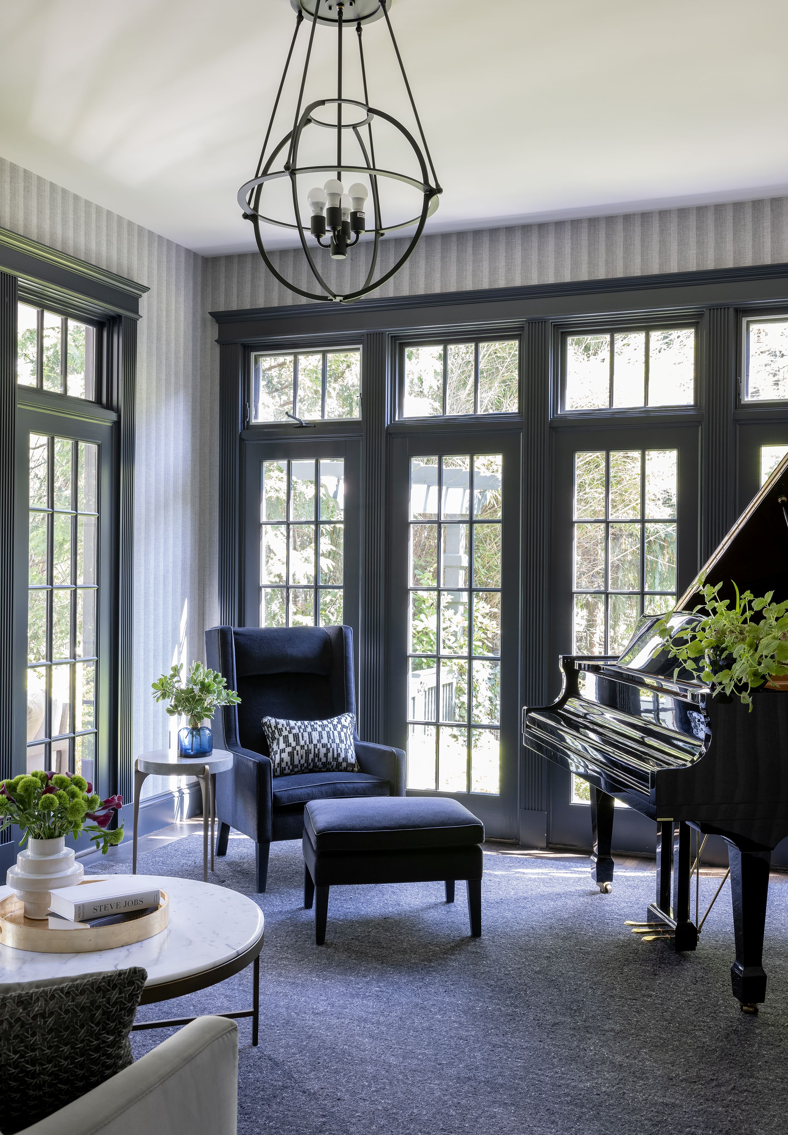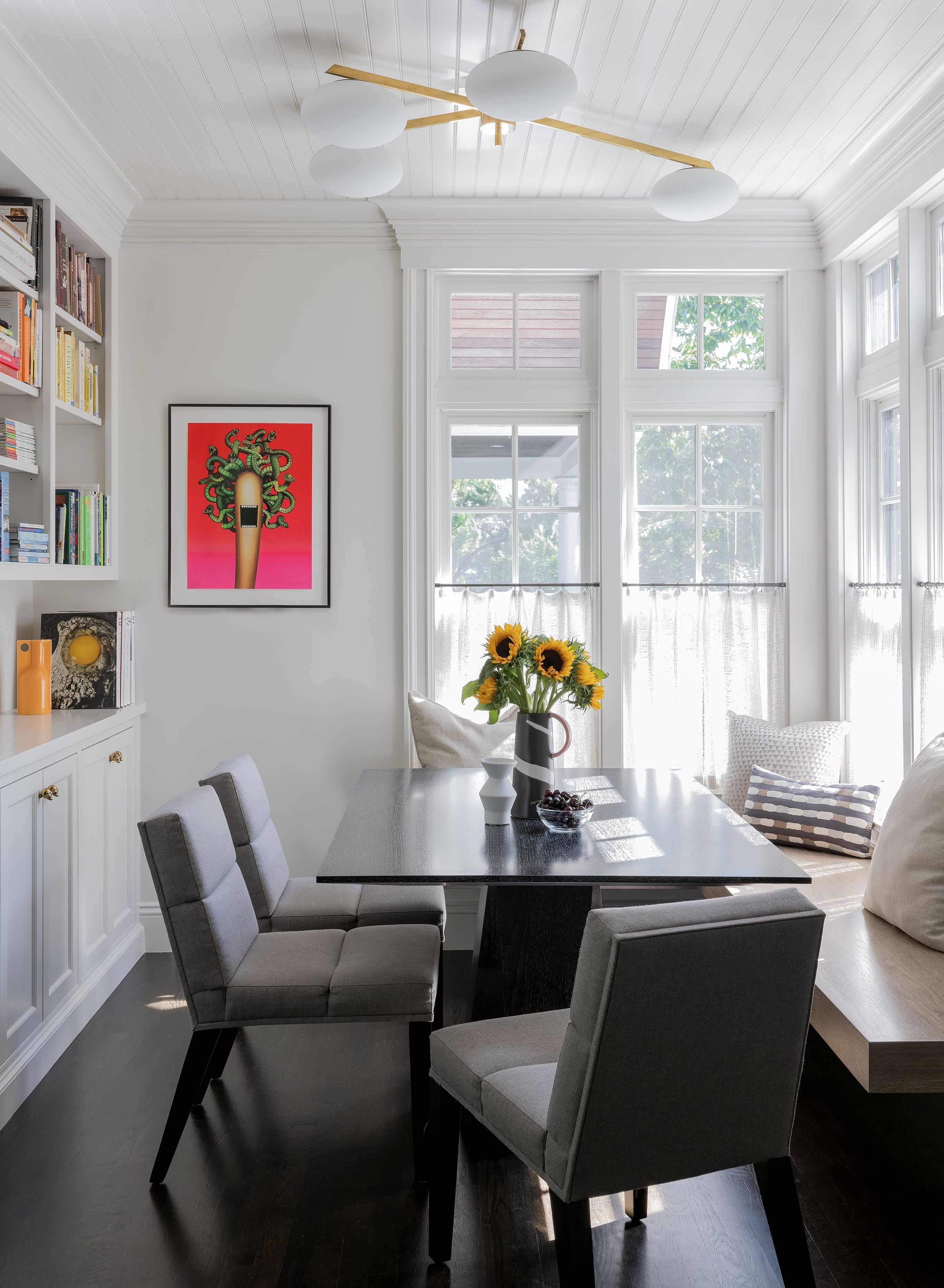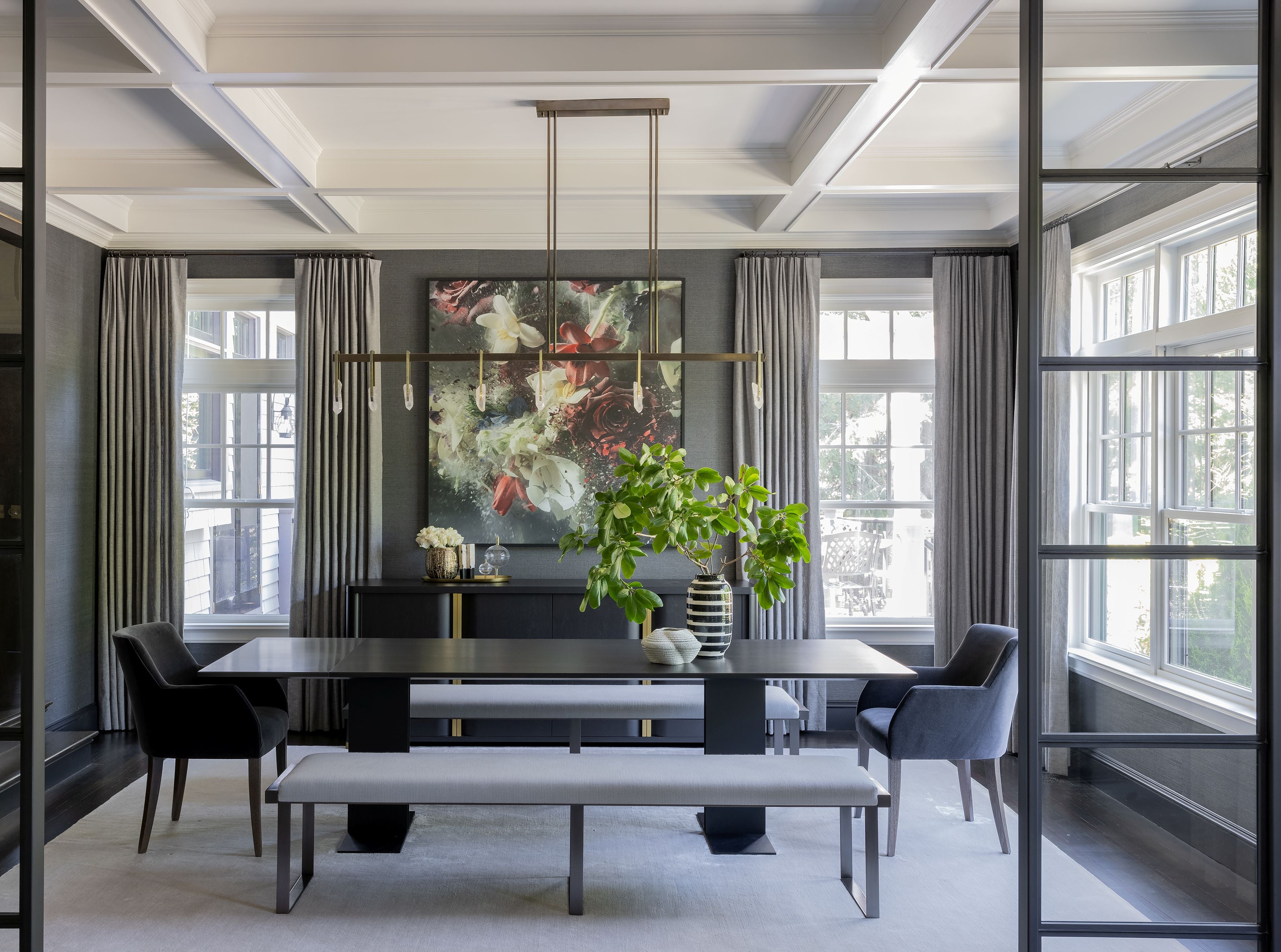 When a former client returns with a new project, it reflects an exceptional level of trust that makes the design process all the more rewarding—and the results speak for themselves. Years after a successful renovation together, this family returned to Elms Interior Design to refresh their 1999 shingle-style home for life with three kids and three dogs. The dated interiors were updated through thoughtful cosmetic changes, including new wallcoverings, material enhancements, artful lighting, and a cohesive paint palette. To improve flow between the kitchen and dining room, outdated columns were replaced with steel-and-glass transom panels, creating a more open connection. Marble waterfall-edge islands, a new backsplash, blackened cabinetry, and brass detailing add contrast and polish to the kitchen. Stone-clad fireplaces and a curated mix of vintage and modern pendant lighting bring warmth and refined elegance throughout the home.