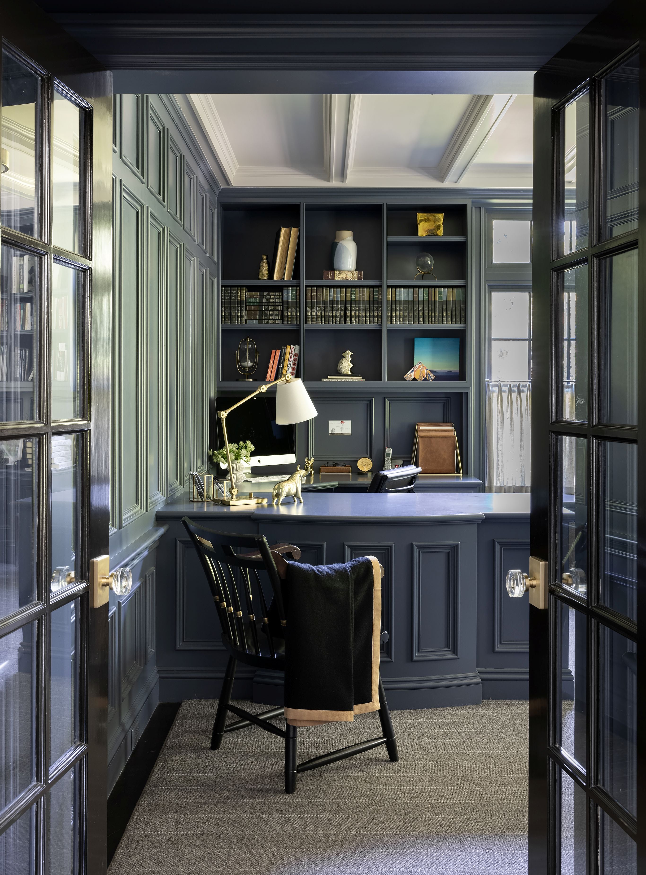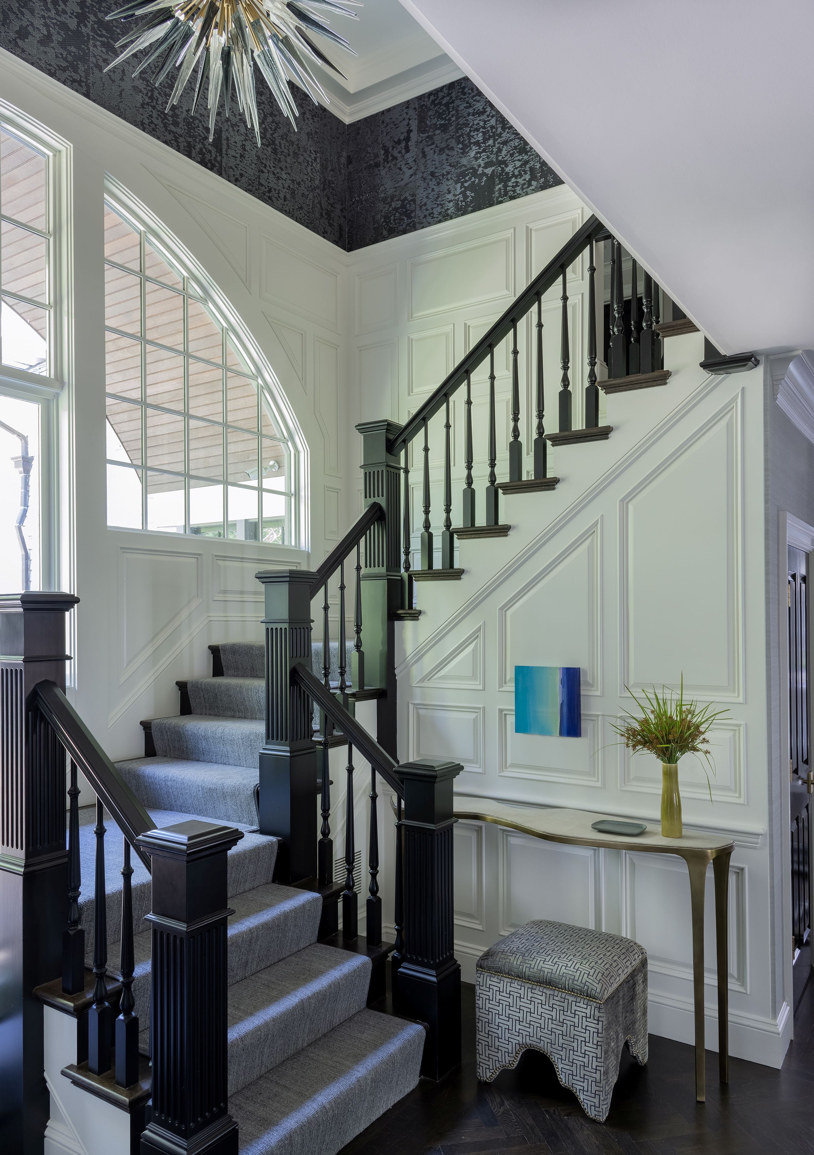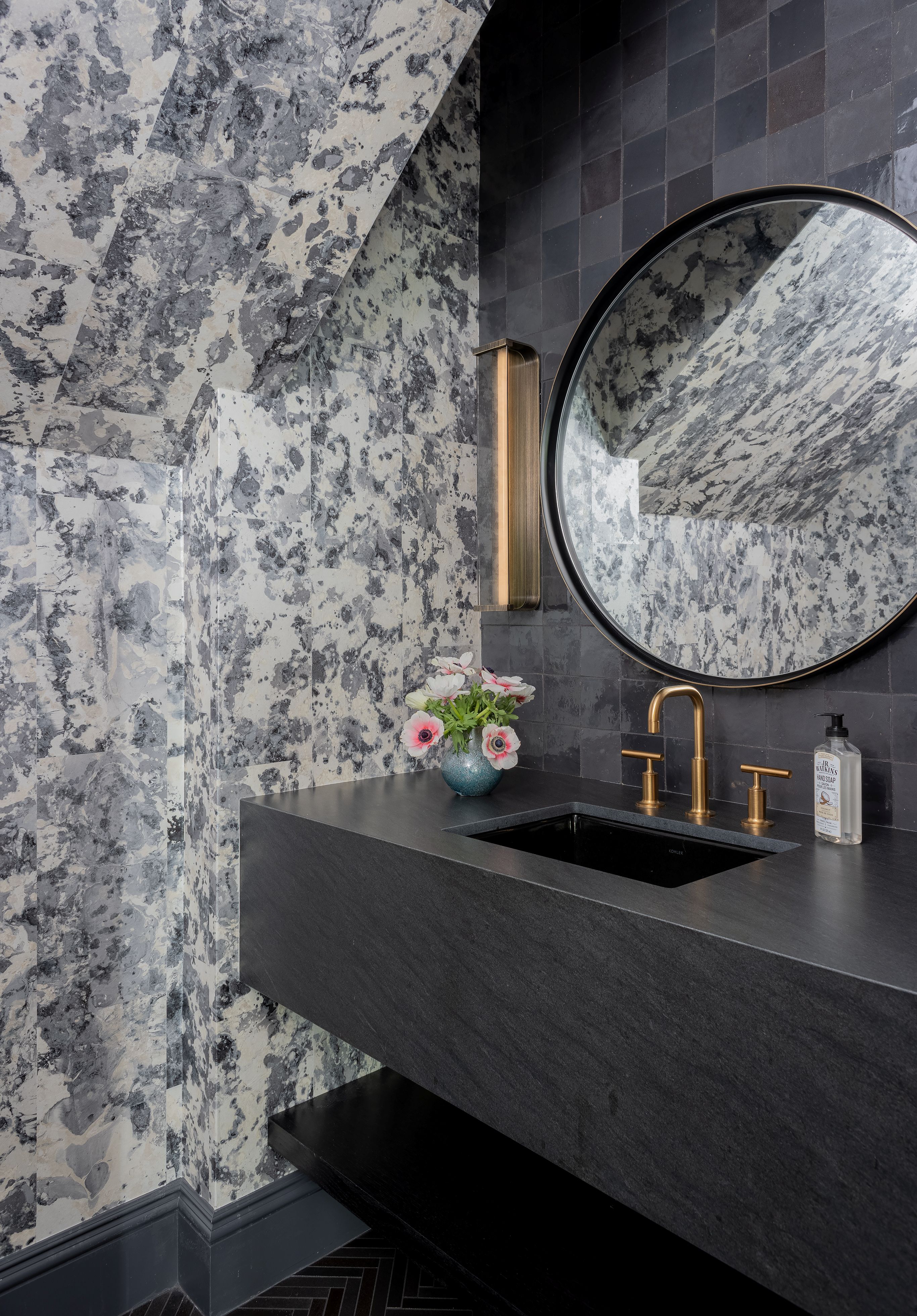 When a former client returns with a new project, it reflects an exceptional level of trust that makes the design process all the more rewarding—and the results speak for themselves. Years after a successful renovation together, this family returned to Elms Interior Design to refresh their 1999 shingle-style home for life with three kids and three dogs. The dated interiors were updated through thoughtful cosmetic changes, including new wallcoverings, material enhancements, artful lighting, and a cohesive paint palette. To improve flow between the kitchen and dining room, outdated columns were replaced with steel-and-glass transom panels, creating a more open connection. Marble waterfall-edge islands, a new backsplash, blackened cabinetry, and brass detailing add contrast and polish to the kitchen. Stone-clad fireplaces and a curated mix of vintage and modern pendant lighting bring warmth and refined elegance throughout the home.