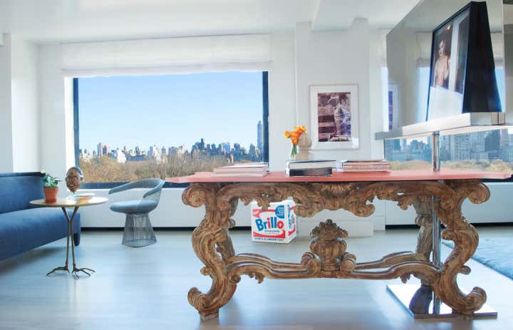 The focal point of this expansive living room is the 18th century Italian Rococo table was customized with a red acrylic top. A metal rod is inserted into the table’s top that serves as a TV stand to one side and a stainless-steel panel as a surface reflecting the views and art.