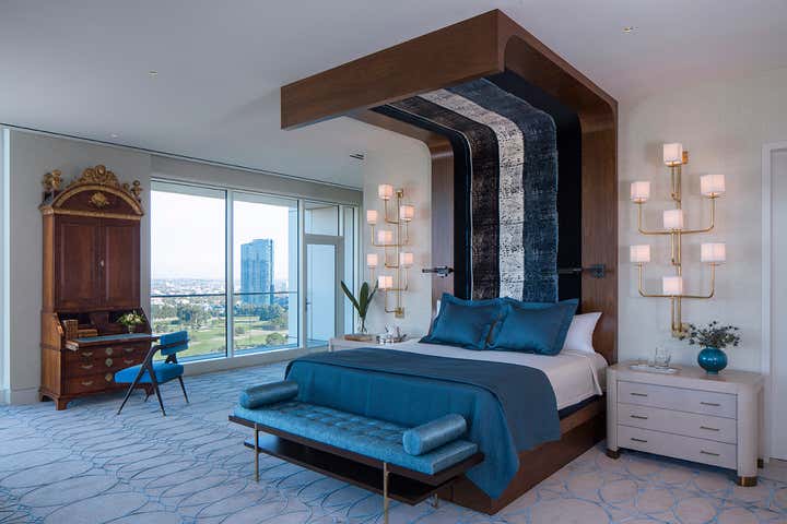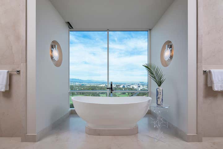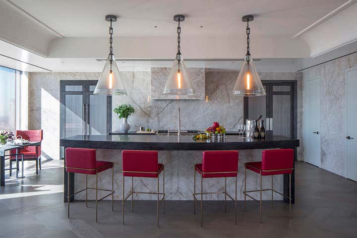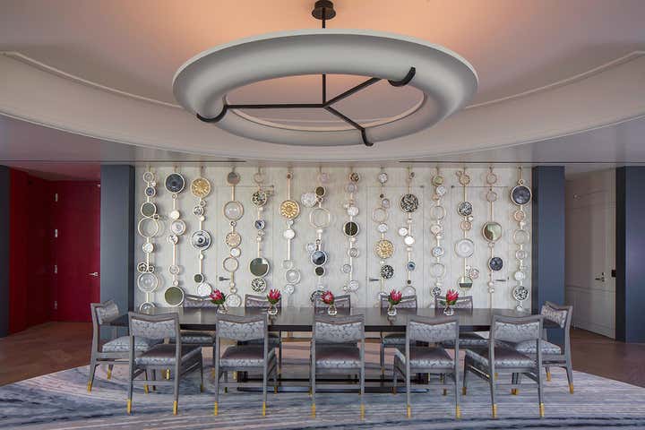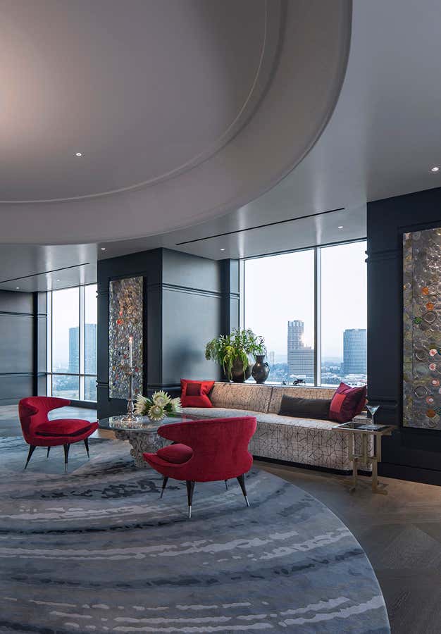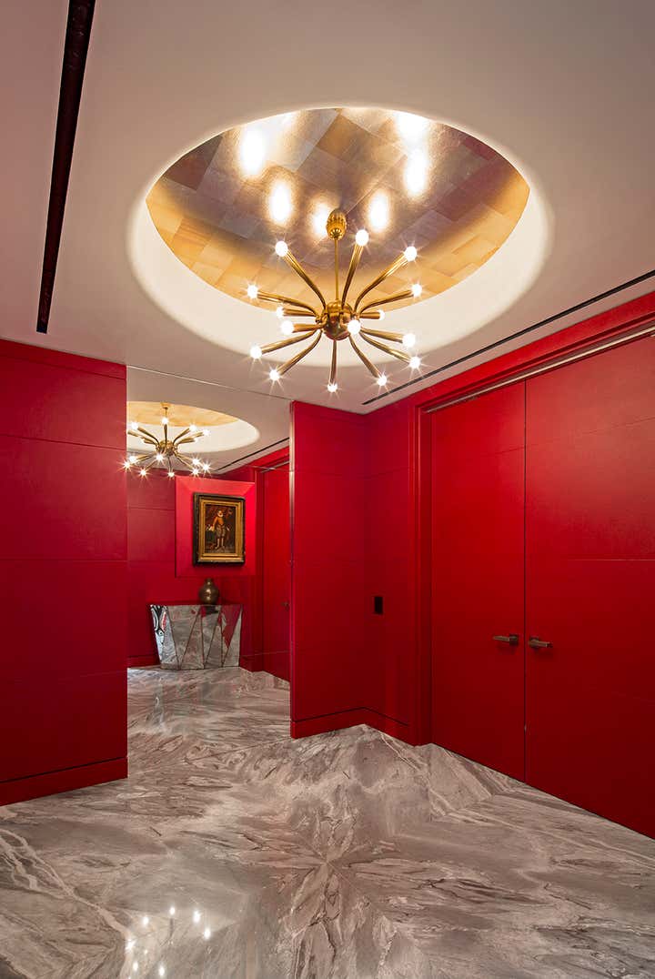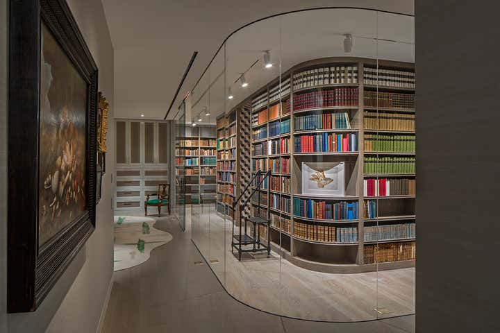For a passionate collector of books and antique engravings about nature – particularly sea life – we transformed 8,000 square feet of raw space into a bibliophile’s paradise. Centered on an amazing, glass – enclosed library housing precious works from as far back as the Renaissance, this modern aerie is about as far as you can get from Hollywood – standard, but certainly cinematic. To enhance the uniqueness of the home , we designed a number of custom elements that subtly reference nature and the aquatic, such as a screen of bubble – like forms in Venetian glass and a sinuous bar clad in hammered silver. To balance some of these more whimsical details, we incorporated select antiques that created another connection to the serious collection that anchors the heart of the home.