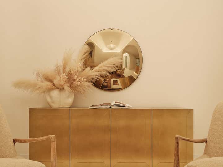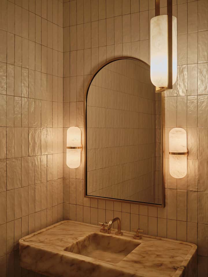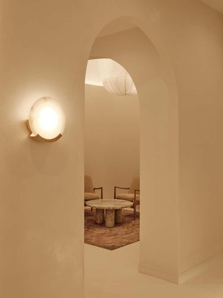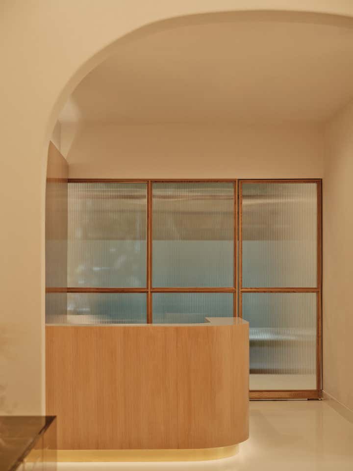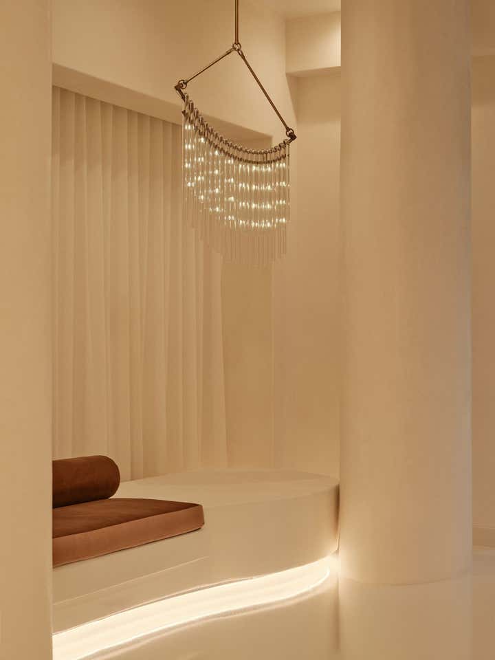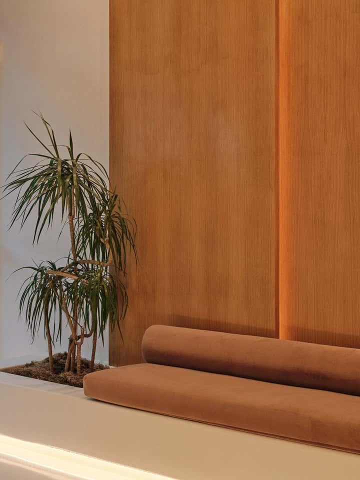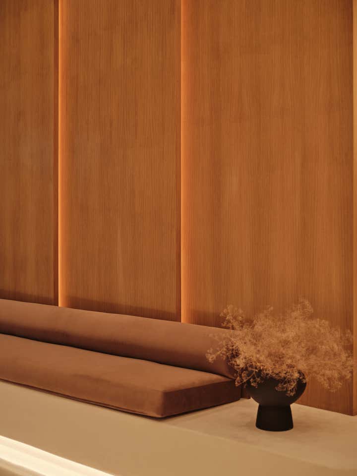 Glossy epoxy floors and luminous walls and sinuous built-in seating in hand-trowled cream plaster anchor the etherial space. White oak millwork and custom seating in rich sienna velvet create contrast and warmth, while sculptural lighting in glass and alabaster serve as illuminated art. The end result is a soulful respite rooted in form and function.