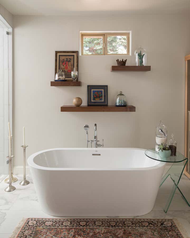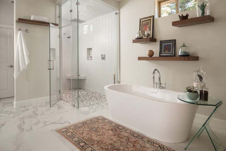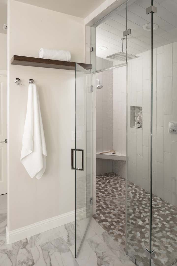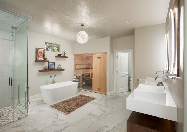 Part of a larger project that included a kitchen remodel, this luxury master bath boasts a walk-in shower, standing tub, built-in sauna, custom vanity cabinets, and a separate water closet. White walls contrast the dark wood elements, while marble and pebble tile impress both eyes and feet.