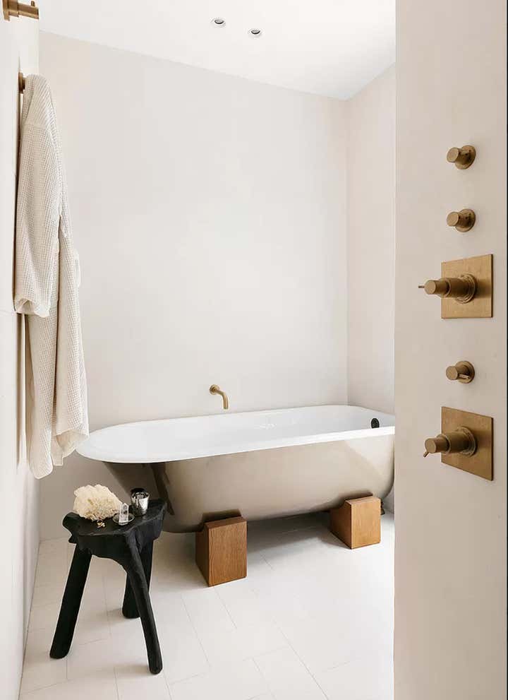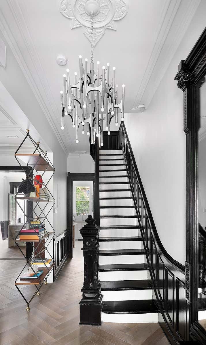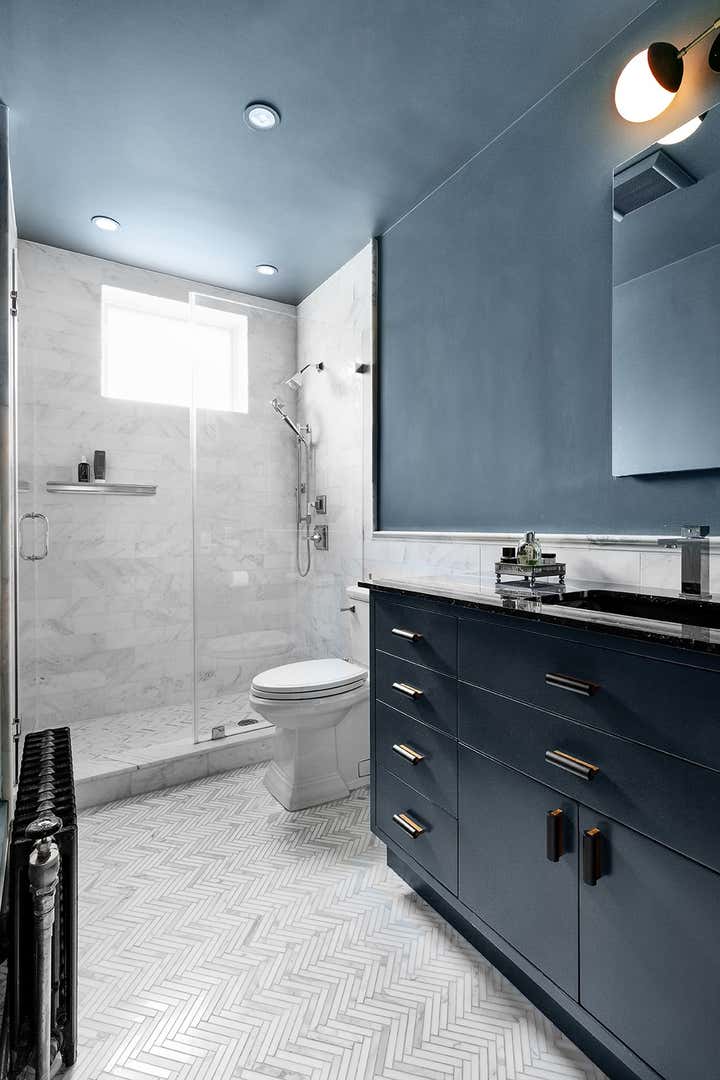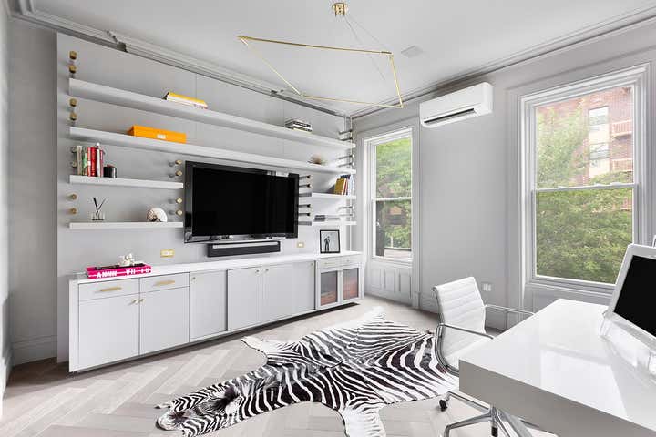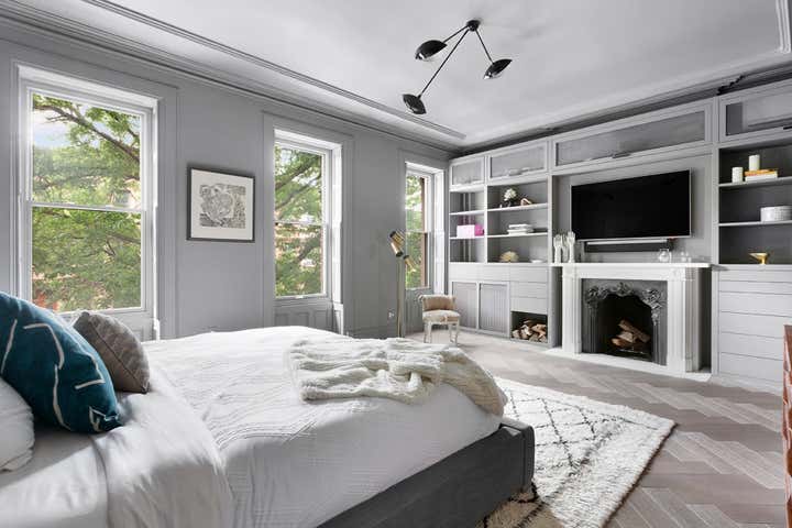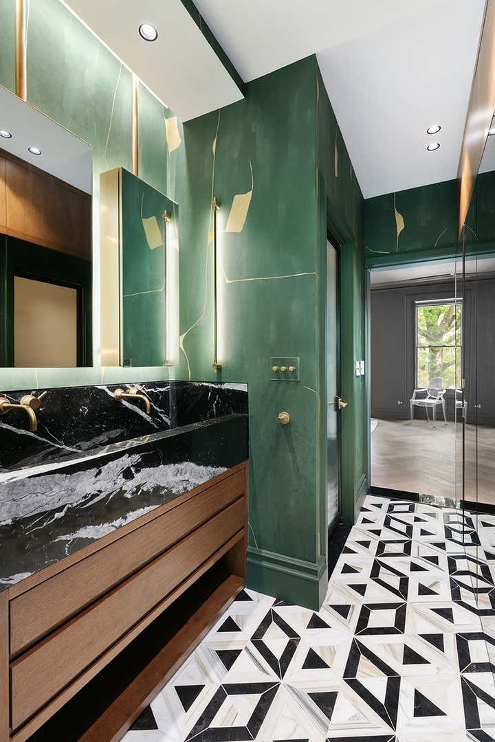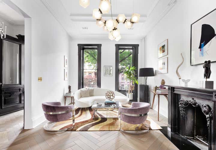 Modernization of this BedStuy townhome required a gut renovation to include painstaking restoration of its original plaster mouldings, newly laid herringbone flooring throughout and a reimagined vision for the primary suite. Pietro Russo s Canaletto, iron and brass shelving unit bisects the parlour level where a vintage Sciolari chandelier crowns the foyer and lilac velvet Karl Springer barrel chairs and a 1950s Federico Munari sofa grace the adjacent sitting room. In the kitchen, Bertoia bar stools surround a heavily-veined monolithic Carrara marble island. Occupying the second floor and flanked by a bedroom and office, an enlarged dressing room and private water closet wrapped in a hand-painted wallcovering of gold and emerald pigments and grounded by large scale marble mosaic tile comprise the main bathroom where suspended medicine cabinets surmount a custom Nero Marquina trough sink. Illuminated closets are accessed via bronze mirror clad pivot doors with inset walnut pulls and clever shoe storage on the reverse. In the adjacent wet room, an automotive finish sprayed tub seems to hover on walnut block feet, surrounded by walls swathed in Tadelakt and ribbed limestone.