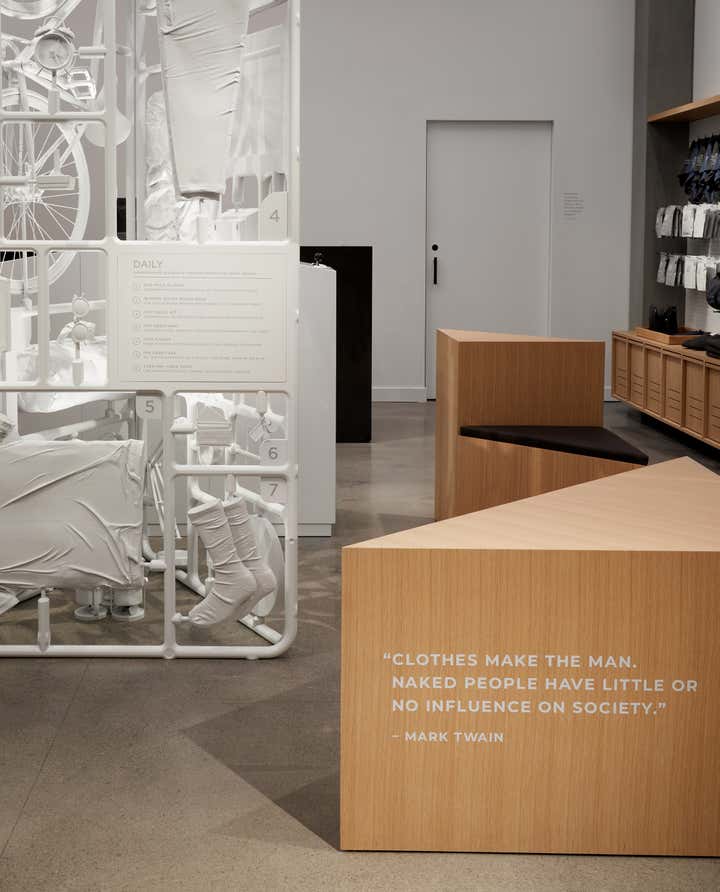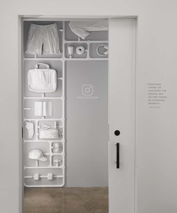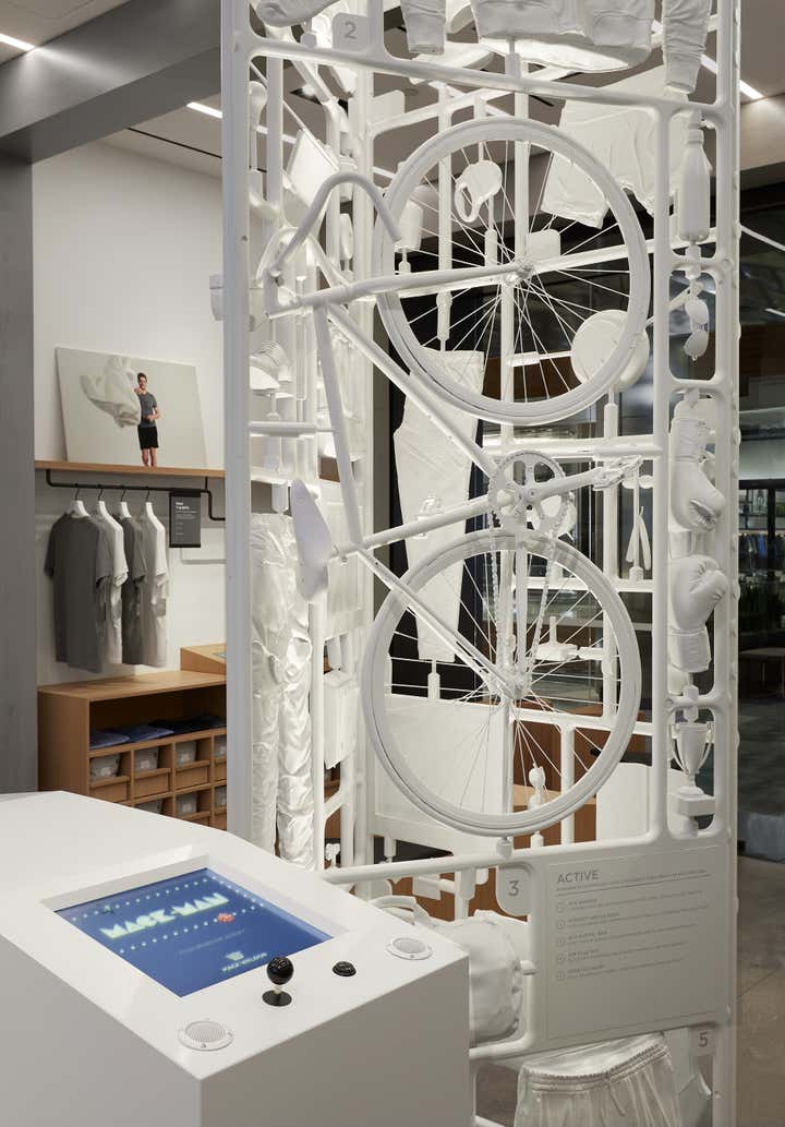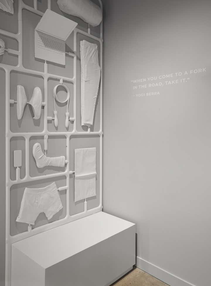 Mack Weldon, a men’s lifestyle brand, decided to build their first brick and mortar space. This direct to consumer company wanted a non-traditional retail experience which reflected its technology story based on premium materials, smart design and easy shopping. The design result was a “gallery-like” space. The materials such as white oak, blackened steel, and granite were luxe but purposeful attributes part of the MW vernacular. To create user engagement, an open concept included flexible modular units with integrated seating as well as mixed media from a tactile to a digital experience. The centerpiece was a sculpture composed of iconic objects and MW product divided into 3 lifestyle panels: Daily, Work, and Active. Perimeter bay units organized merchandise, offered storage and displayed iPad interactive moments. Vinyl quotes and custom sign holders for branded content added another layer to the storytelling. The video projection, custom game consoles, and Mack-Man, an arcade game where the user needs to beat the clock and get dressed him with MW product, became fun brand extensions. The 360 experience is complete with the most forgotten room, the changing room. This became an opportunity, an Instagram call to action where a user can interact with the wall mounted sculptural pieces.