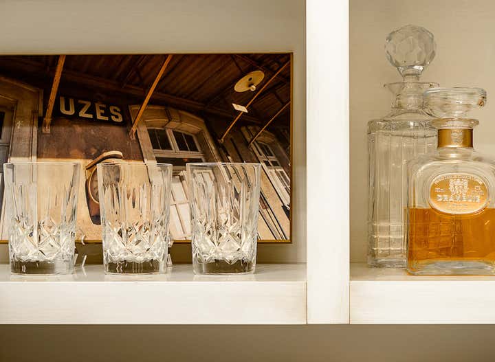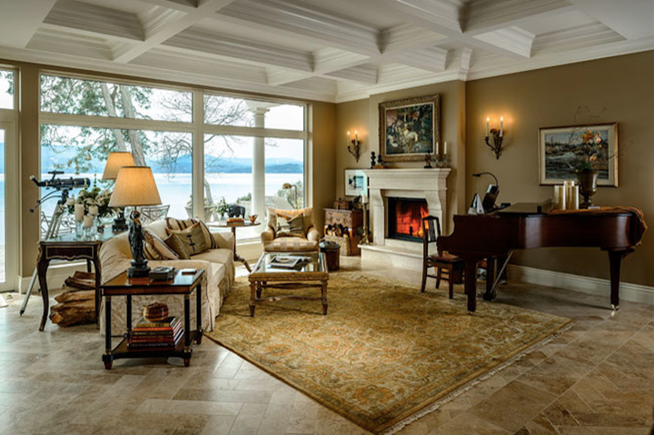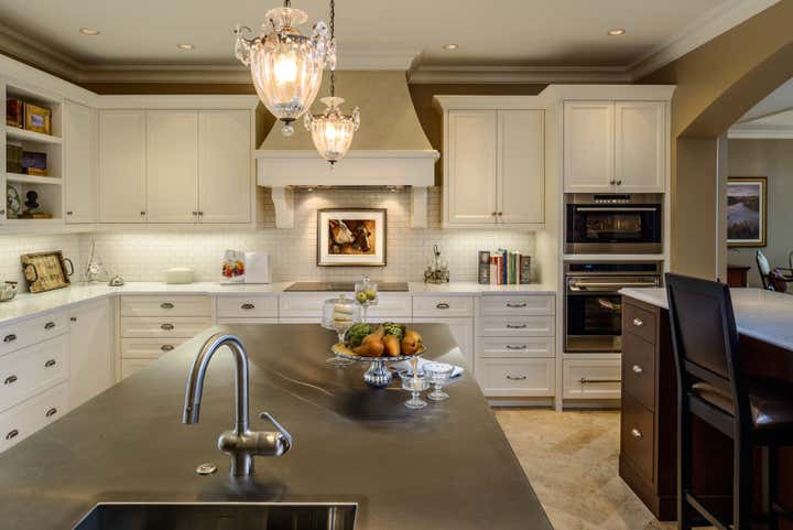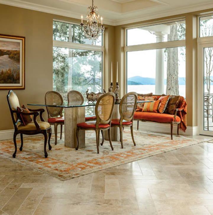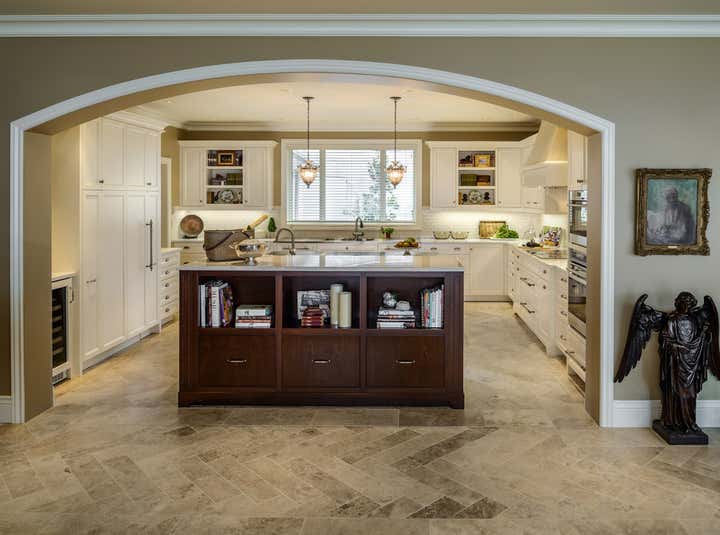 Framed beautifully with a curved entrance to the kitchen, with travertine tiles in a herringbone pattern.