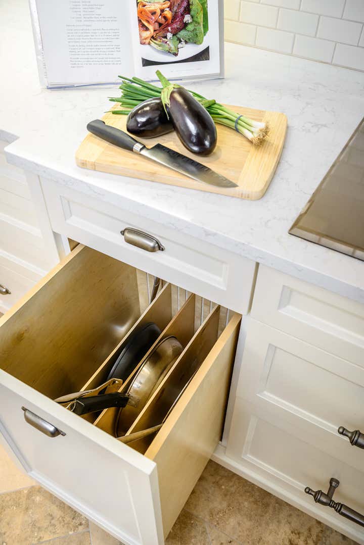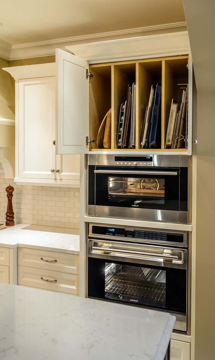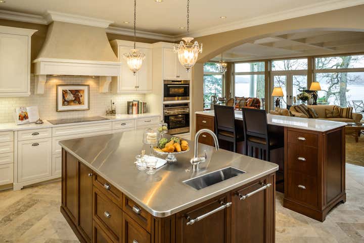 Traditional kitchen with a modern feel of double islands at different heights and different wood finishes.