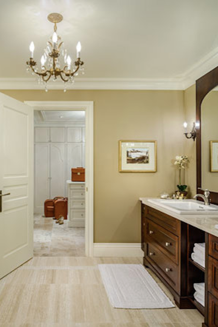Traditional chandelier complementing the travertine floor and the dark wood cabinets in the ensuite.