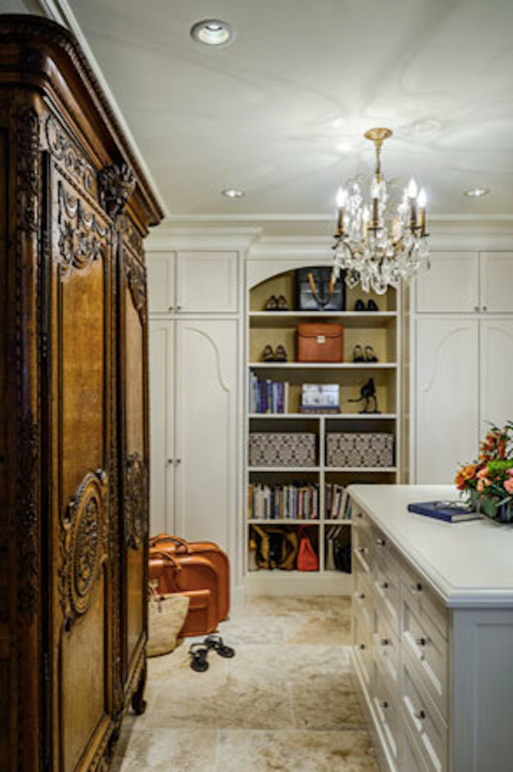 Traditional white inbuilt cabinets with island for extra storage and a beautiful antique dresser all complementing this walk in wardrobe.