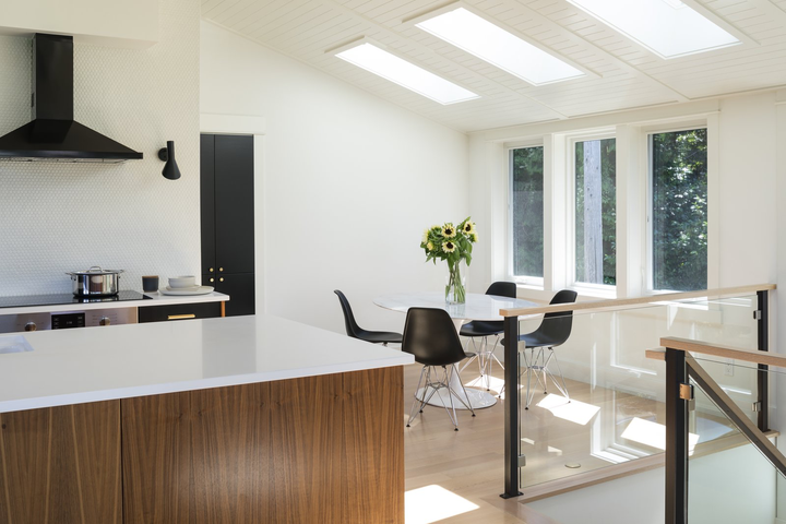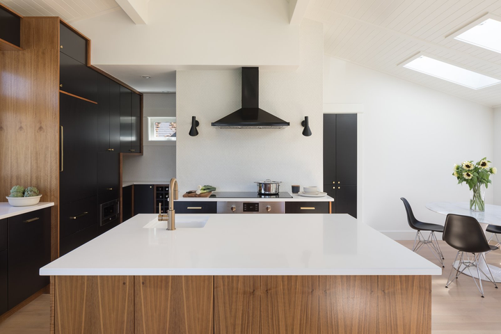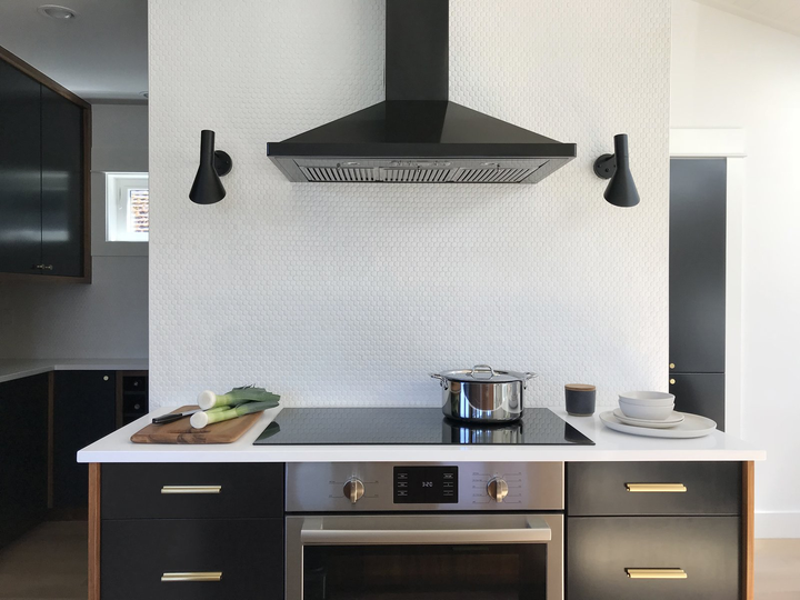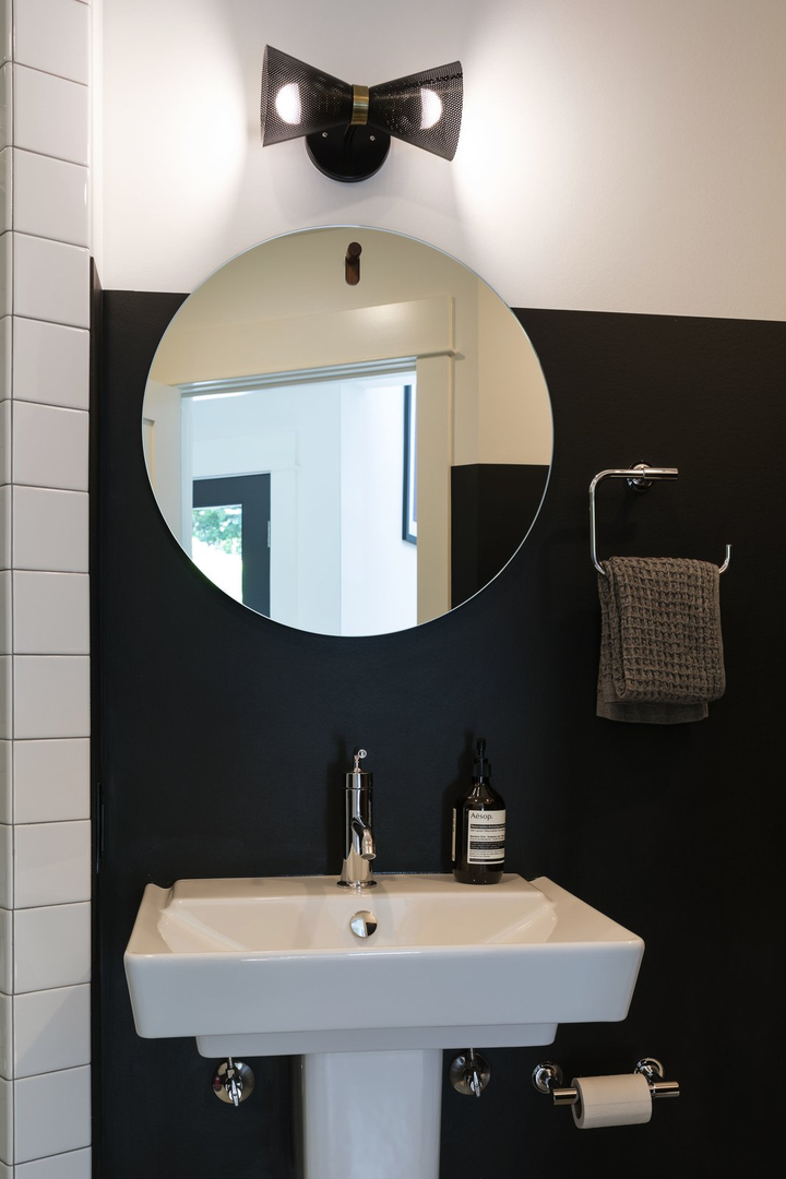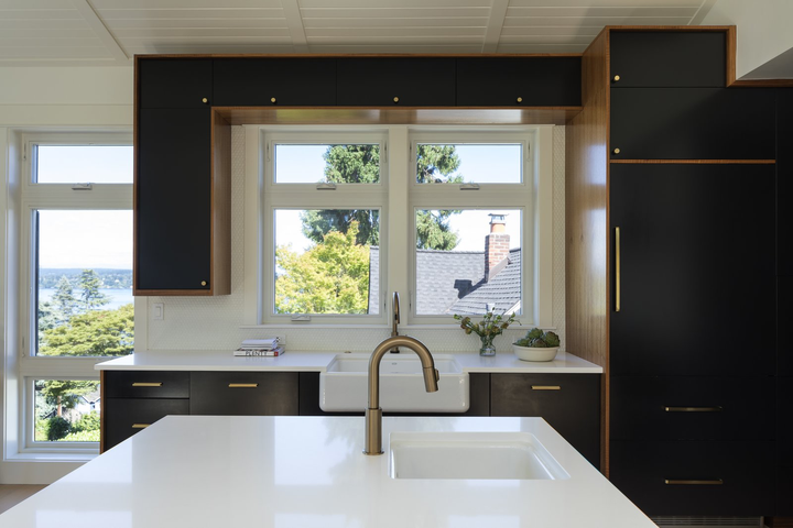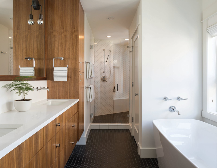 Black, white and walnut was the palate for this Seattle-area home on a hill. Melding the two clients styles (she likes transitional, he more mid-century) was the key to creating a space that is both warm and sleek. Custom walnut and black painted cabinetry in the kitchen are combined with satin brass plumbing and accents. A wall covered in penny round tiles offers a bit of whimsy to an otherwise serious kitchen. The color scheme was carried into the bathrooms this time paired with polished chrome fittings and hardware.