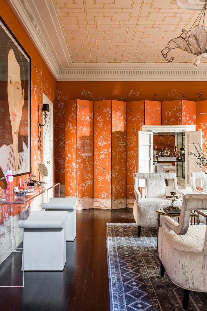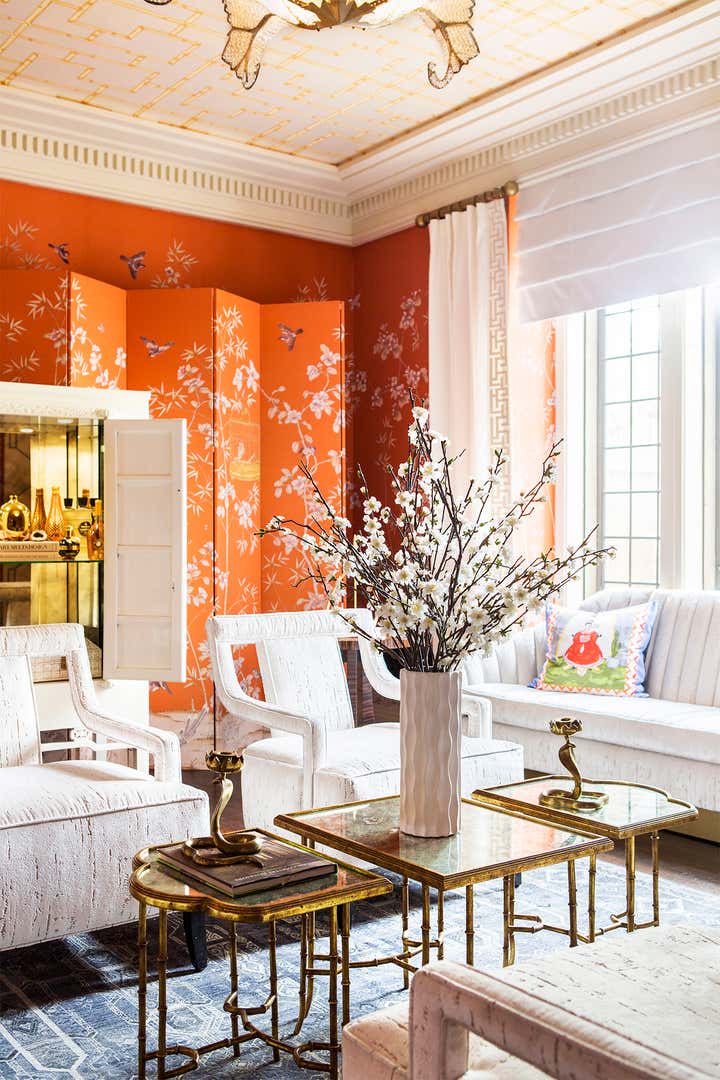 Andrea chose a bright color palette to wake up a traditional sitting room, creating a delightful, enchanting space infused with a fresh sense of glamour and sophistication while honoring the history and architecture of the building.