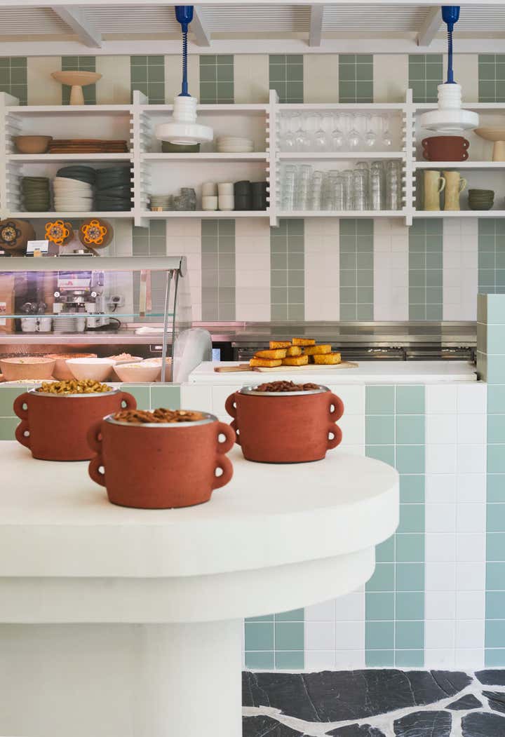 In this decor, softness and naturalness come together with raw materials such as white lime. On the floor, the stones are a nod to the stones typical of Greek villages, as are the ceramic dishes.