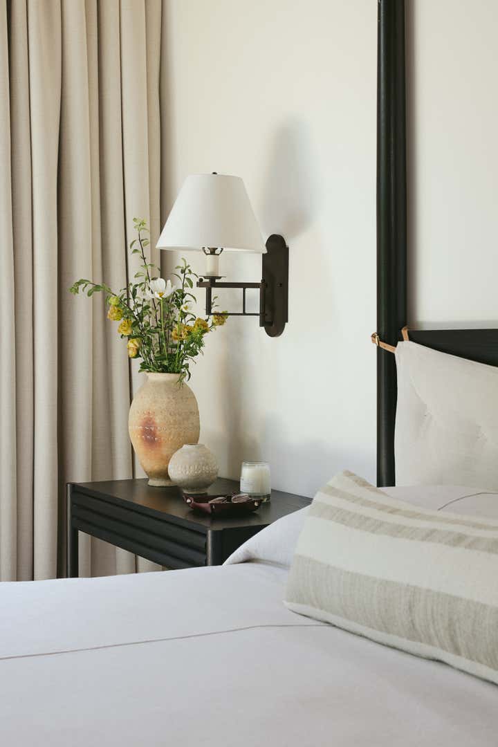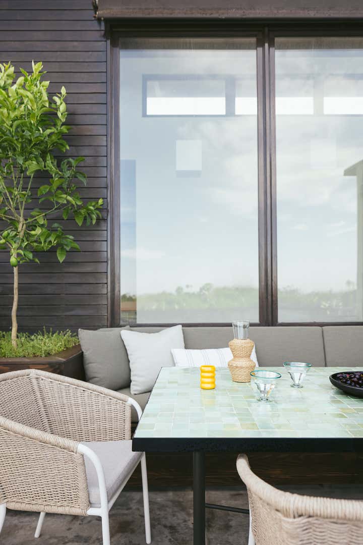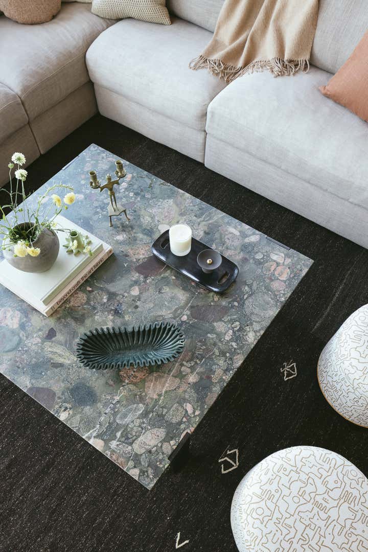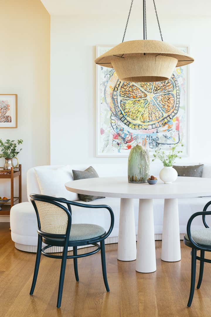 In the living spaces, cozy upholstery in earthy neutrals is paired with sculptural tables, organic ceramics, and playful pops of color, creating an environment that feels both elevated and relaxed. The dining area features a sculptural ash table with a built-in banquette, encouraging slow meals and conversation while capturing the surrounding views.