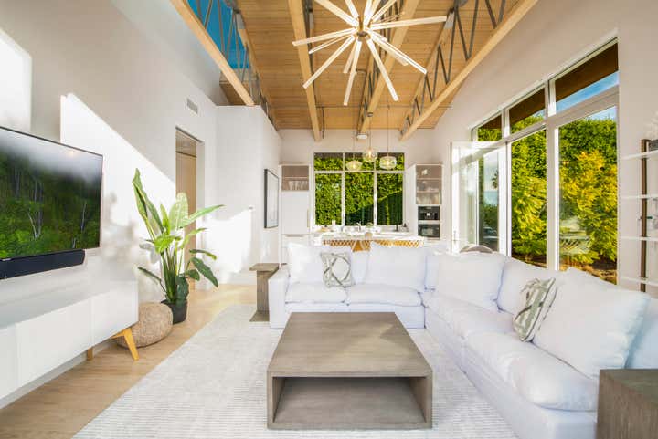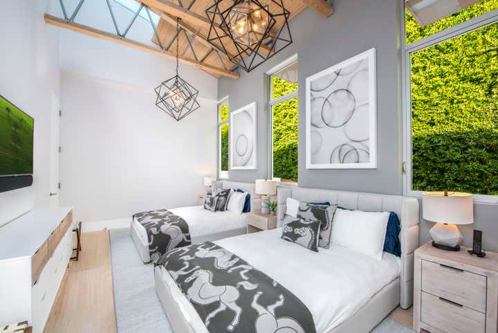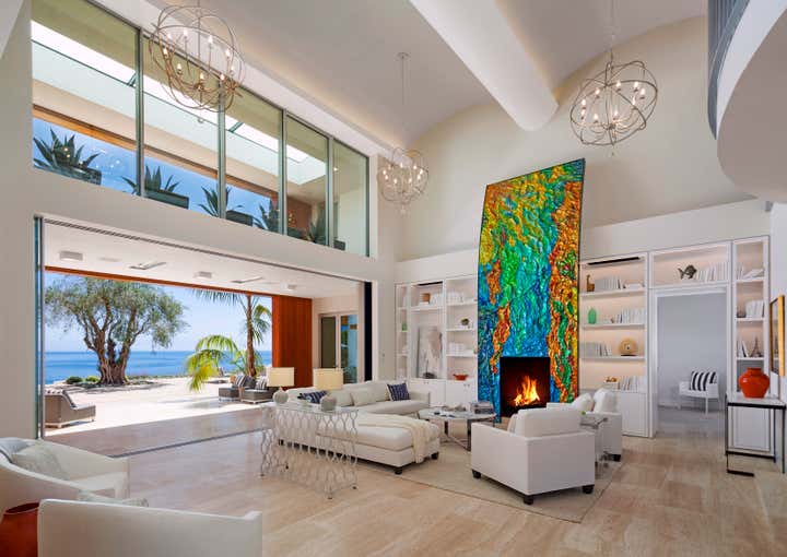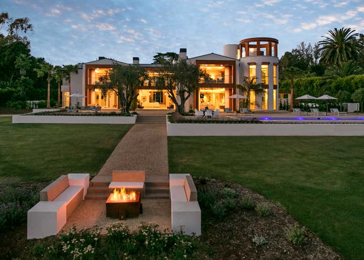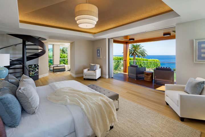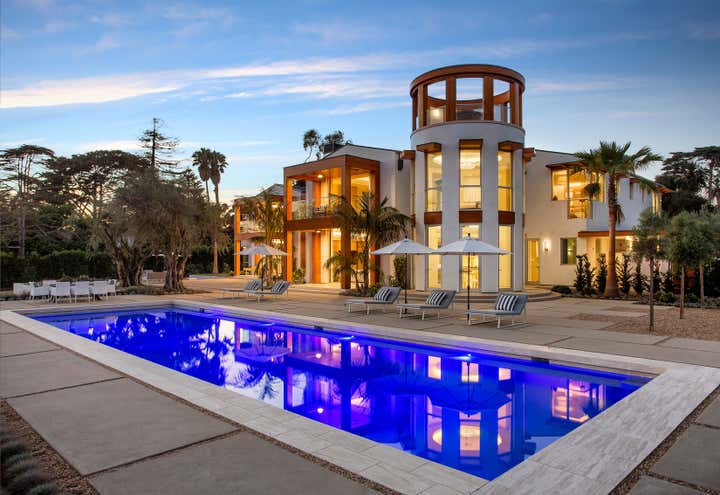 This 10,143 square foot property located on the bluffs of Hope Ranch sits on a 3.7-acre parcel. Features include beautifully landscaped grounds, a natural surface tennis court, and a 1,700 square foot workshop/art studio. Back-dropped by one of the most desirable ocean-front views in Santa Barbara, the spectacular contemporary residence features expansive glass walls encased by a clean, white façade and hardwood accent paneling. The unique living spaces are showcased through the glass, each with a calm sophistication and attention to detail. In addition to the main living room, dining room, and family kitchen, the home boasts an amazing home theater, pilates/yoga studio, bar and auxiliary kitchen for large scale entertaining. The main living room at the center of the home features a unique, commissioned fireplace surround by a local artist. Upstairs, a private office and three guest bedrooms with ensuite bathrooms each take on a individual flair. The second floor master suite includes a spiral stair to a private rooftop balcony with traditional spa. Additionally, a meditation room with a private bar are included as part of the master suite. The home is customized with the latest in smart home technology featuring an automated Lutron lighting system, whole house entertainment system, heated entry way, remote-controlled fireplaces, and three fully-automated salt water aquariums operating of a centralize pump. The grounds include a heated pool, outdoor terrace, cliff-side seating area with fire pit, and private stair down to the remote beach.