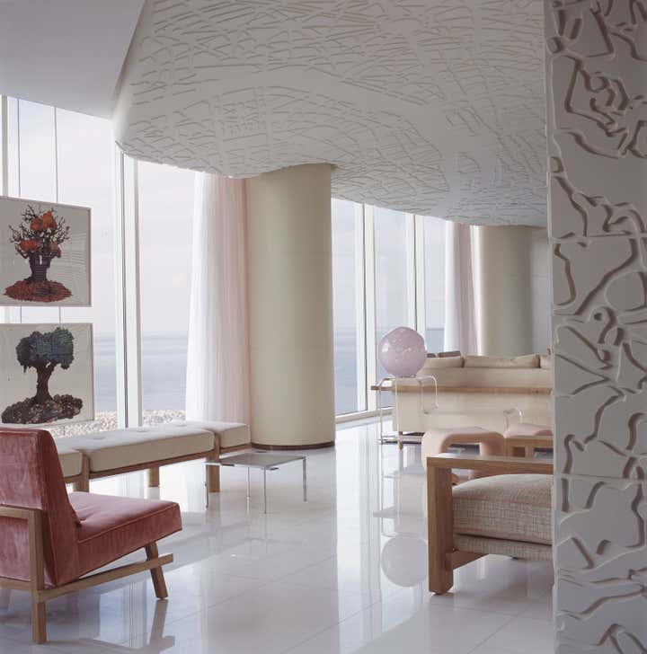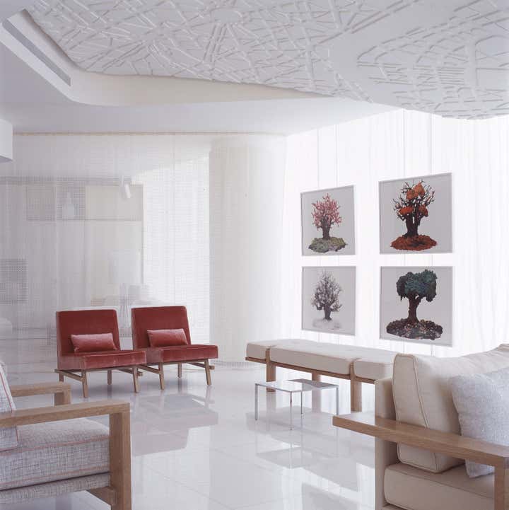 This 5000sf apartment merges traditional Islamic decoration with a sharply modern space and bespoke furnishings. Hand carved gypsum panels form figure-ground maps of Beirut and Paris that define the grand salon.
