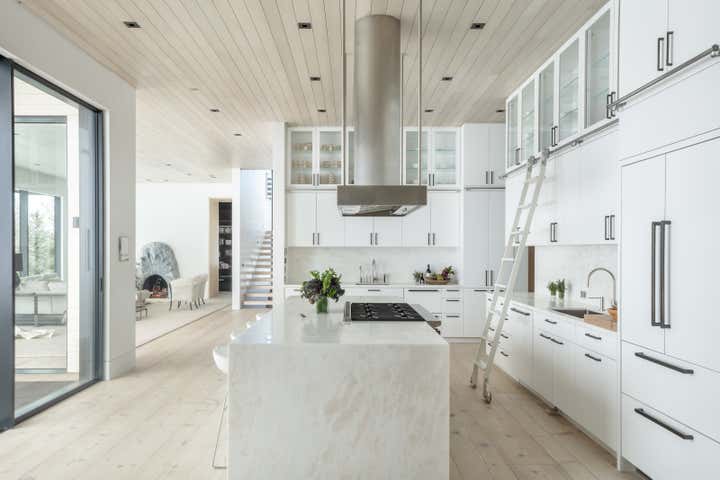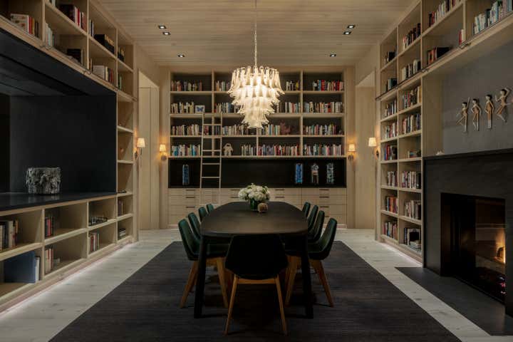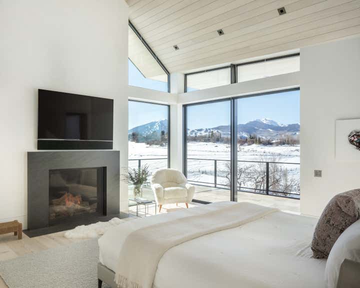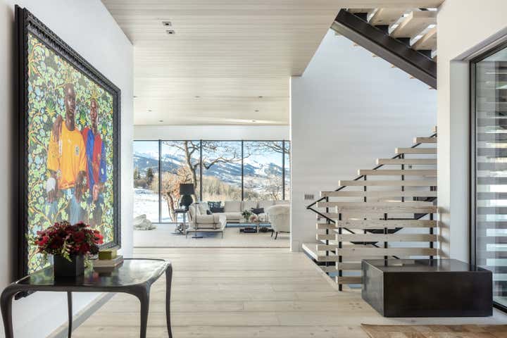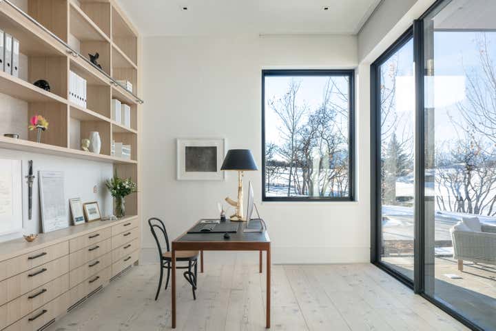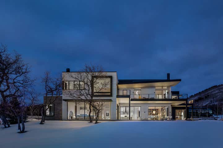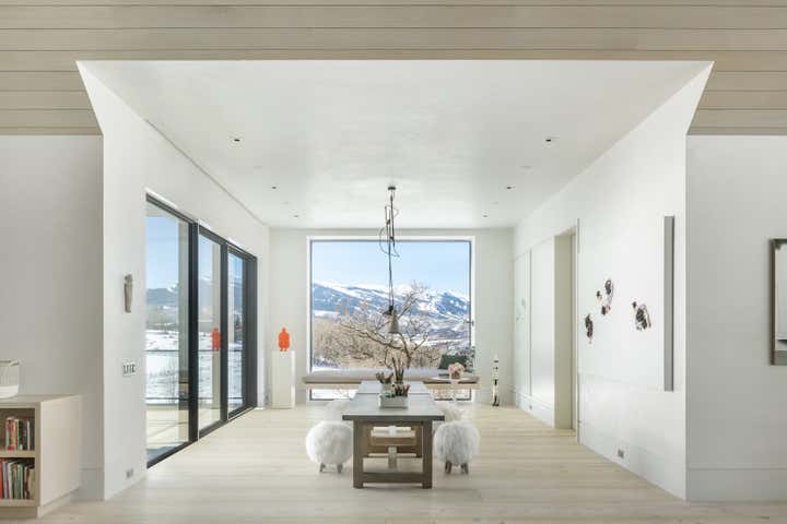 Part of a family compound, the home is positioned at the edge of a meadow, amid existing evergreens, spruce and gambel oak trees. With the goal of integrating the home on the site as seamlessly as possible, the team designed an iconic, gabled house form that gradually “peels up” from a traditional symmetrical front to an open back that transitions into the landscape and focuses on the views.
