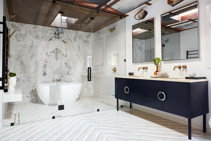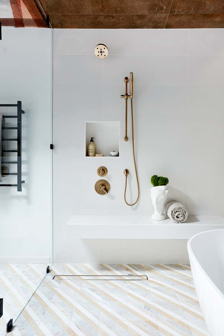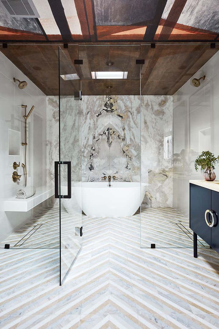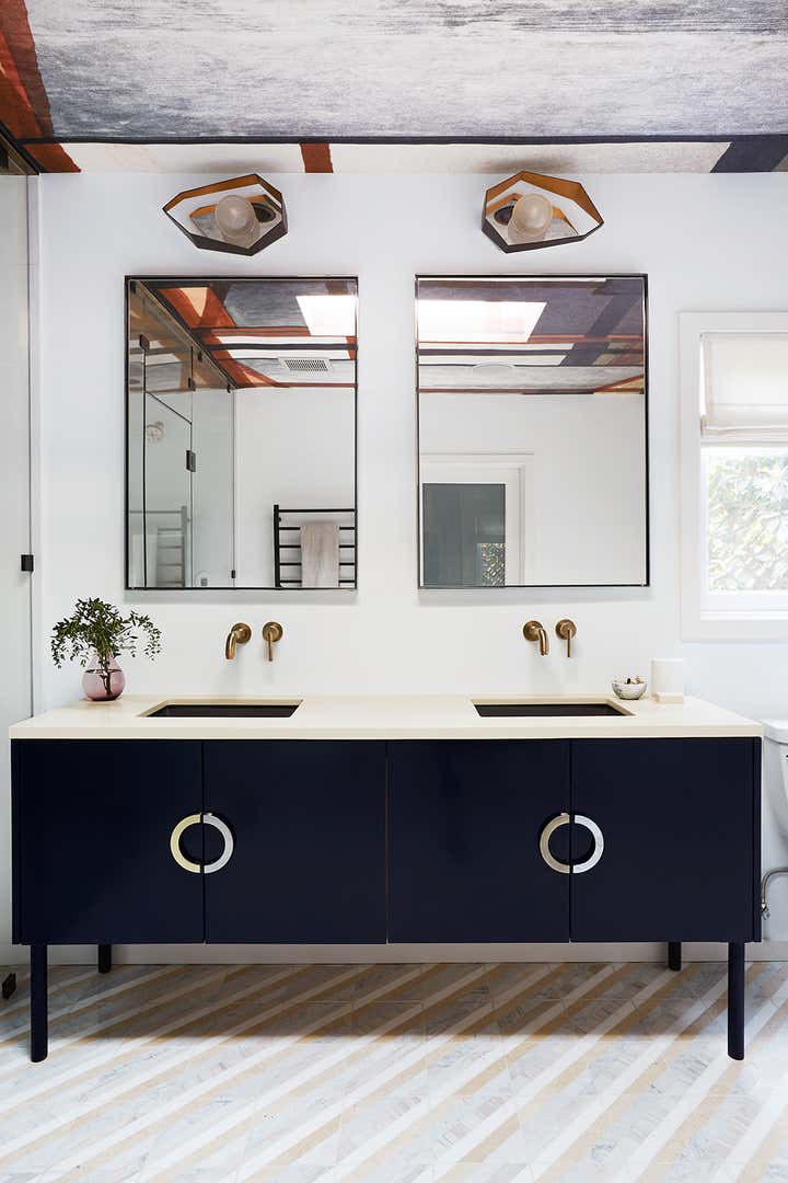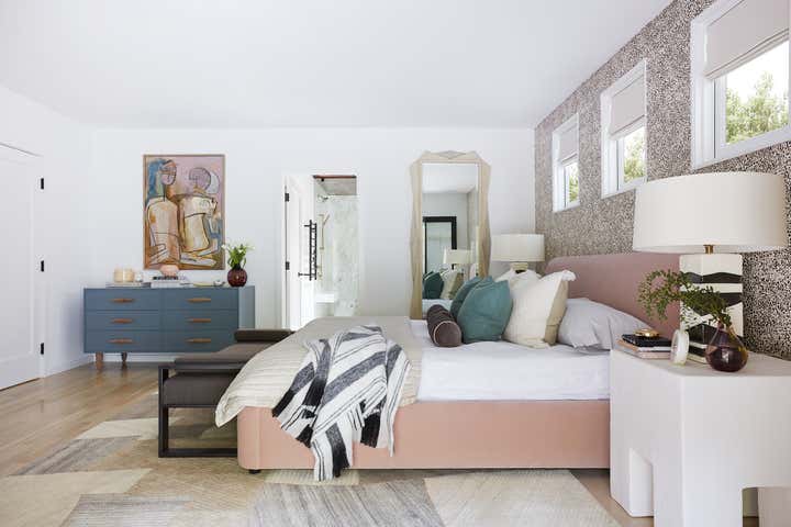With a modernized master bedroom and bathroom that felt starkly arid in a way that simply didn’t befit a Los Angeles Spanish nor our spirited client, we strove to fill it with a touch more soul. Beyond that, the primary design objective was to artfully assemble an inspired and intimate space to retreat from the chaos of the day (err, year): a private en suite that felt all at once structured and free-flowing, elegant and comfortably casual, subdued and cheerfully hued. You know, a pretty place where a girl could kick off her heels and really soak in the surroundings.