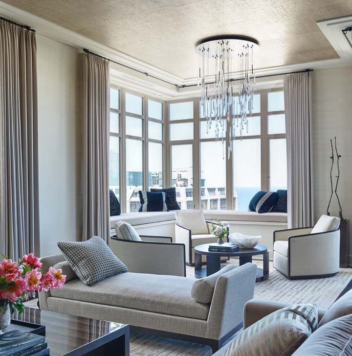 Other wall coverings throughout the apartment include a variety of woven textures and grass cloths, a hand painted deGournay Willow paper in a tarnished silver gilded paper in the guest room, and the fully upholstered walls in the tranquil master suite to name a
