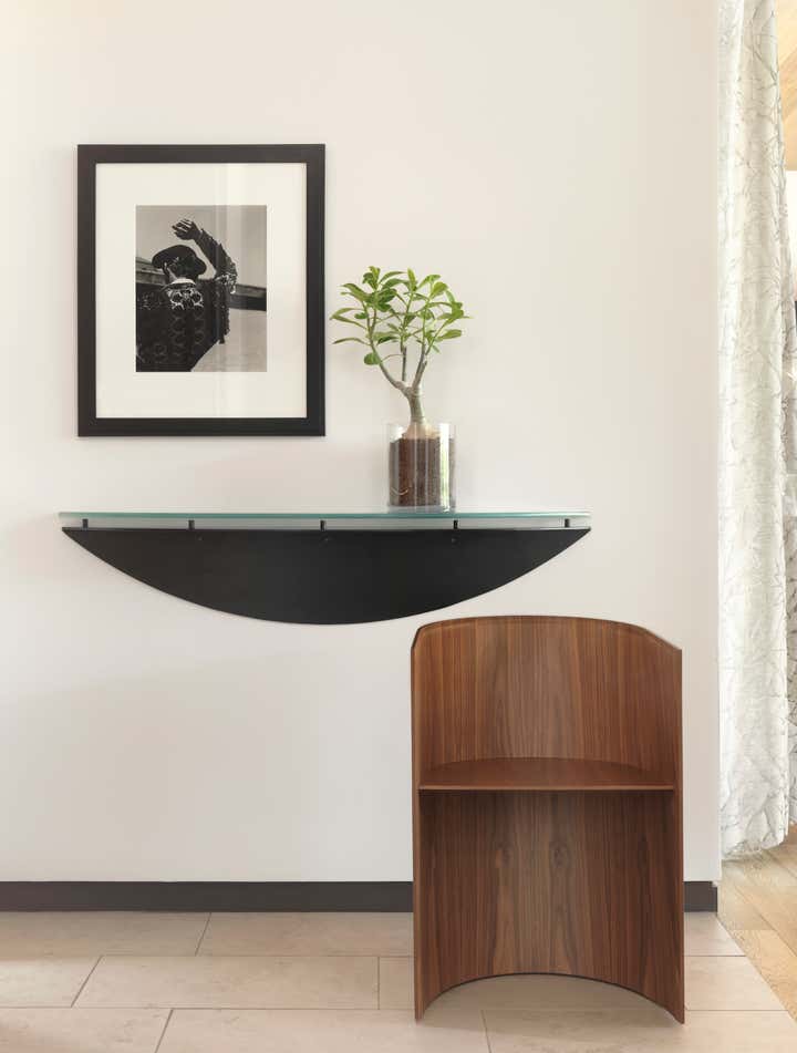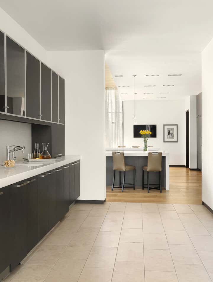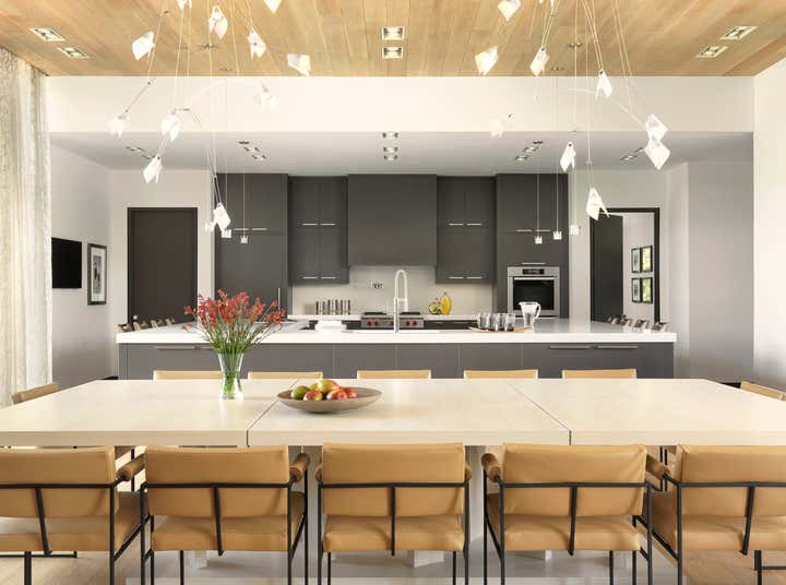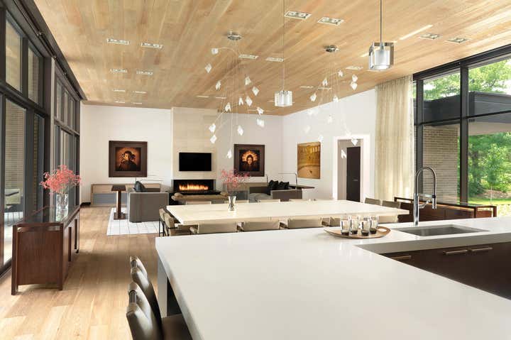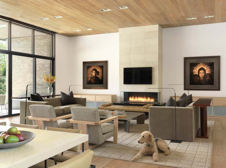 Clean and contemporary, this private residence features symmetrically arranged modern furnishings and thoughtfully placed art. Though minimal, the soft neutral palette of natural finishes and warm grays creates a rich and inviting interior.