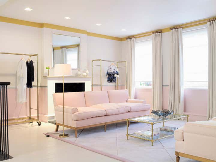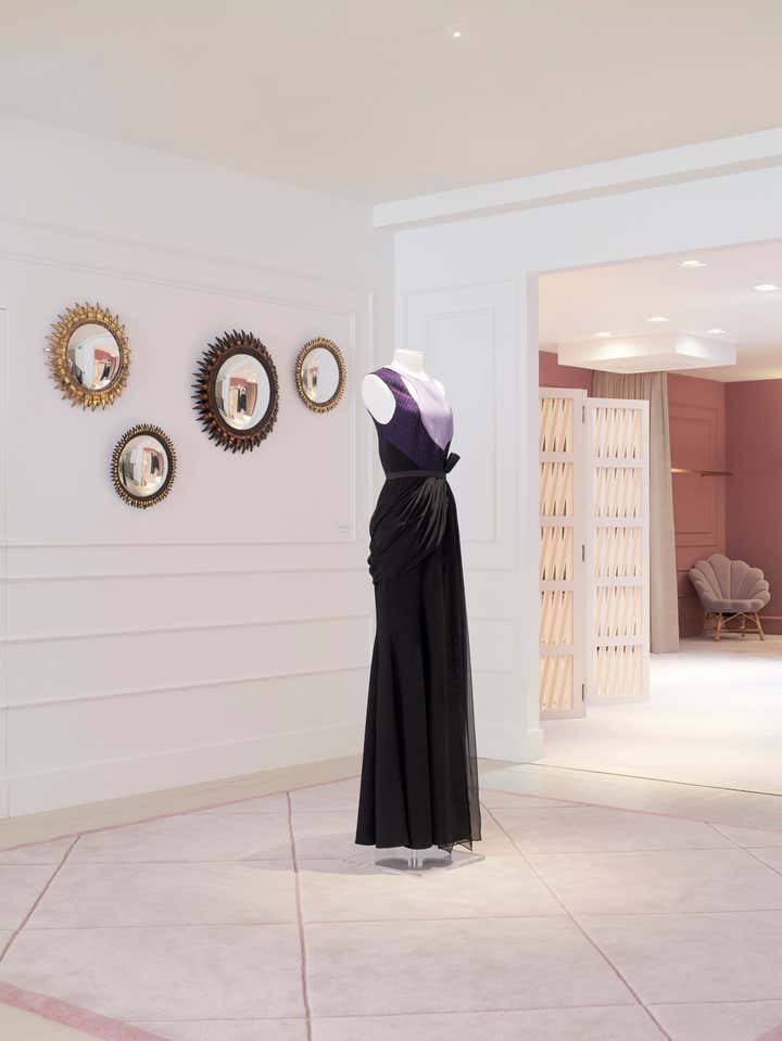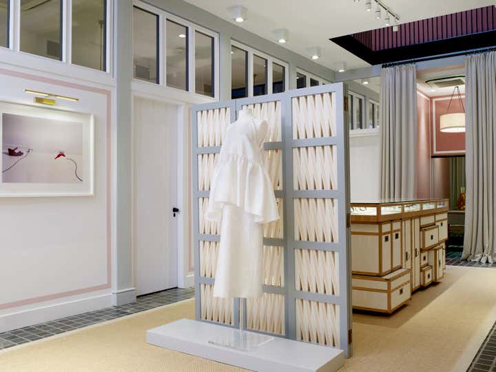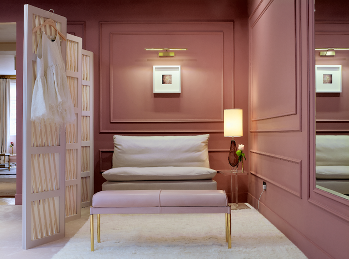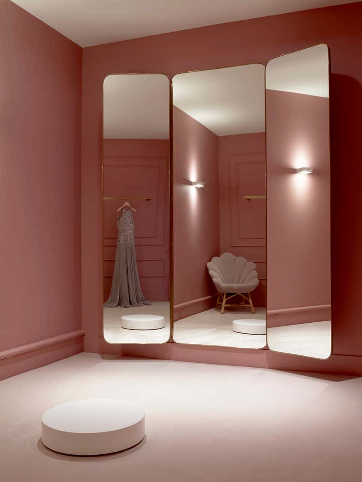 Personal, private spaces were constructed from ribbon-lined, made-to-measure dressing screens. Moda s palette of creams, cool greys and dusty peaches was allowed to build to a dramatic Art Deco pink in the dressing rooms. Bespoke lighting, furniture and accessories were all tailored to fit the space.