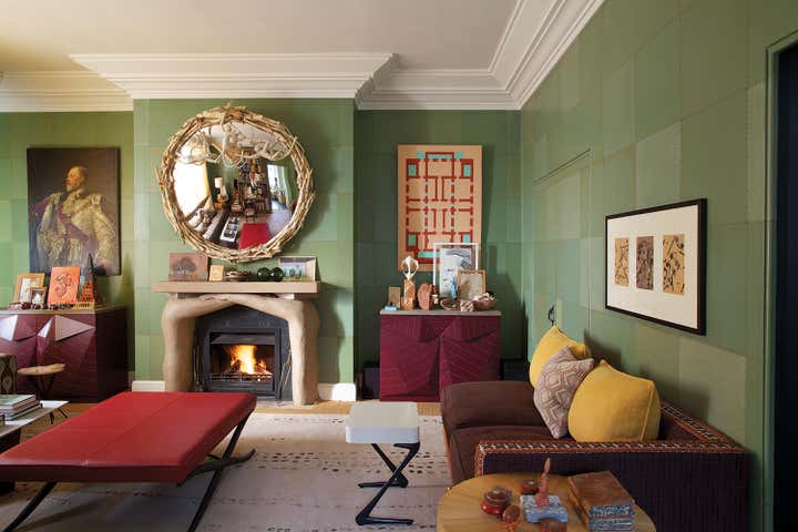 A house formed from old farm buildings in the Oxfordshire countryside. By the front door is my Mask console, inspired by an African mask. In patinated steel, with a gritstone top, on it sit children s drawings and an orange pottery Ganesh from a Jaipur market. The living room s green walls give this room a warm, cosy feeling, painted to resemble stitched squares of leather. I made both the Brothers chimneypiece in painted plaster and the convex mirror above it, a playful version of the elegant Regency ones with gilded eagles; on mine, a trio of cheeky monkeys play with architect s tools on the frame of bleached sticks. To add visual height to the long, low dining room, I devised a grisaille painted scheme of stylised Frangipani trees arching up over the ceiling, growing among boulders. The floor is in my Hicksonian cement tiles, with my Atlas dining table and Beads chairs covered in John Boyd horsehair. Fabric screens support serving tables while helping acoustically.