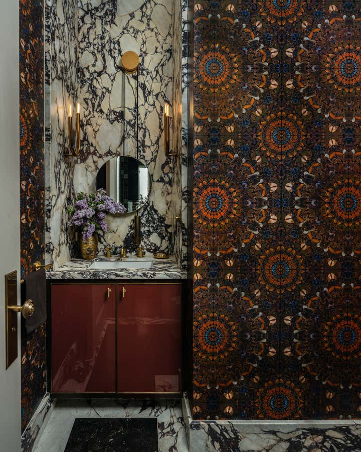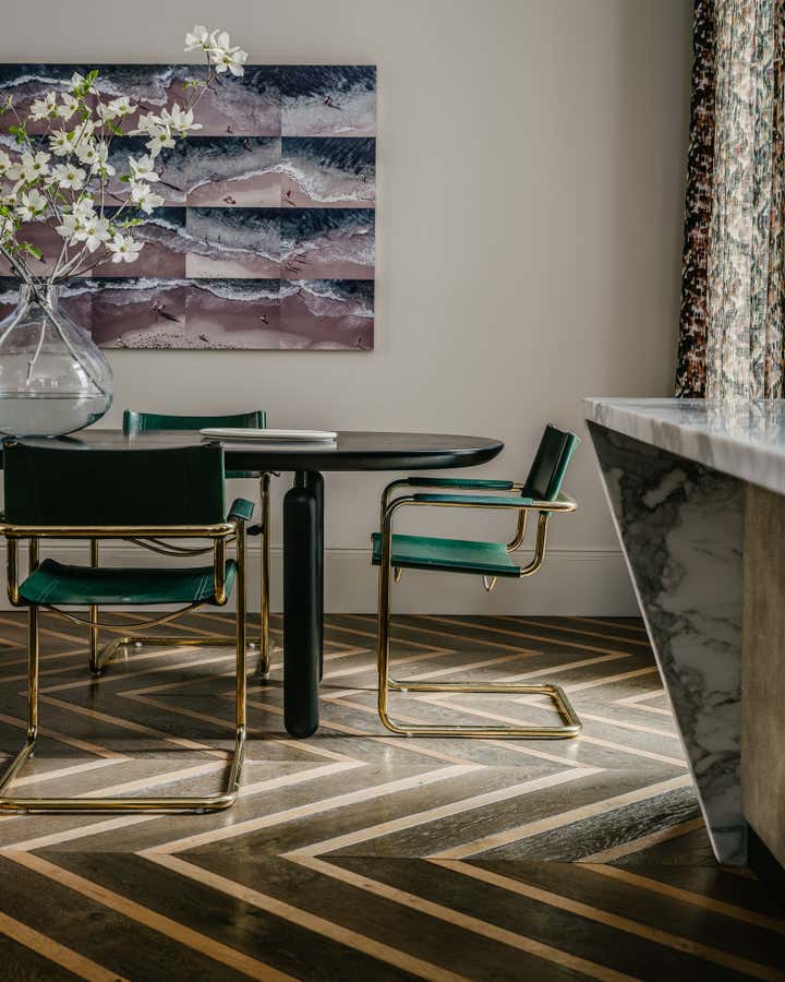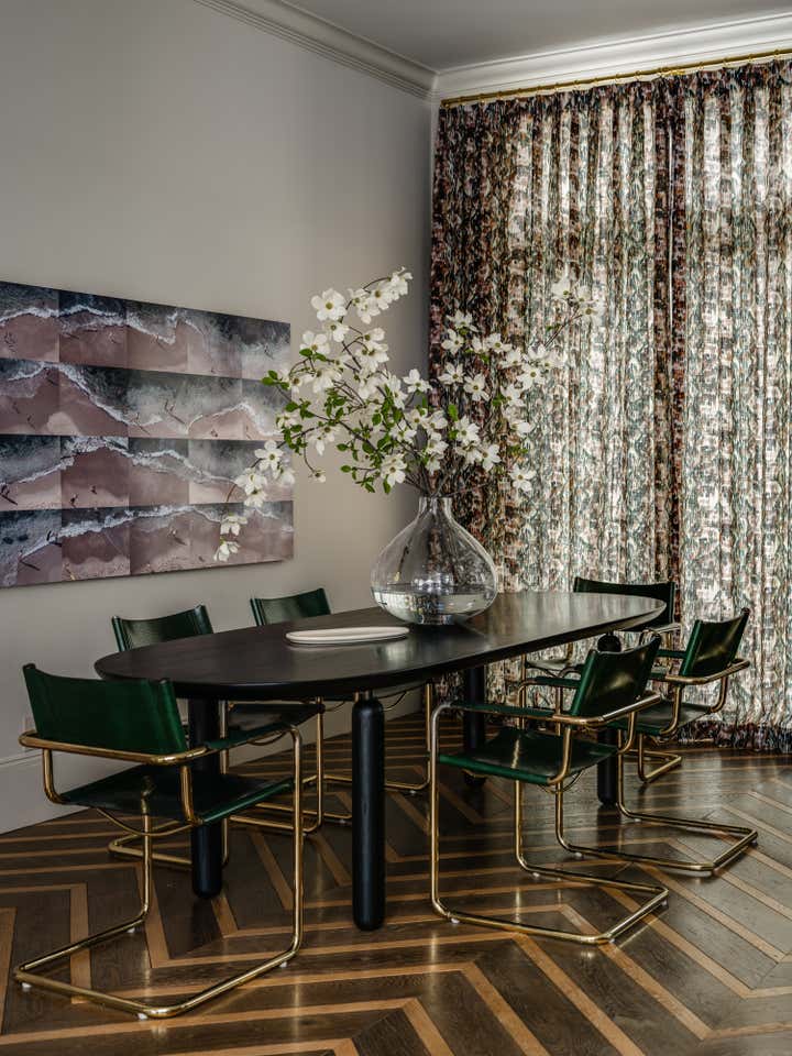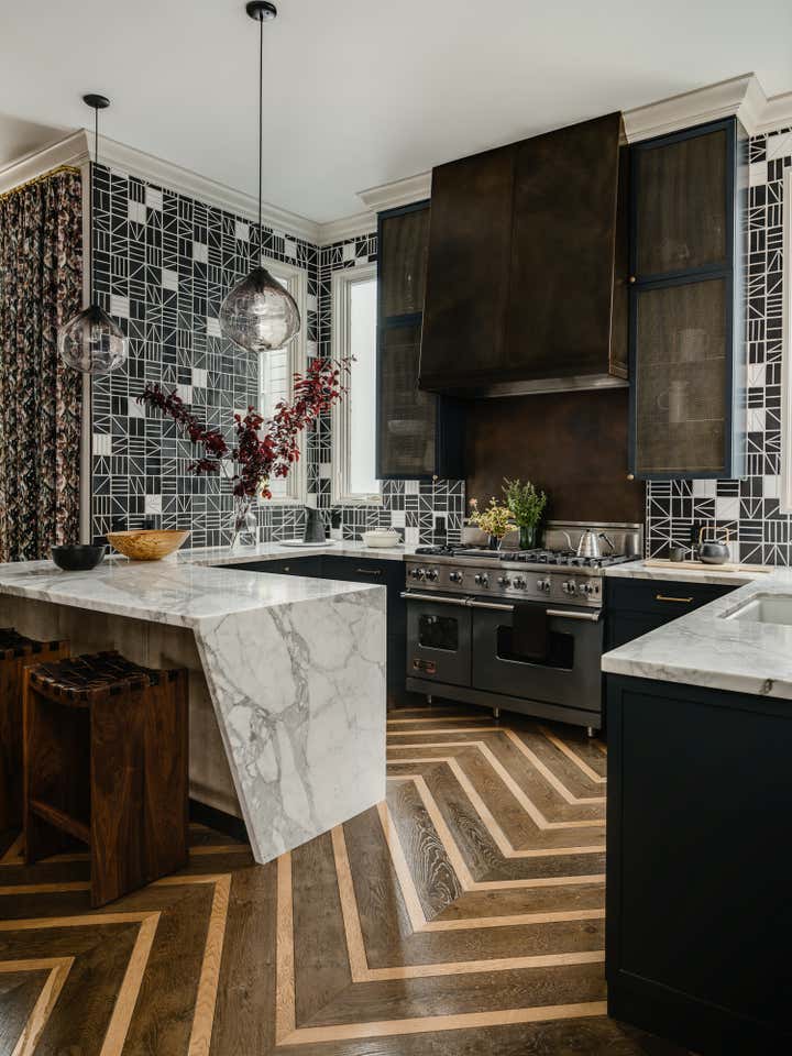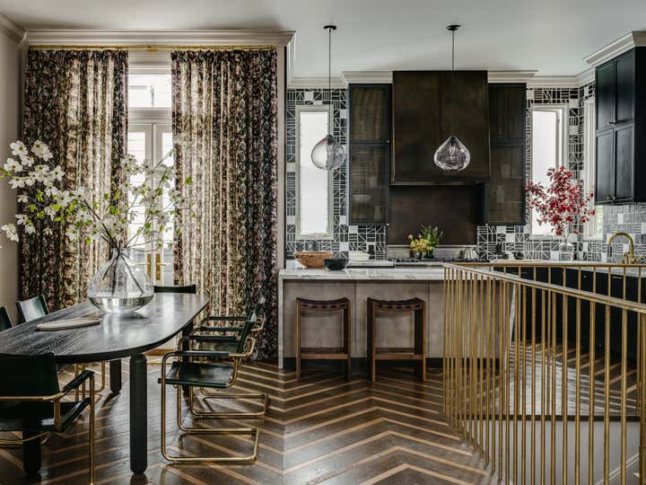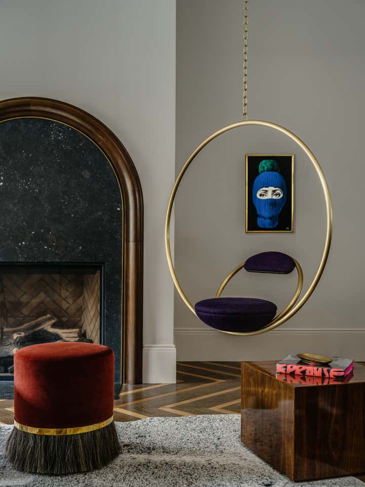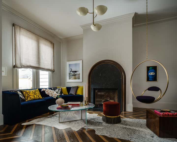 Built in 1907, this Stick-style Victorian required a down-to-the-studs remodel to better suit its occupants — a young client with an affinity for fashion, art and design, along with her infant daughter and growing family. Within the traditional envelope, JKA reimagined the interiors to integrate modern gestures, yielding a home where different eras and styles beautifully coexist. The standout elements — often bold and edgy (and now a proper reflection of the homeowner) — include chevron flooring with alternating dark and light wood, in wide and thin planks; rich jewel tones as well as luxe textiles such as mohair, velvet, and hair-on-hide; black-and-white geometric tiles paired with a burnished steel hood and white Calacatta marble in the kitchen; and a graphic floor pattern combining three types of marble (Calacatta, Nero Marquina, and Emperador) in the main bath. The result is a singular residence for a client whose playful approach is perhaps best epitomized in the brass hanging hoop chair suspended from the 11-foot tall living room ceiling.