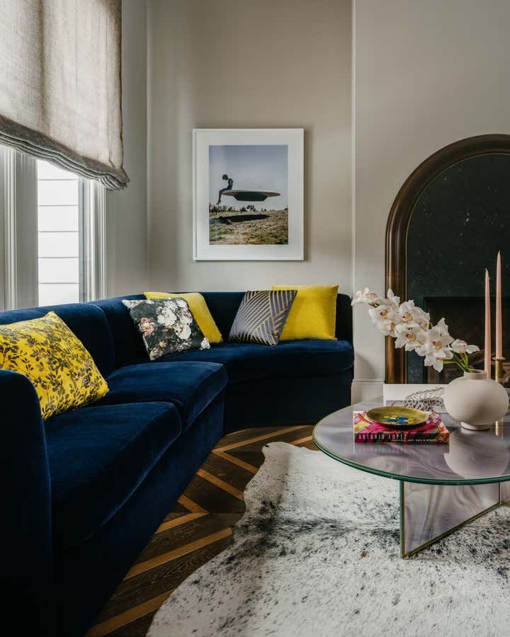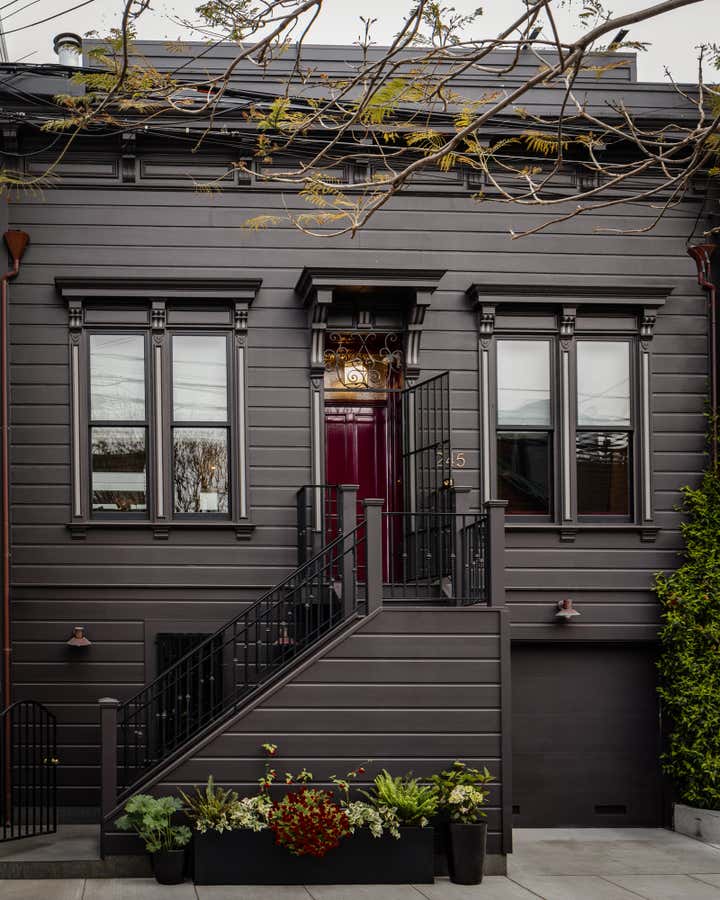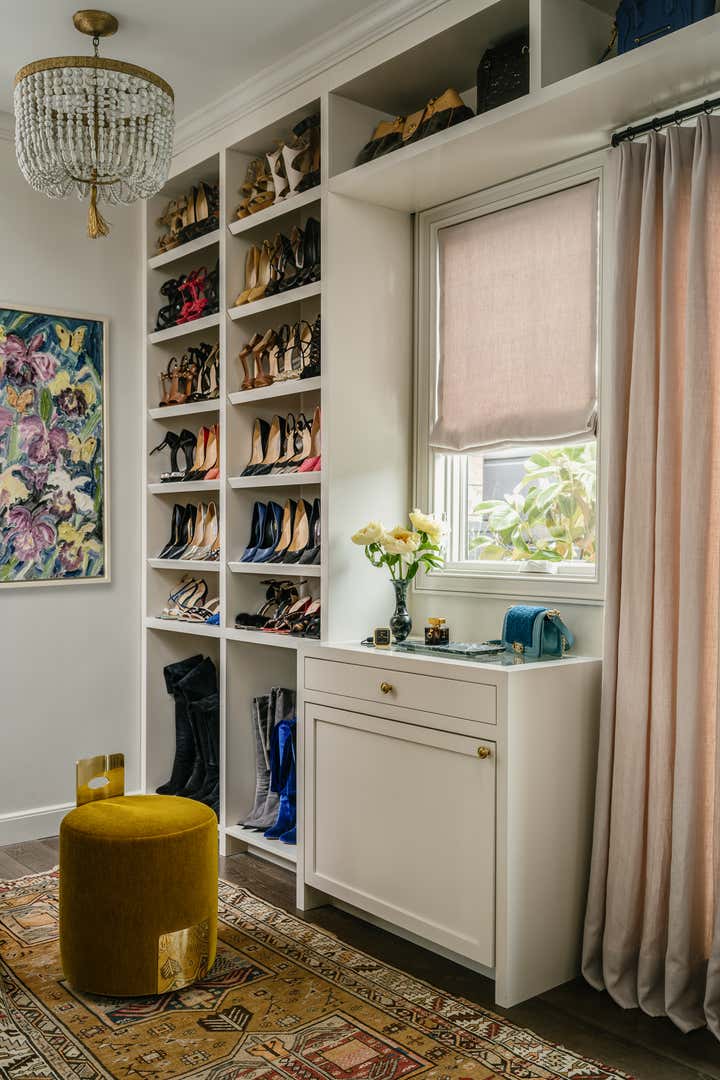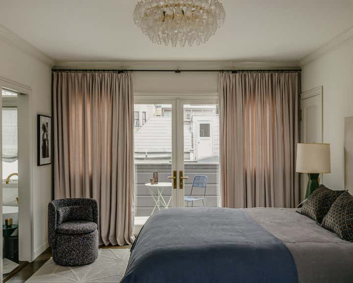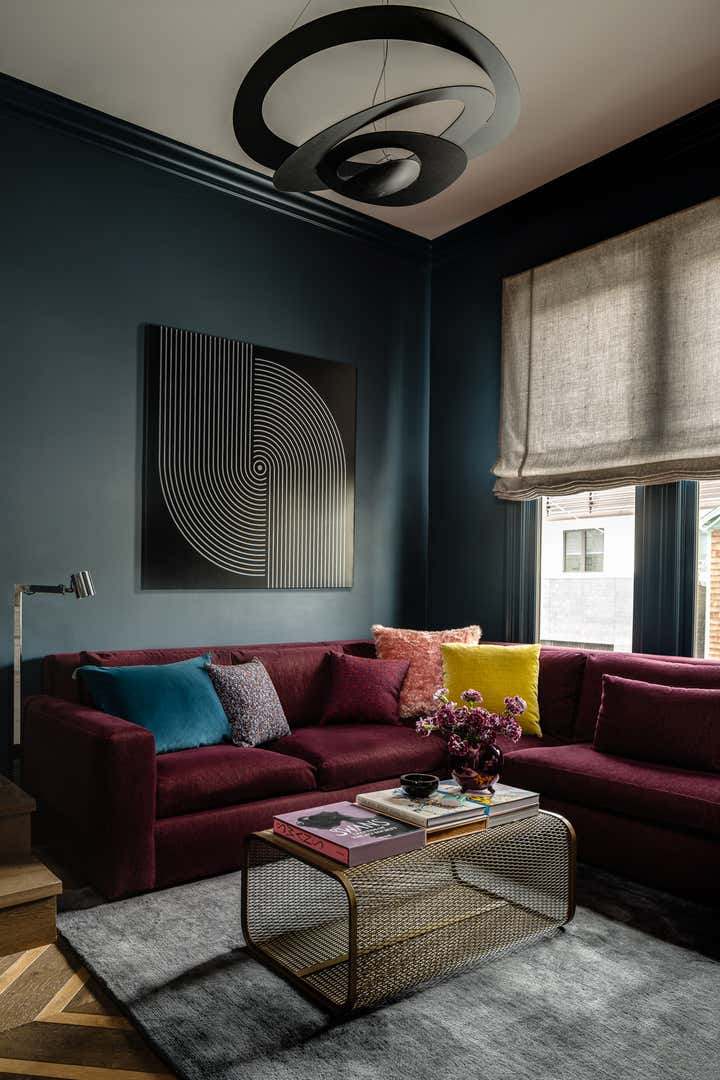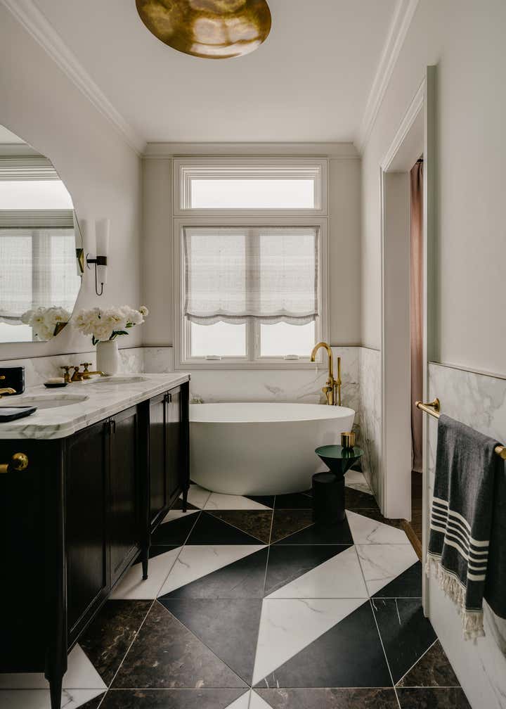 Built in 1907, this Stick-style Victorian required a down-to-the-studs remodel to better suit its occupants — a young client with an affinity for fashion, art and design, along with her infant daughter and growing family. Within the traditional envelope, JKA reimagined the interiors to integrate modern gestures, yielding a home where different eras and styles beautifully coexist. The standout elements — often bold and edgy (and now a proper reflection of the homeowner) — include chevron flooring with alternating dark and light wood, in wide and thin planks; rich jewel tones as well as luxe textiles such as mohair, velvet, and hair-on-hide; black-and-white geometric tiles paired with a burnished steel hood and white Calacatta marble in the kitchen; and a graphic floor pattern combining three types of marble (Calacatta, Nero Marquina, and Emperador) in the main bath. The result is a singular residence for a client whose playful approach is perhaps best epitomized in the brass hanging hoop chair suspended from the 11-foot tall living room ceiling.