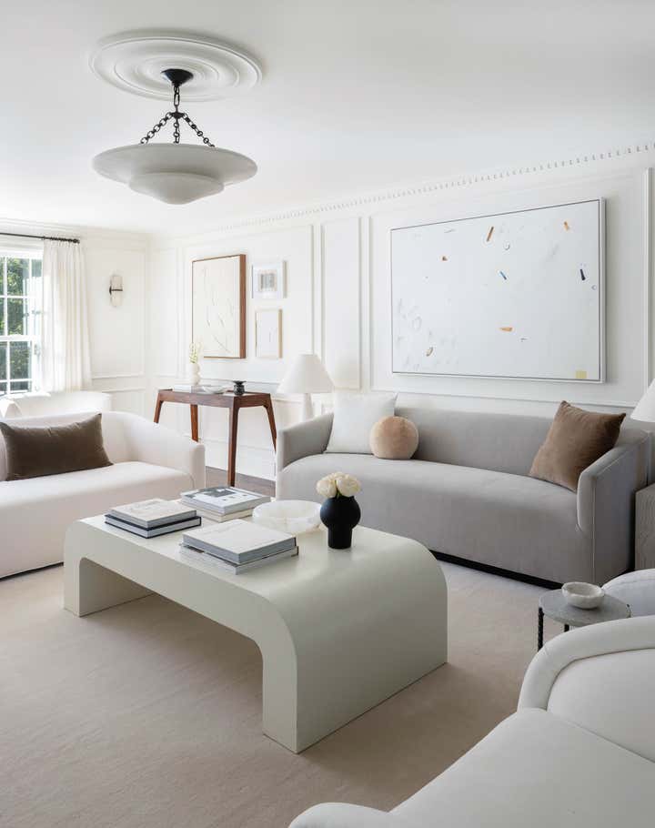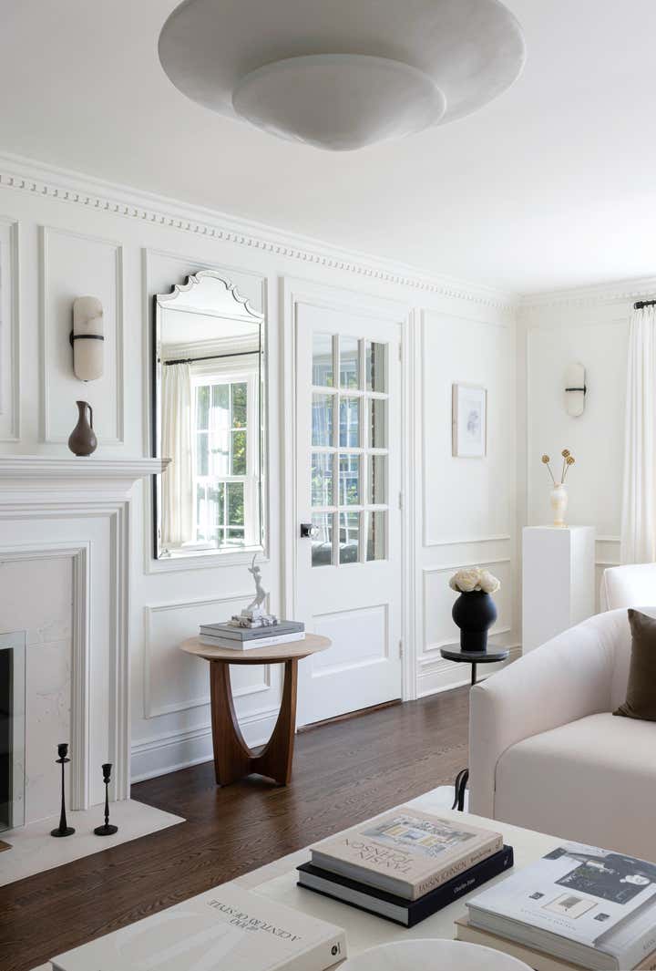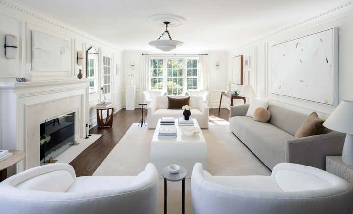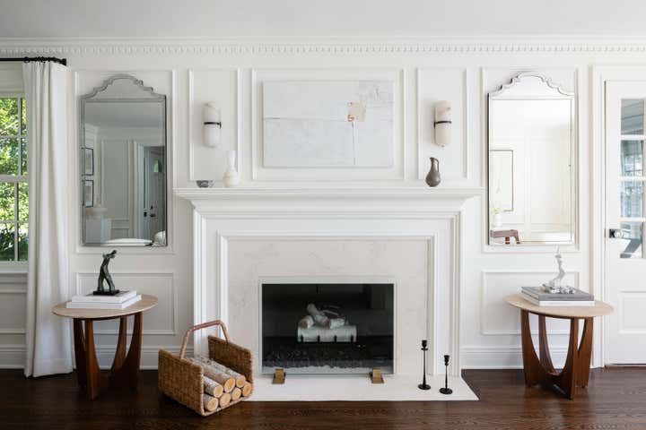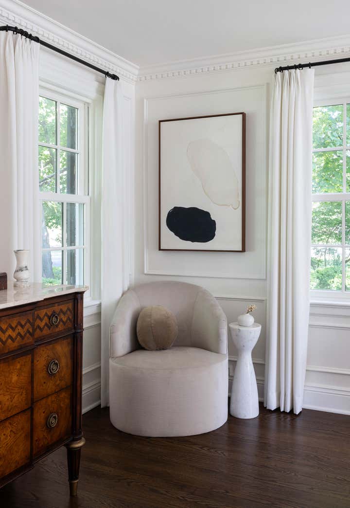 This 1940s Colonial came with great bones, but was dark and dated. It was completely redesigned to reflect the client s love of mid-century modern design through the use of curved furnishings, clean lines, and solid hues. The homeowners were able to modernize the home and add special architectural details by incorporating beautiful millwork such as dentil crown molding, panel molding, and a new wooden fireplace mantel adorned with a limestone surround. Rich textures, beautiful artwork, and unique decorative items–including vintage marble vases sourced from Europe, glazed pottery, and iron-clad accent pieces—complete the home’s refined and elegant style.