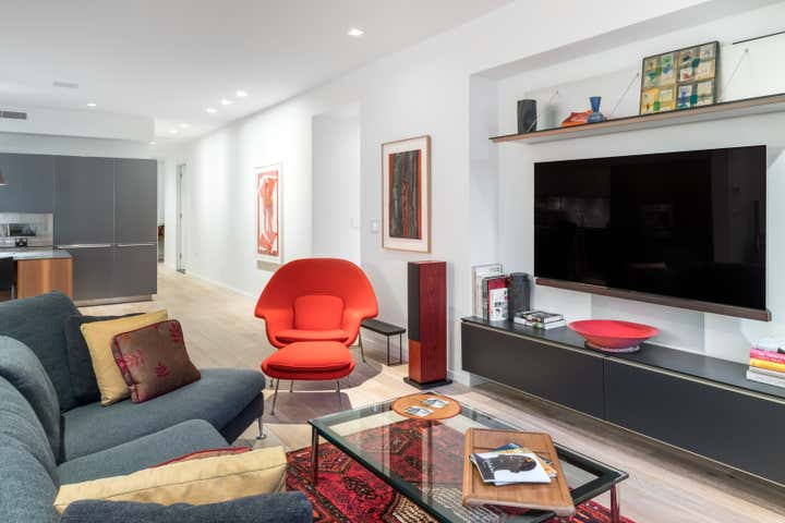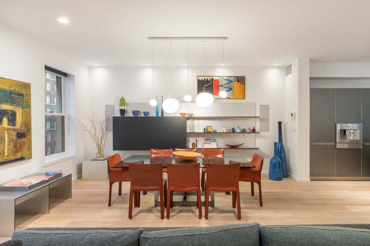 This three-bedroom apartment in Morningside Heights was transformed into a warm and inviting home, where sleek design meets practical comfort. At the core of the space is a large, open kitchen, living, and dining area designed for everyday living and entertaining. A central island, clad in warm wood, anchors the kitchen and plays off the cool, metallic finishes of the surrounding cabinetry, creating an inviting yet refined contrast.