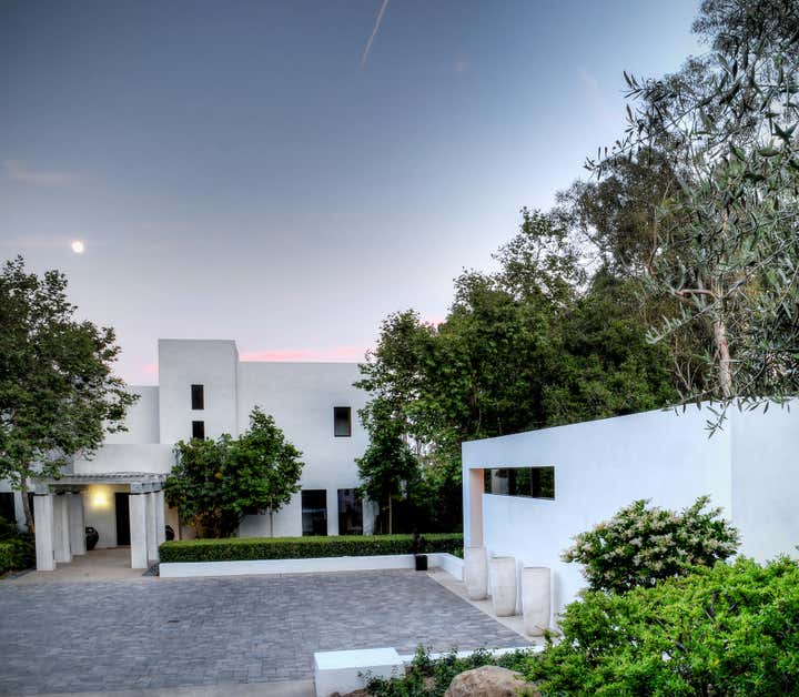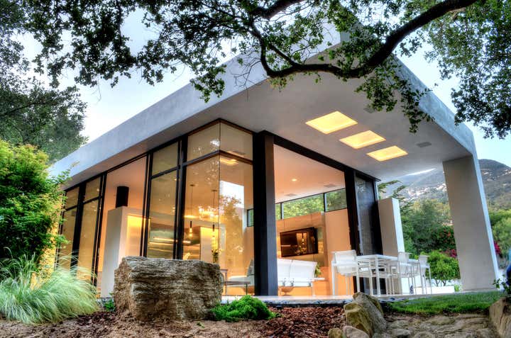 Positioned under a canopy of live oak trees, a small guesthouse makes a strong statement with simple massing and extensive operable glass walls along a natural flowing creek; distorting the barrier between interior and exterior spaces. When new owners purchased a 1988 residence in Montecito, California originally designed by our firm, they came to us with a program to add a stand-alone guesthouse on the site. Our approach was to maintain the classic modern vernacular of the main home and to also introduce unique elements to set it apart. With the property being flanked on both sides by two environmentally sensitive creeks, we chose to utilize a portion of the existing motor court to locate the guest house and minimize the environmental impact to the site. The design is very simple, yet strong. Surrounded by large oak trees, the north and west elevations are solid walls that face the driveway and motor court, while the south and east elevations are entirely glass that overlook a creek. The 800 square foot guesthouse incudes a covered exterior dining space connected to an indoor living space by sliding open the glass wall. A partial height kitchenette and storage wall separates the living space from the bedroom, and behind the bedroom is a private bathroom and laundry room. Skylights and clearstory windows along the north elevation bring natural light down from the 11-foot ceilings, and an ethanol-burning fireplace provides a comforting warmth to the living space.