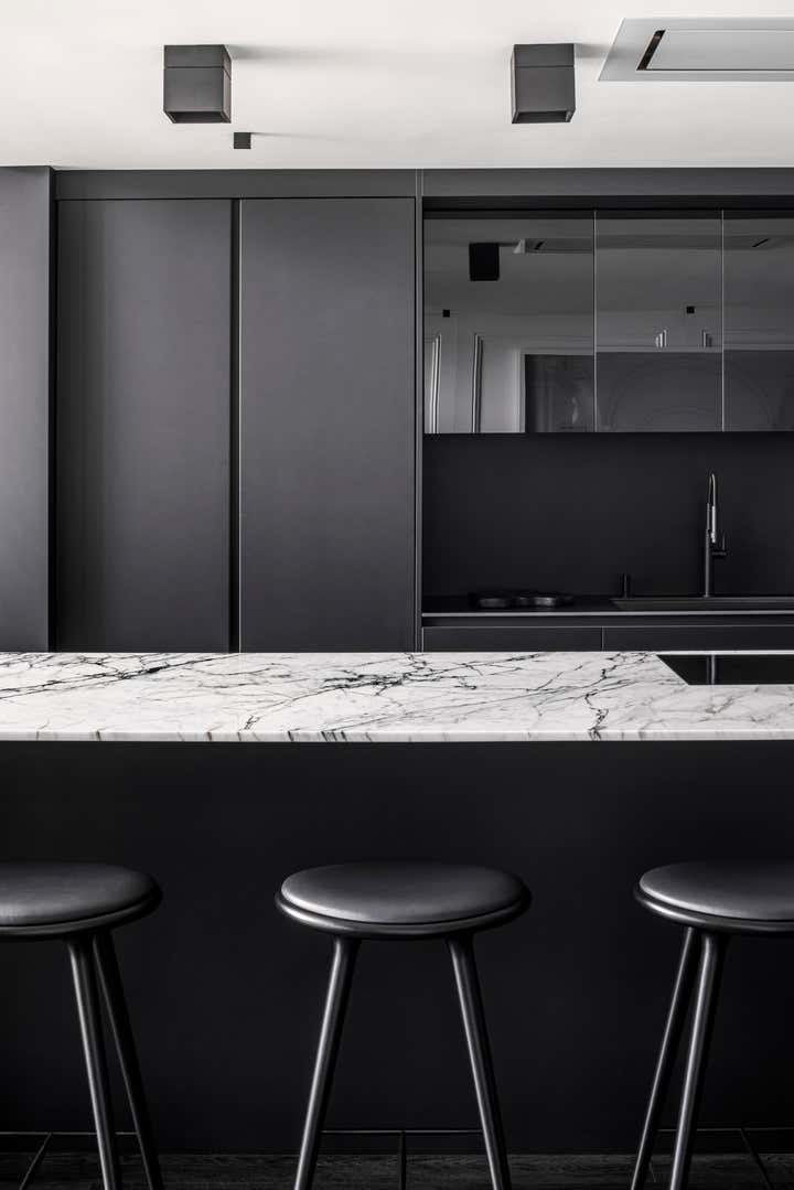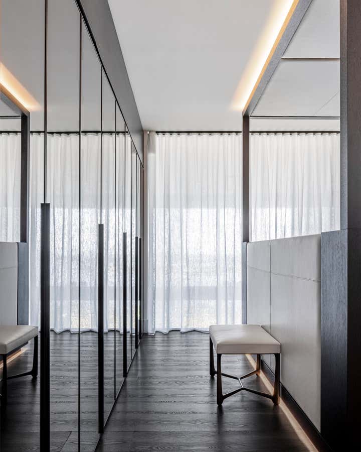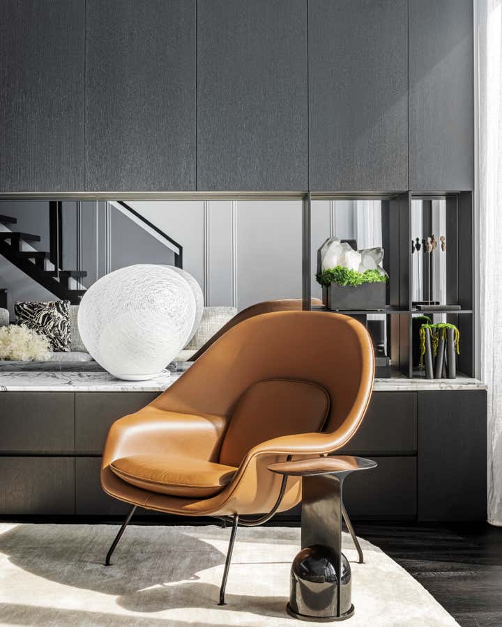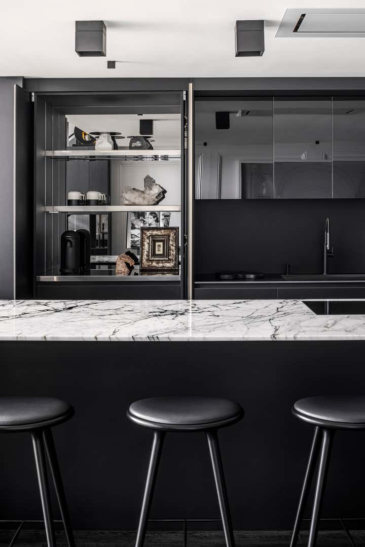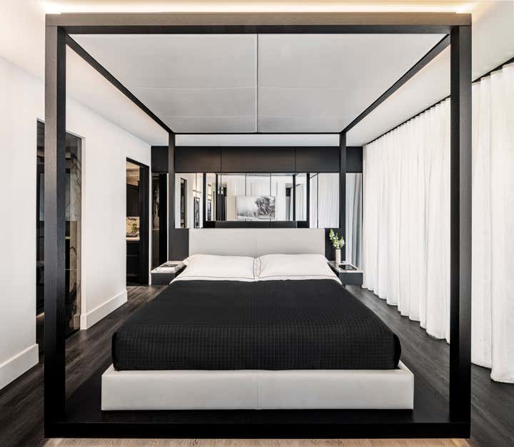 The overall design concept is a complete departure from their former home, a 1970s contemporary coastal residence in Ft. Lauderdale. The aesthetic of their new Miami interiors is a modern approach with a mix of sculptural furnishings in matte black, white and a variety of natural tones. The mood evokes a sensual sophistication inspired by their travels. Textured fabrics, marble, Parisian-style moldings and a curated selection of objet-d’art soulfully characterize the high-design of this Miami abode.
