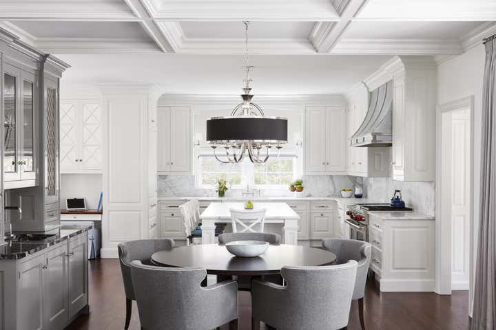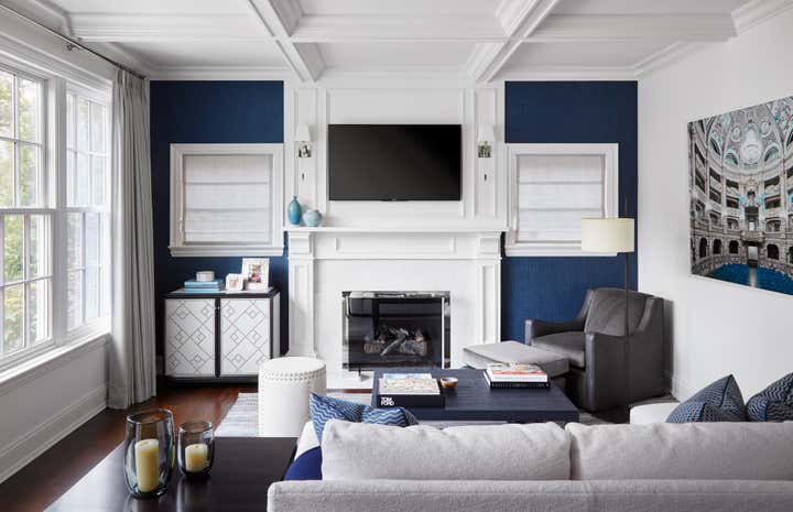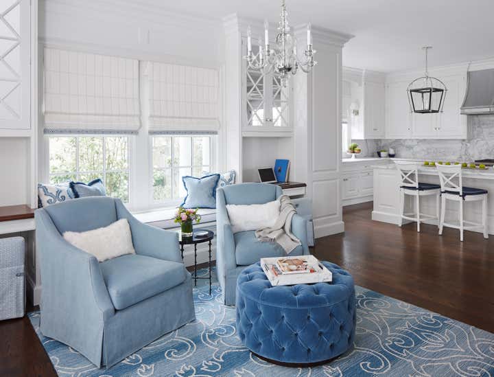 This new 2,400-square-foot bungalow in the heart of Lake Forest was designed for a family that loves to have fun. The vibrant home features lots of natural light, fresh color combinations, a kitchen fit for entertaining, large family room, and a library that the husband uses for his personal office. It also has a fantastic proper bar on the lower level with impressive deep green lacquered walls. The finishes and furnishings are all top notch, including several pieces from the Frank Ponterio for Lee Jofa collection.