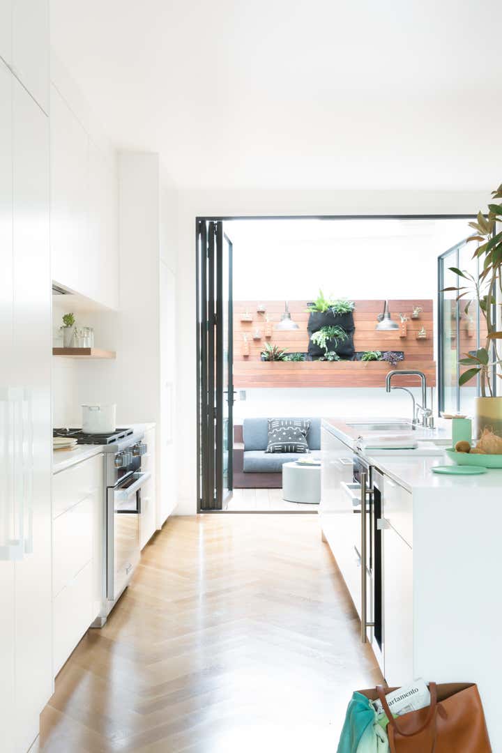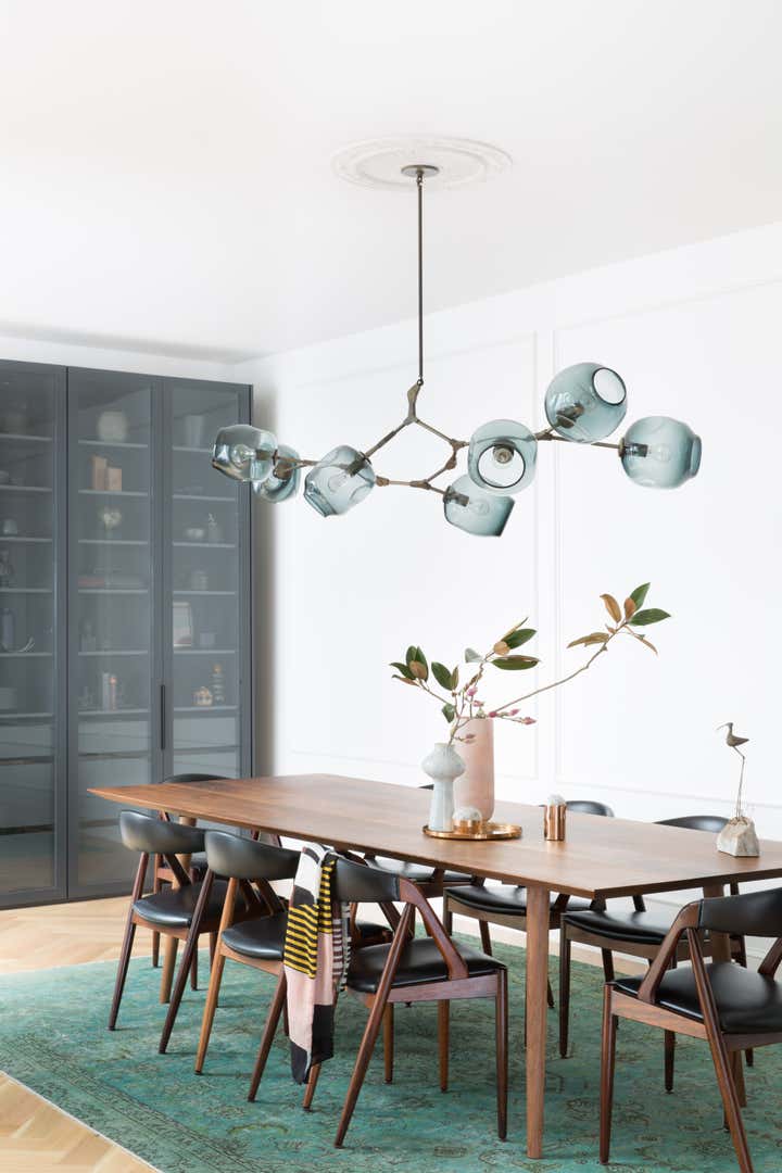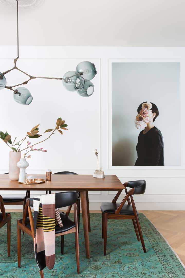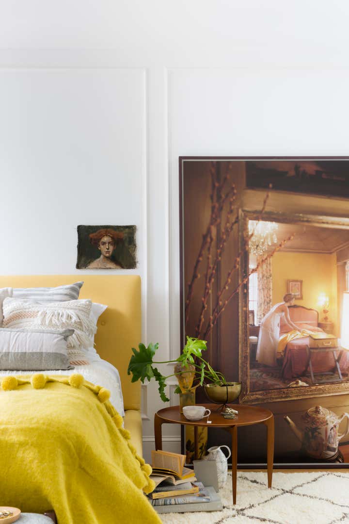 Originally built in 1906, this Noe Valley home features many of the iconic architectural details found among San Francisco’s storied Victorians. In our design approach, we wanted to honor these traditional aspects while making the space more modern and inviting for our client—a fashion-forward editor—and her young family. The finished space balances artful edginess, warm minimalism, and subtle European influence, allowing our clients to live la vie en rose in the city by the bay. Throughout the home we opted for modern interpretations of more traditional elements. We chose Parisian-inspired herringbone flooring throughout, but selected a cleaner, more-updated light finish. We installed traditional panel molding, but exaggerated the scale for a more contemporary feel. Black window frames recall turn-of-the-century industrialism, but the bold contrast they lend to the space keeps them fresh. Opening up the floor plan brought light and functionality to the first level of the home. A minimalist white kitchen provides a quiet backdrop for refined, mid-century furnishings in the adjacent living and dining areas. Darker upholstery and medium wood tones maintain an edgy contrast against crisp white walls, while daring hits of yellow and oversized art pieces bring the ultimate atelier vibe to the space.