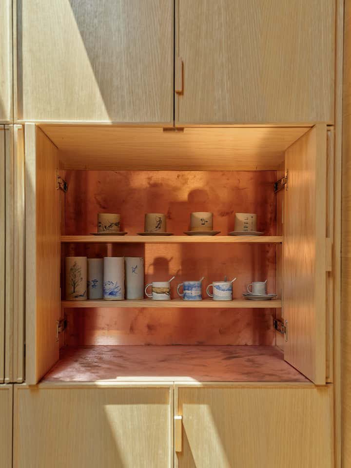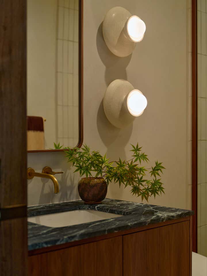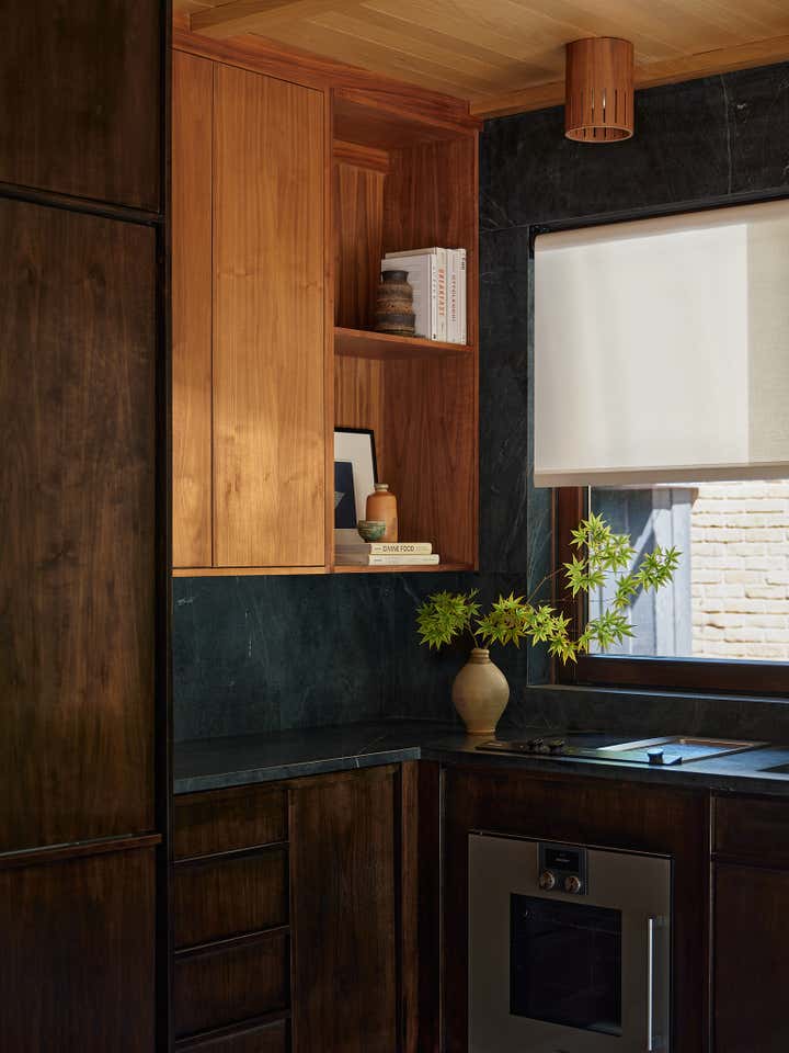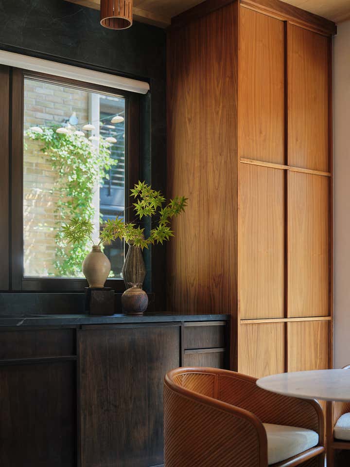 The studio helped our long-time client conceive this backyard retreat which serves as a guest house, office, and gym. The house’s exterior is clad in shou sugi ban charred Japanese cypress creating a dramatic contrast to the verdant landscaping. Inside, an inspired mix of natural and ebonized white oak and walnut walls, ceilings and millwork, creating a soulful pattern play, while honed marble countertops, elegant plaster walls, and un-lacquered brass hardware inject an elegant earthiness into the rooms.