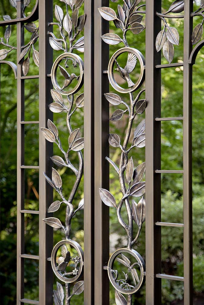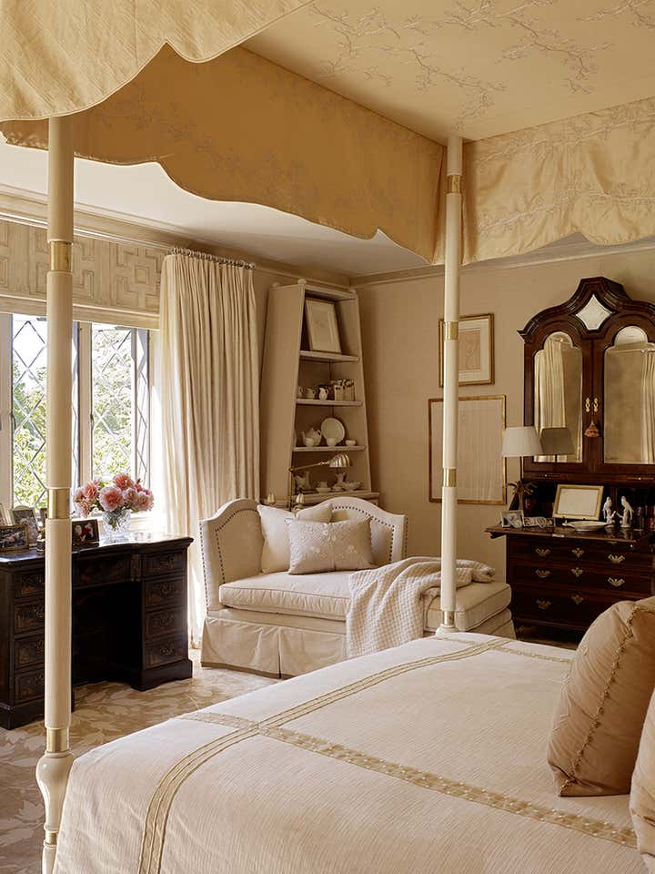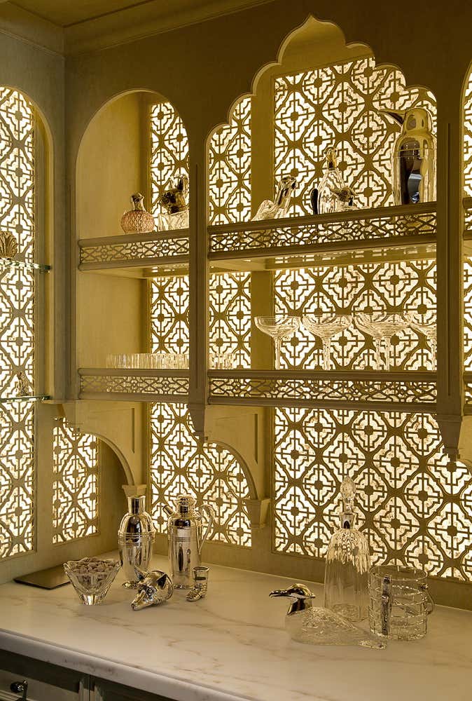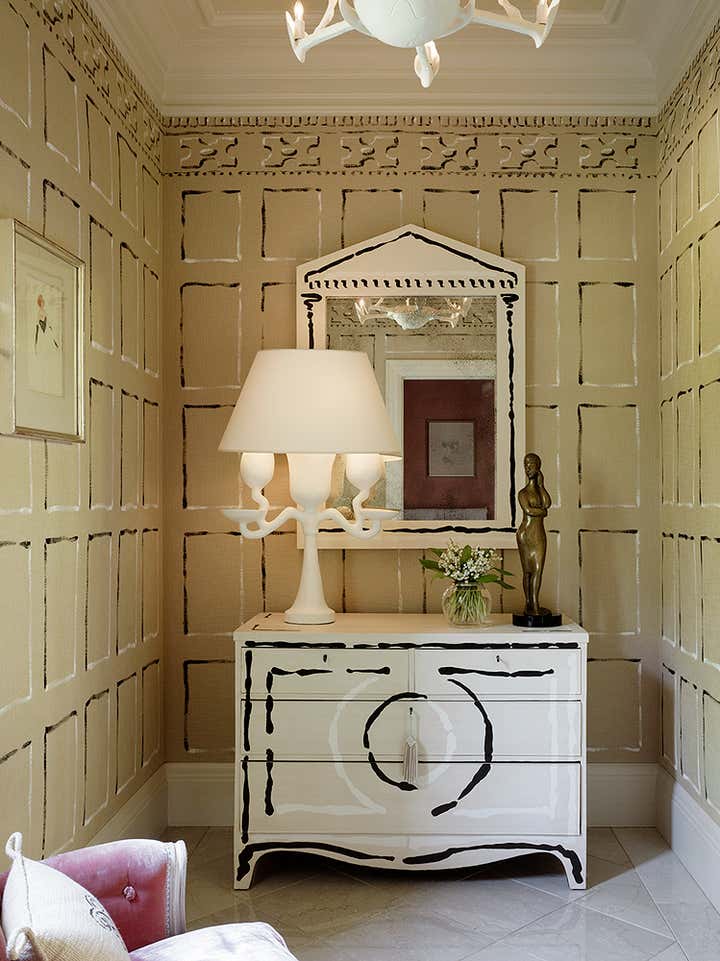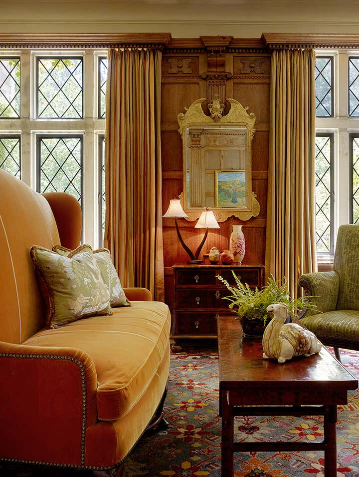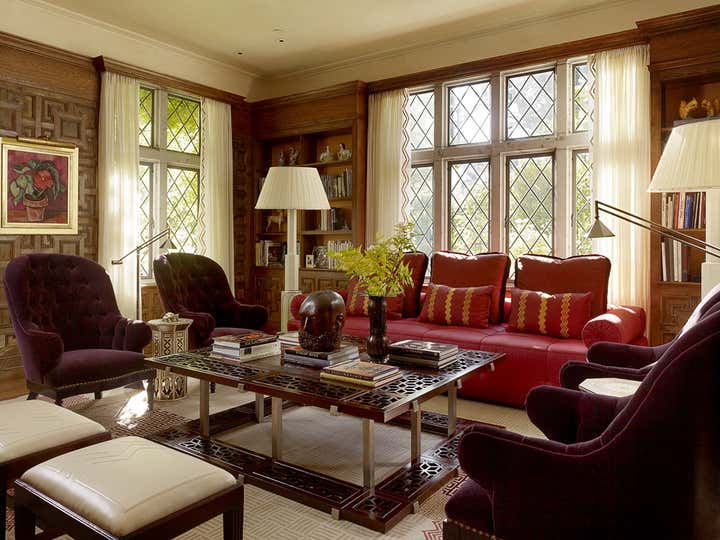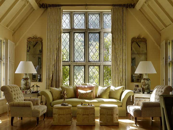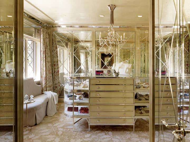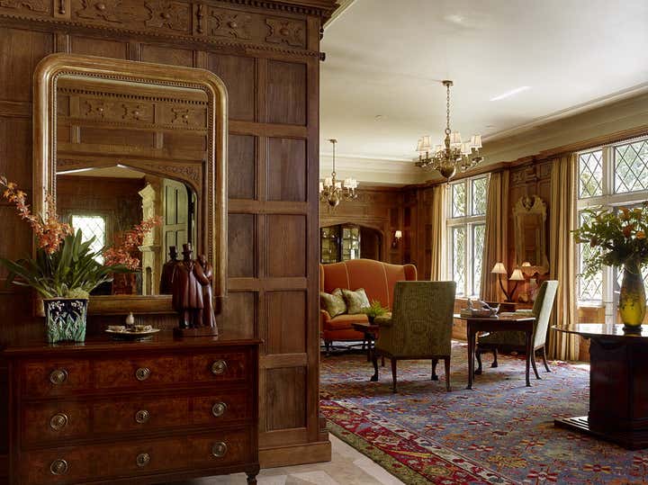 Long-time, adventurous clients continually design and update the interiors of this Tudor Revival house. Set amidst five acres of lushly planted gardens, it evokes the warmth and charm of an English country manor, with diamond-paned windows, seventeenth-century linenfold paneling, and carved oak fireplaces imported from England. The goal was to give the existing furnishings more emphasis, updating their color, scale, and texture for a stronger sculptural presence within a classical setting coupled with modern art. Our interior architecture department reconfigured the master suite. The crown jewel of the design was the wife’s dressing room. Elements like mirrored crown moldings, silver-leafed pilasters, antiqued mirrored walls, and a custom designed vitrine make the space glamorous and luxurious.
