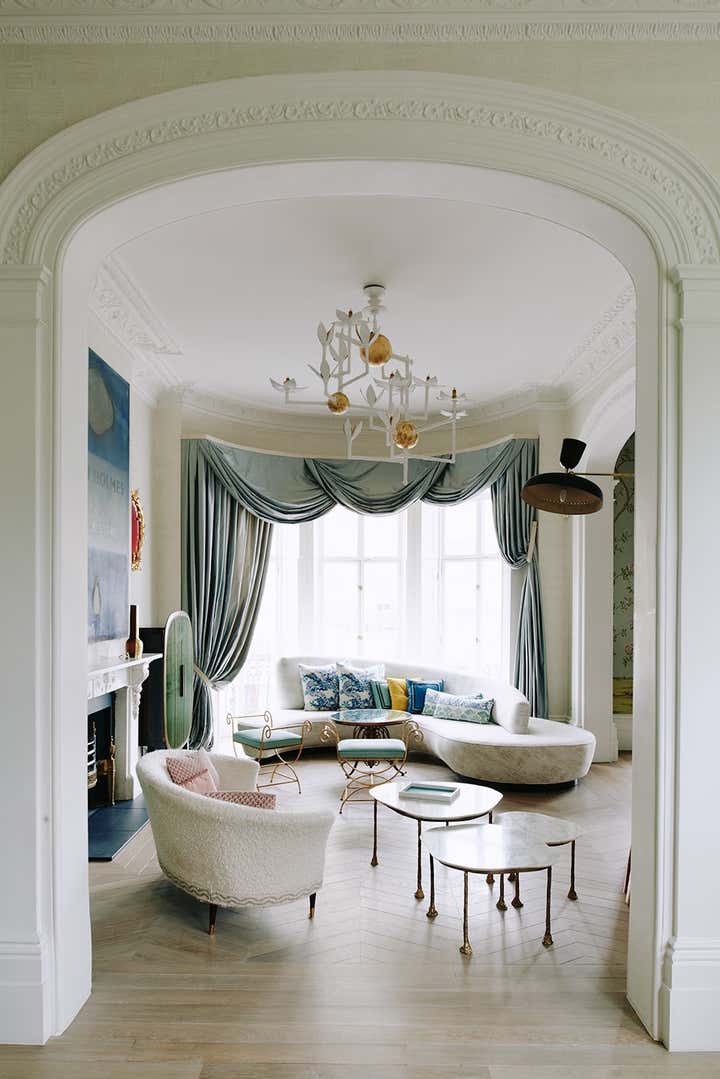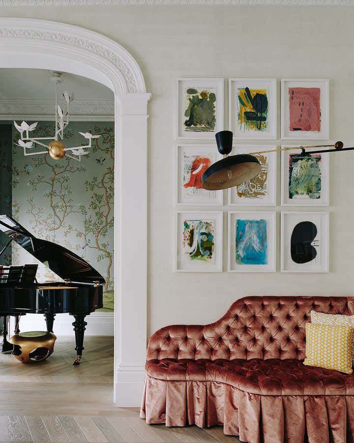 This Grade II listed terraced house in Notting Hill, London, was designed and built in the mid-1840’s. Many of the interior features, such as the arched openings, the ornate cornices, the cast iron balustrade and stone staircase seen in the entrance hall, are original, and have been preserved and restored. Having worked with these clients on previous refurbishment projects in London and New York, this project was an amalgamation of the many important collectable pieces we had acquired for the previous projects. The palette was deliberately chosen to combat the persistent grey London skies, keeping the walls textured but light, with accents of bright colour in the furniture and furnishings throughout the house. The client’s love of marble was the basis for the creation of a luxurious master bathroom and a striking marble kitchen island. We were fortunate to acquire many special pieces for these clients; a particular favourite is the custom sofa designed by Vladimir Kagan.