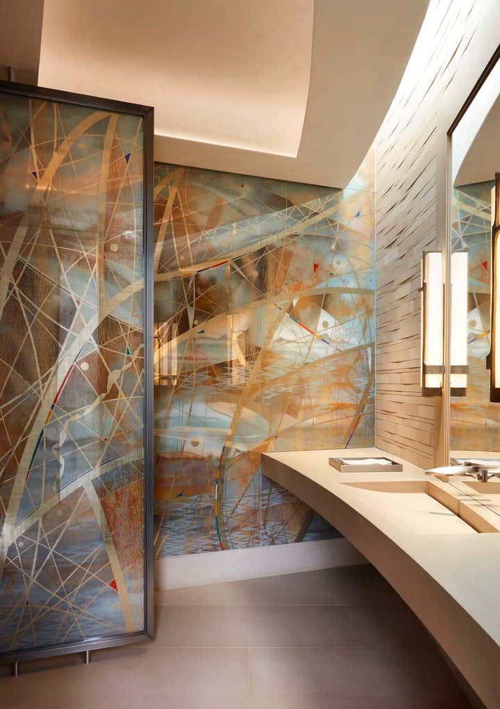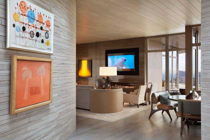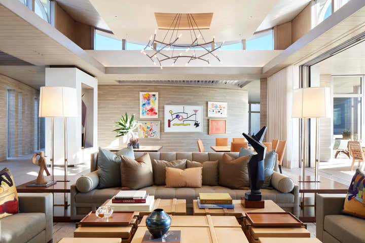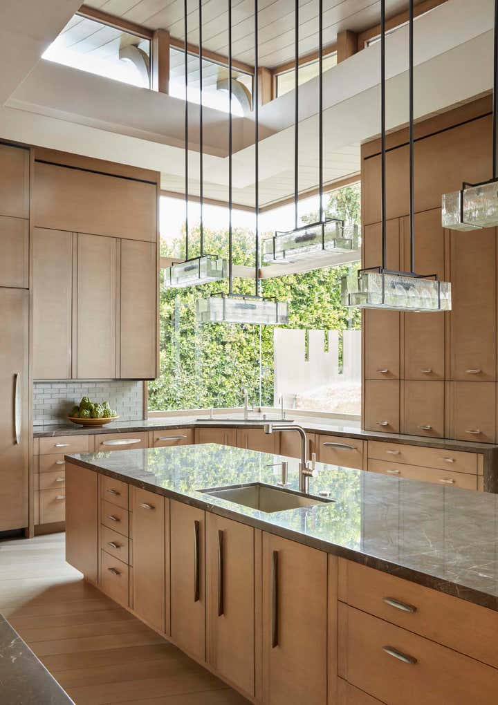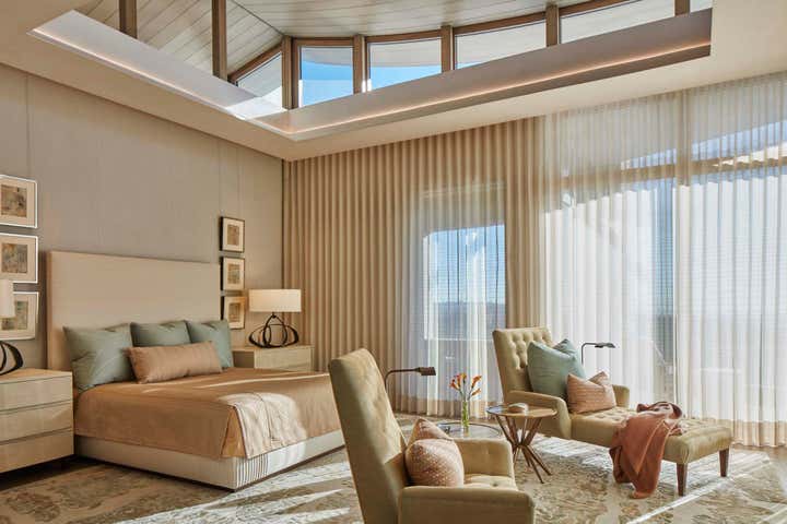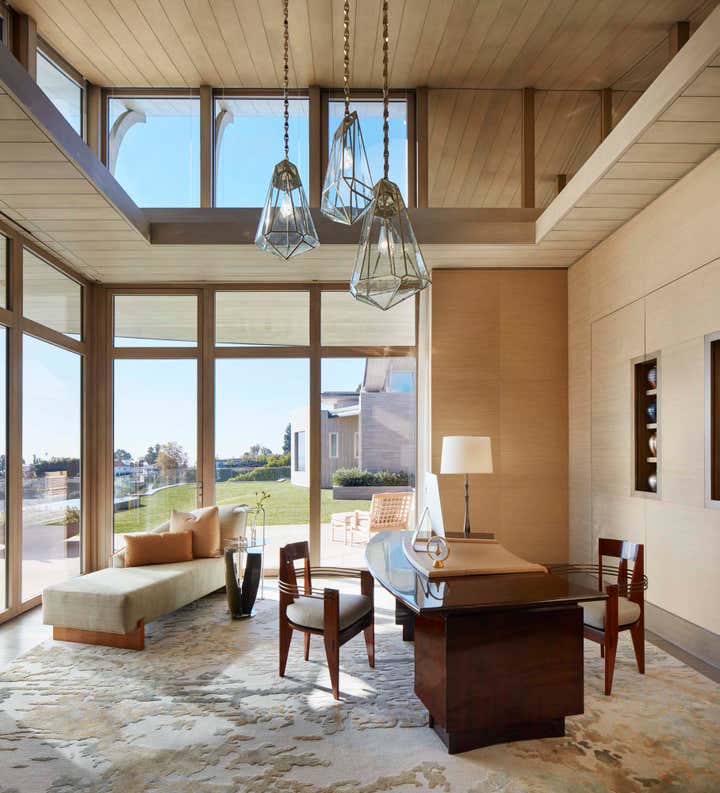 This contemporary residence in Southern California is a unique structure composed of curved limestone walls, which are combined with orthogonal walls composed of Western red cedar. Thoughtful consideration went into each detail - the brick pattern of the cast-glass front door mimics the brick pattern of the limestone, custom hand-woven sheer curtains align with the height of the baseboards, hand-painted Eglomise panels act as a privacy screen, and a series of custom wool and silk carpets throughout compliment the design.