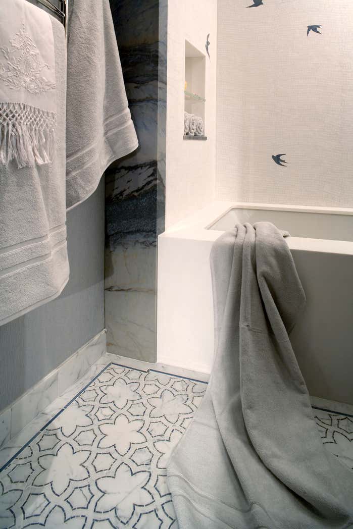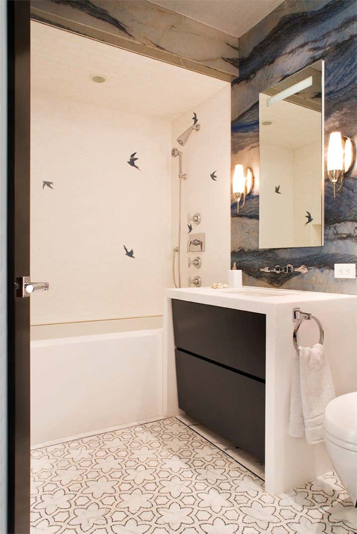 The IDI Design Team was hired to remodel a nursery bathroom inside a New York Penthouse. The clients wanted to ensure the bathroom did not feel like a baby s bathroom and that it would grow with their child. The floors and shower walls were done in water jet mosaic, full slabs were used for the vanity and exterior shower walls. Custom cabinetry, new plumbing, medicine cabinet and lighting were part of the scope of work.