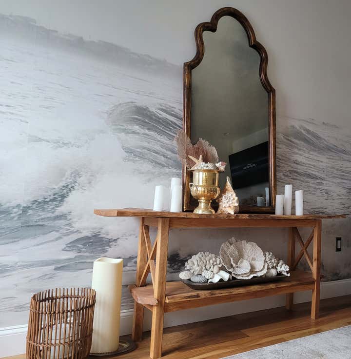 Every beach house owner hopes to have amazing beach views. Unfortunately not everyone has that luxury, so we were looking to create that feeling in a big way. When you are in the room, you often find yourself staring out at the surf. It s not the real thing, but it s a great substitute.