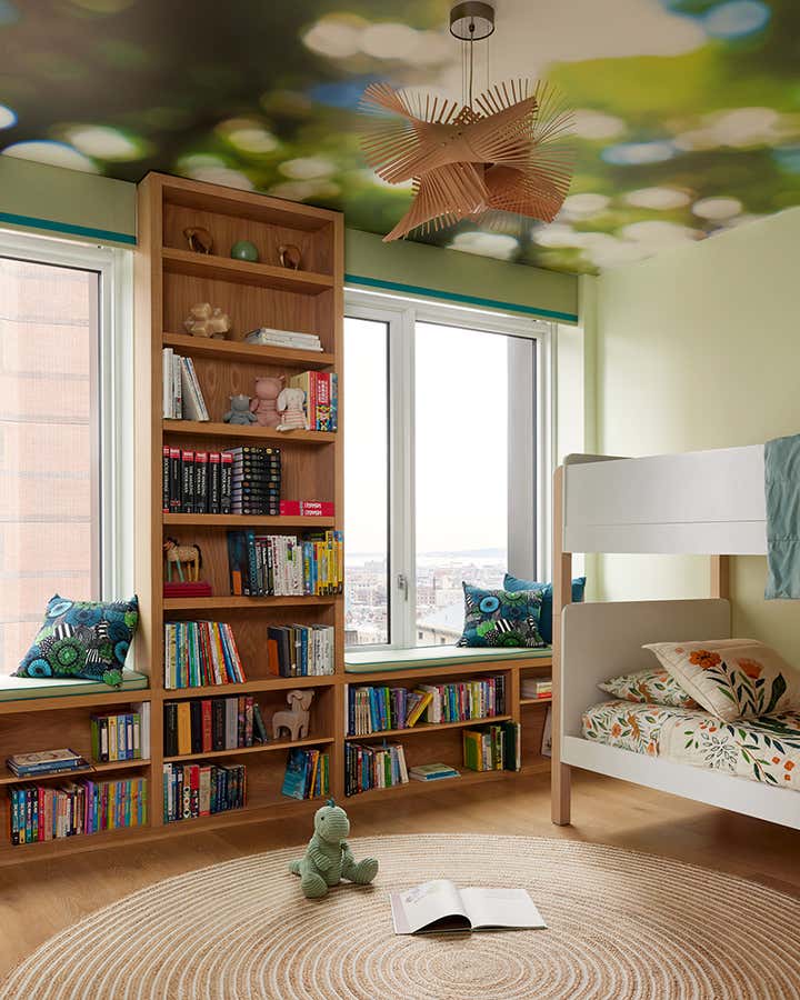 Bespoke bookcase and window seats designed by Laurie Blumenfeld Design make the perfect spot for the kids to read a favorite book. Flavor paper on the ceiling to creates a moody jungle vibe.
