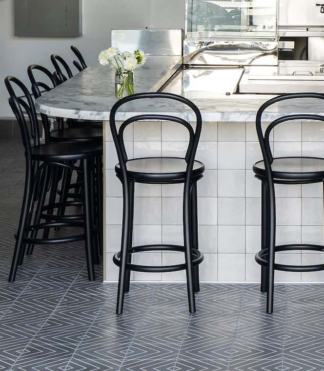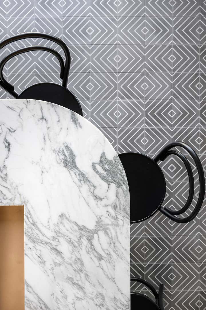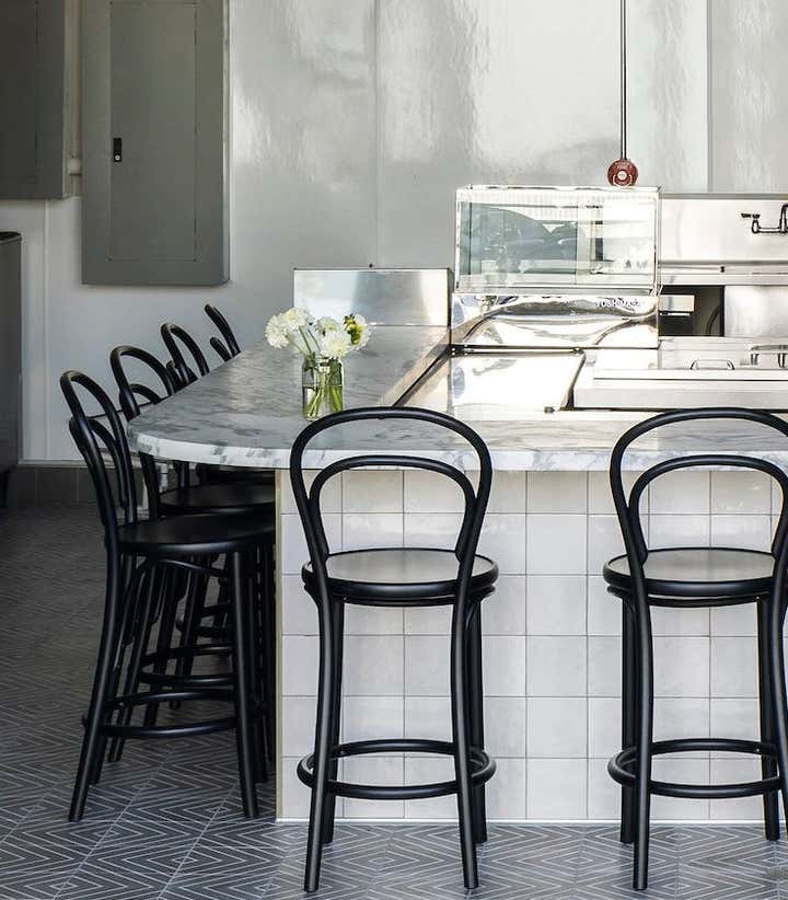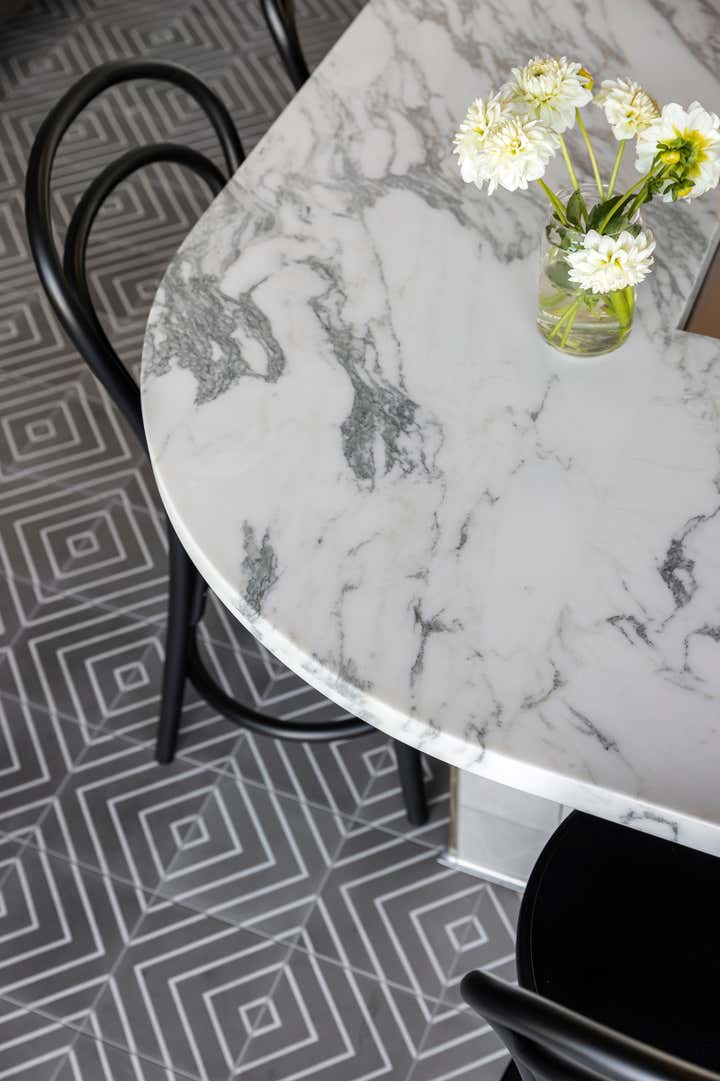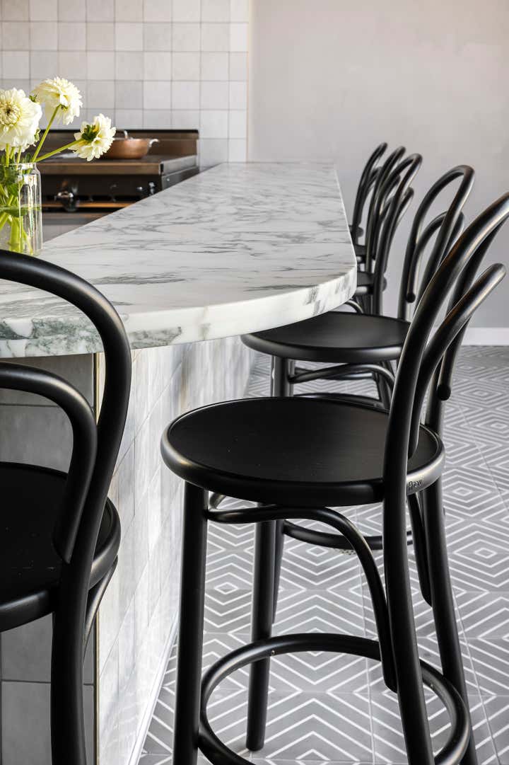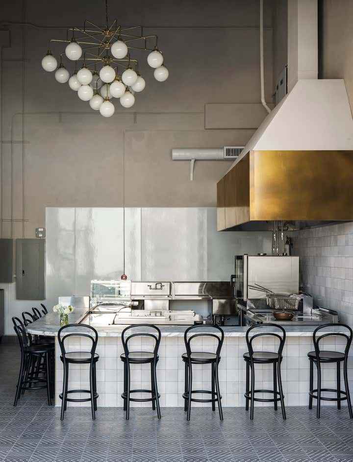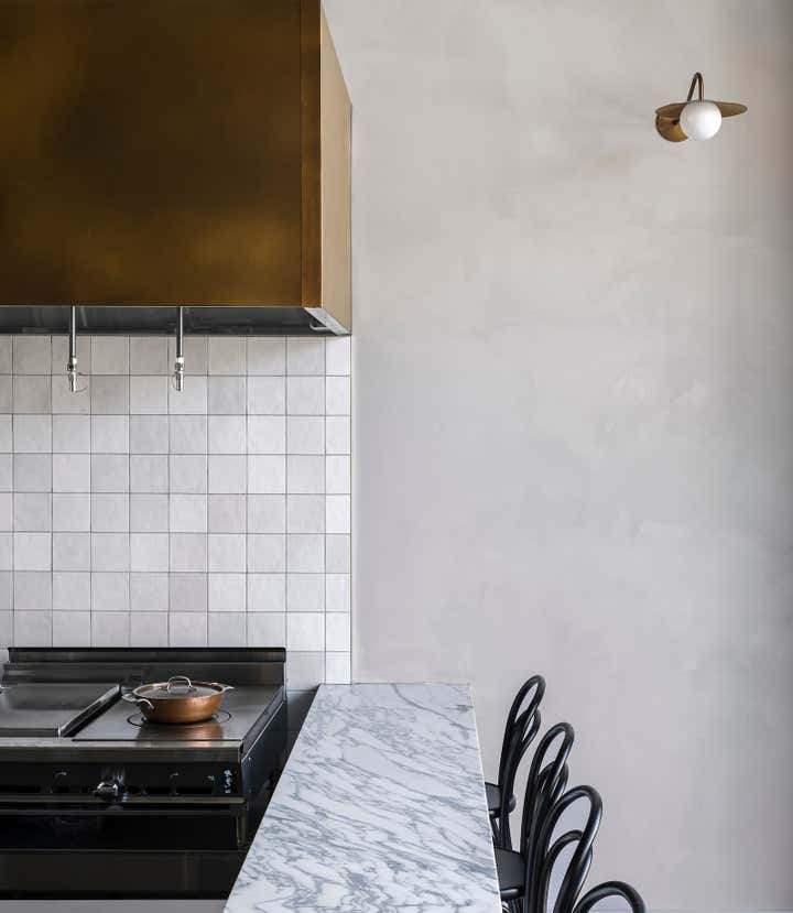 Paris bistro meets California. We wanted the space to feel lived in, yet modern. A pretty space to enjoy vintage champagne and oysters. We used lime washed paint on the walls, patina brass on the extractor hood, bold marble counter tops, classic 4x4 white bistro wall tiles and a modern patterned tile on the floor. The oversized pendent light is without doubt a focal point.