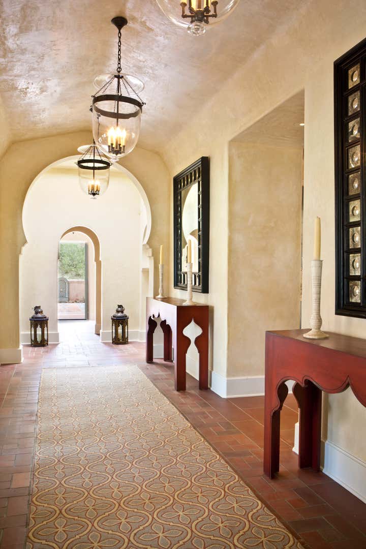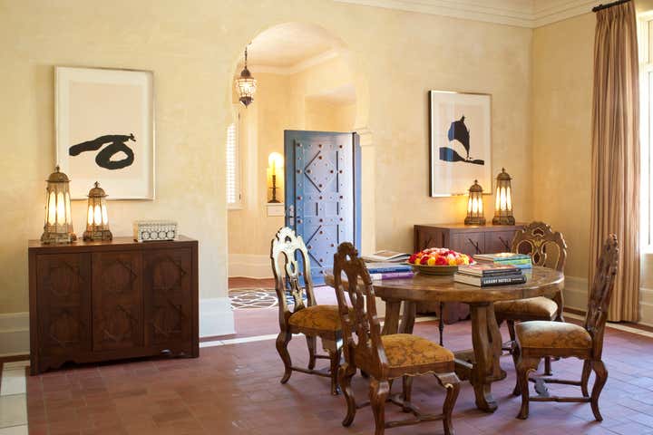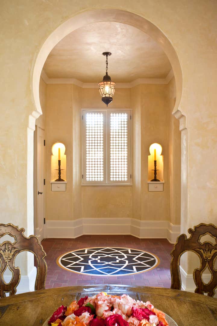 Inspired by a trip to Morocco, our clients hired Los Angeles-based architects Tichenor Thorp to design a getaway in the desert near Palm Springs. We worked closely with the architects to incorporate luxurious details that play off the house’s happy blend of modern lines and antique forms. The clients requested a luxurious, “dressed up” atmosphere—unusual especially for laid-back Palm Springs. Indian red limestone floors have different tile patterns in every room. Textiles in warm colors and textures are incorporated throughout; most notably with the enormous Oushak rug that anchors the living room. In the combined living/dining room, a hanging constellation of lanterns that the clients brought home from Morocco fills the tall volume and adds visual interest. While Moroccan in style, many of the decorative elements in the house were actually sourced from India. Indian sandstone with a black and white marble inset sets the tone in the entry hall and red Indian sandstone was also used to frame the pool, which is fed from a white marble fountain, also from India. Throughout the home styles are mixed and assembled to create an exotic, yet refined tone: The walls are finished with Venetian plaster, white lacquered "mache arabaia" grills cover some of the windows and Portuguese and Moorish details live side by side.