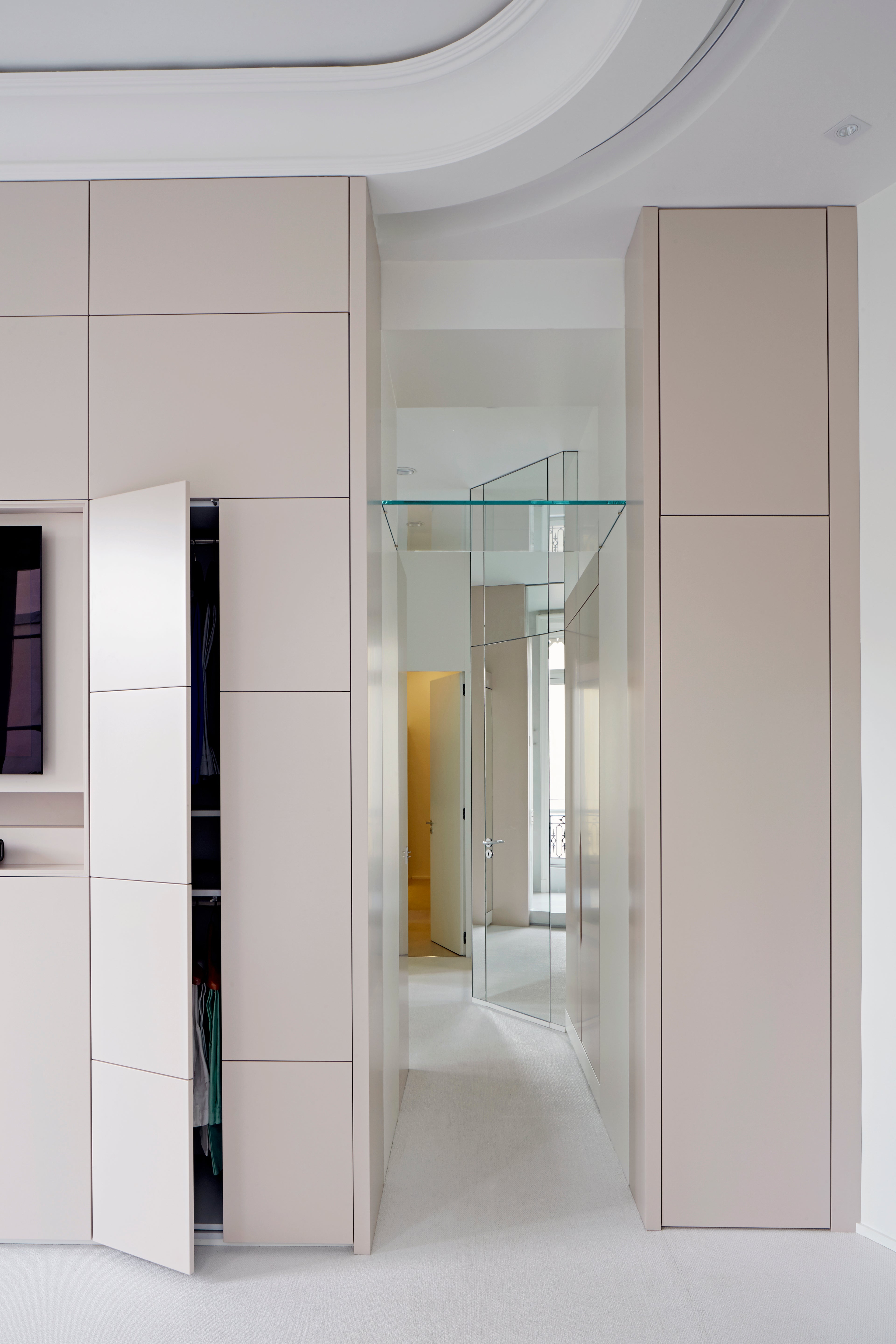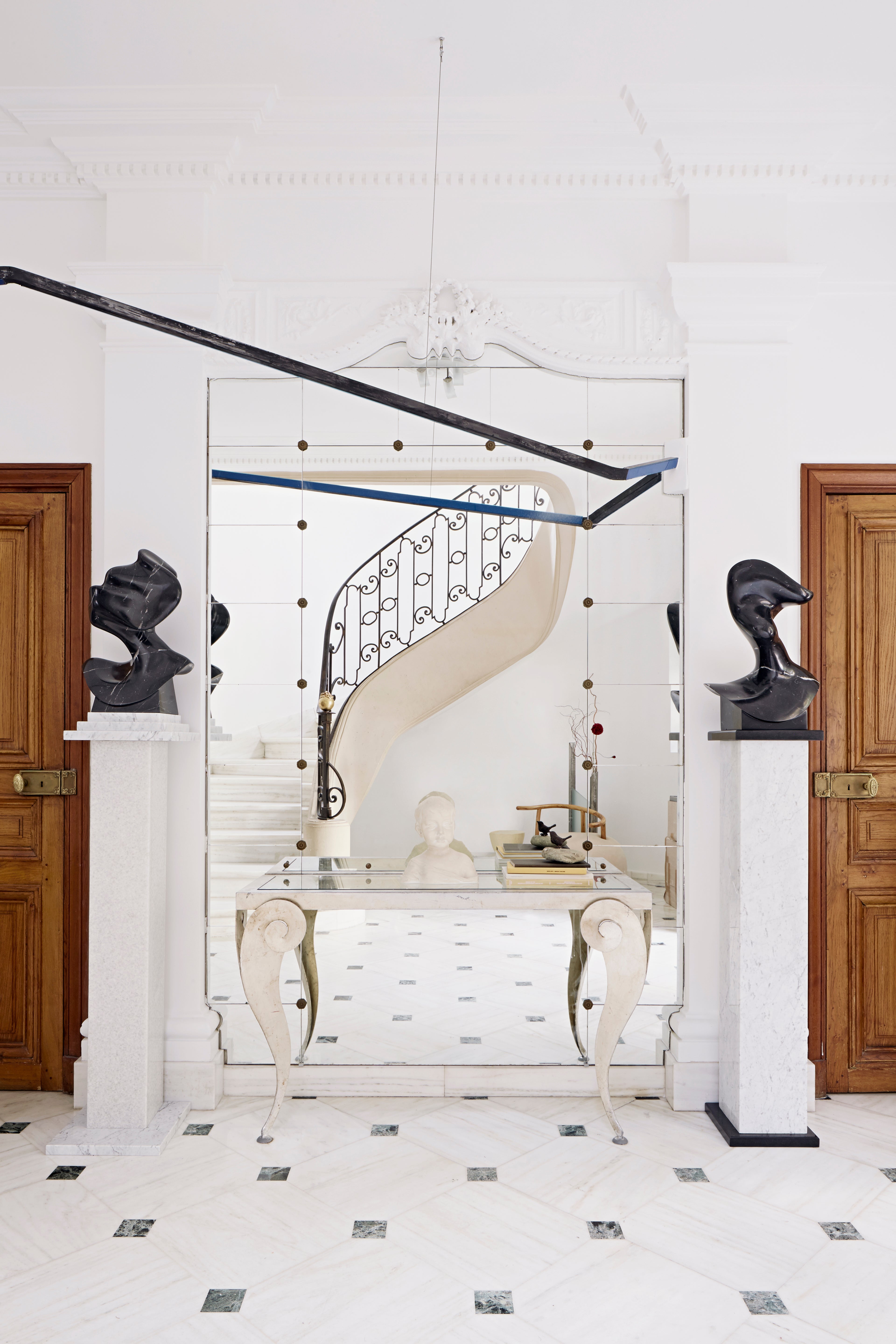 The residence, tucked away on a side street of Paris s illustrious eighth arrondisement, was designed around the refined and eclectic taste of the client’s family. The house itself, a stunning Haussmann-era hotel particulier, provides a setting in subtle contrast to the client’s extensive collection of modern Chinese art. The spaces are carefully curated to showcase these works of art — the material and color palette of each room takes cues from specific pieces. In order to mediate between the modern artworks and the rich Parisian home, custom furniture pieces were designed to highlight and create contrast between the two.