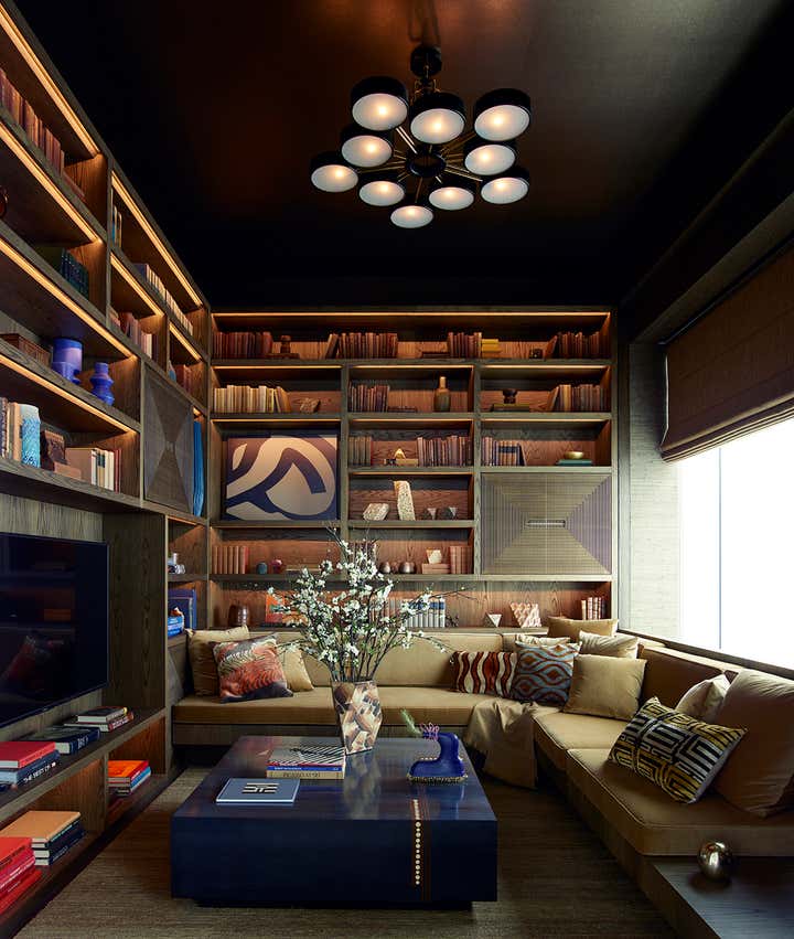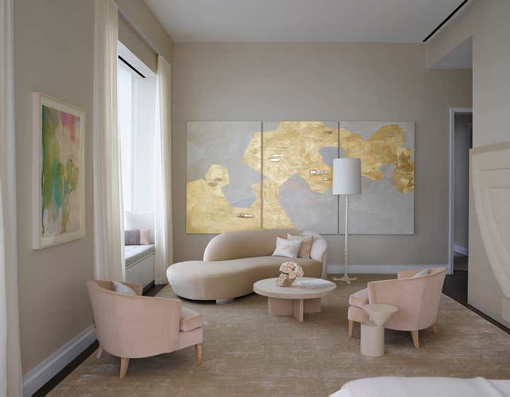 Perched near the top of this Rafael Vinoly designed Park Avenue tower, the highest residential building in the western hemisphere, this penthouse apartment gives new meaning to the notion of living with your head in the clouds. The idea was to create the perfect vantage point from which to enjoy the unparalleled views of Manhattan, the materials and palette were kept warm and luxurious, with touches of gold strategically scattered throughout. Key design elements are the custom bas-relief plaster wall by Callidus Guild that was based on an art deco pattern from Kelly s archive, a shaped silk rug that follows the outline of the omni-directional sofa, a jagged glass chandelier by Jason Koharik that mimics the city skyline, a walnut panelled library that emits a beckoning glow and a 20 foot long channel tufted headboard that is an homage to Frank Stella s iconic Protactor Series of paintings from the 1970 s. Artwork by such luminaries as Lynda Benglis, Helen Frankenthaler, Juan Usle, Jack Pierson and Dean Levin create the vibe of a living gallery in the sky.