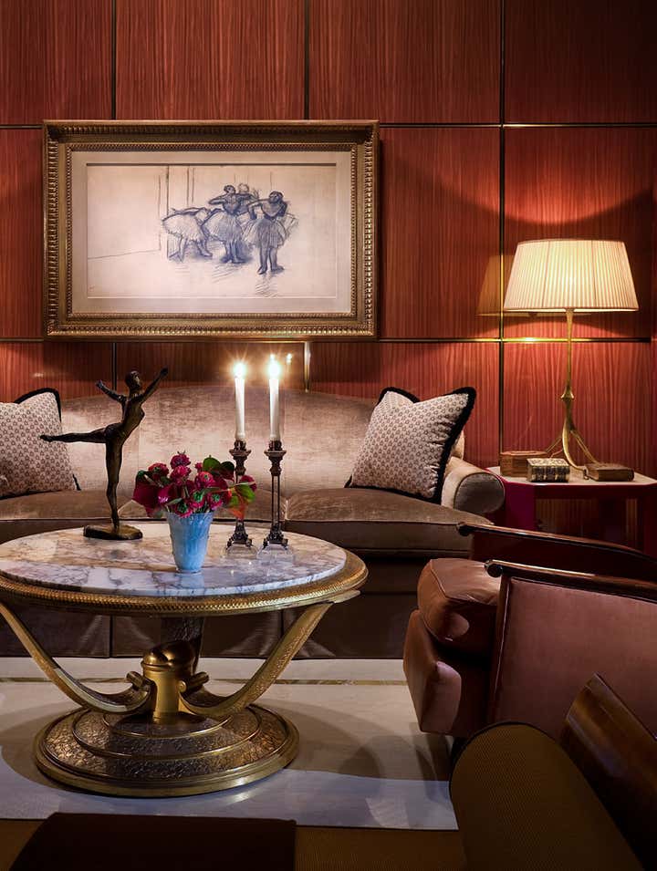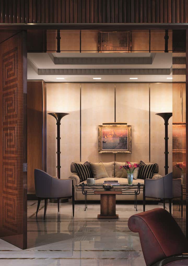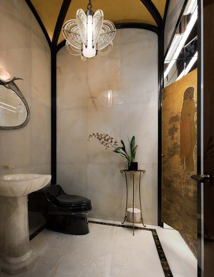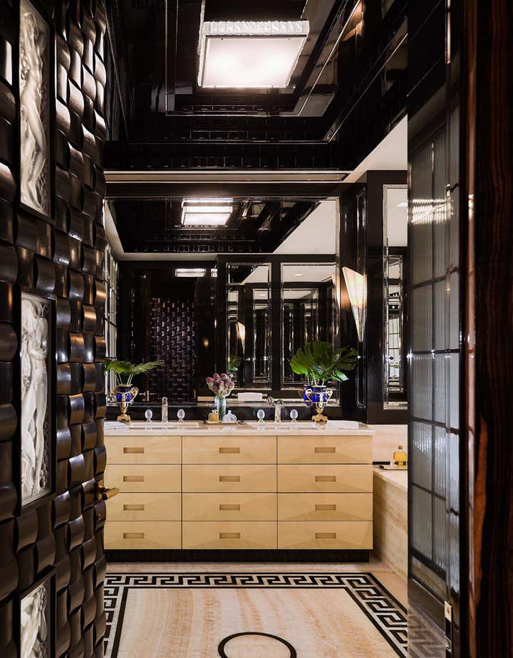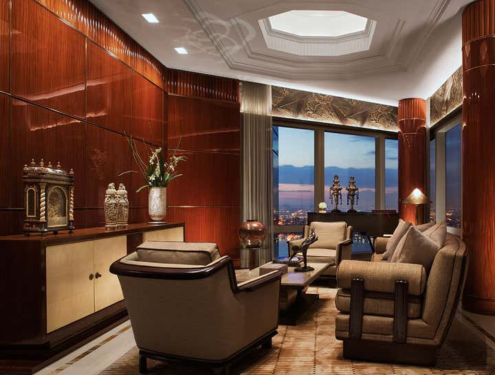 A 75th floor penthouse with breathtaking wrap-around views of New York City and the Hudson river . A mix of different materials such as rare woods with bronze inlays, marbles, onyx and parchment creates a comfortable and elegant environment for the extensive art deco and art collection. And, as always, a great deal of time was paid to the attention of the smallest details.