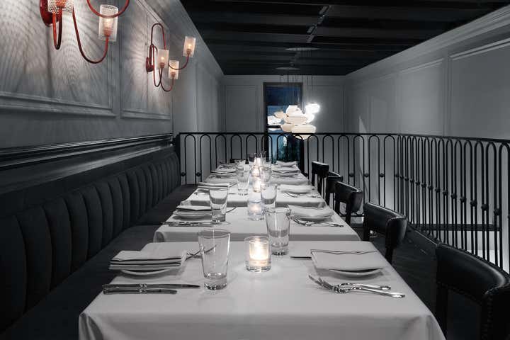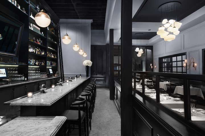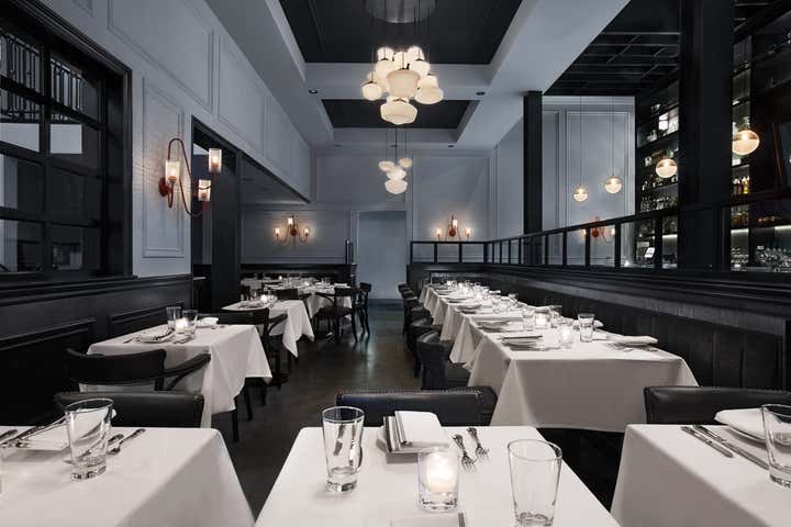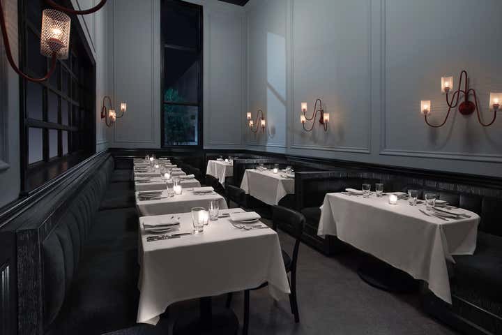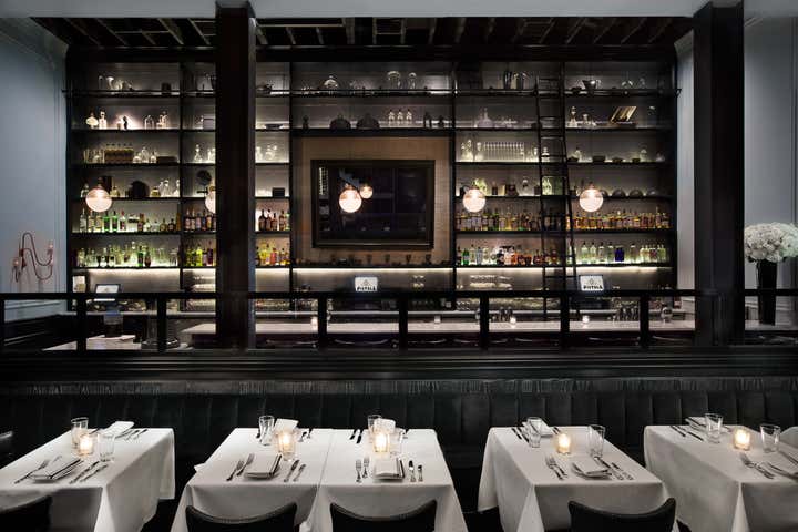 Los Angeles’ Pistola captures the spirit of traditional 1950s New York Italian establishments while also injecting a modern, artful twist in both design and cuisine. Pistola invites diners to indulge in unique dining experience, while feeling embraced by a comfortable and stimulating design-centric atmosphere. Perforated metal custom-made wall sconces inspired by French, Mid-century design line the walls. Chandeliers were custom-made from vintage milk glass fixtures. Custom-designed cerused oak banquettes with mohair upholstery paired with classic Italian bistro chairs round out the space.