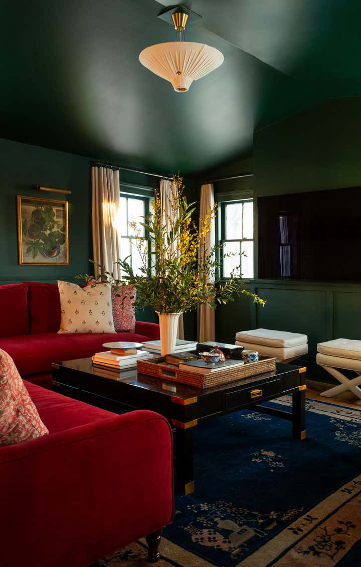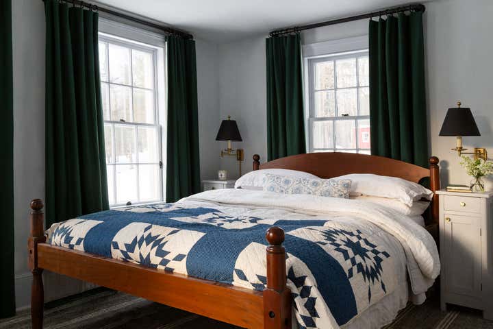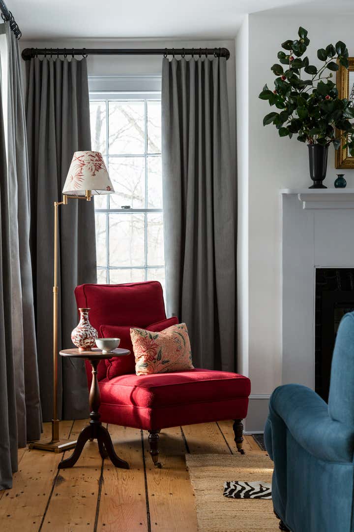 We took a historic home that had seen better days and reworked windows, floor plans, raised roofs, and thoroughly renovated the kitchen and baths with a mix of architectural salvage and ingenuity. Our goal was to create a comfortable and cozy home inspired by the British countryside and Colonial America. We sourced an Aga oven, designed Shaker-inspired cabinetry, fabricated custom furniture, and decorated it in a moody palette, and layered old-world textiles.