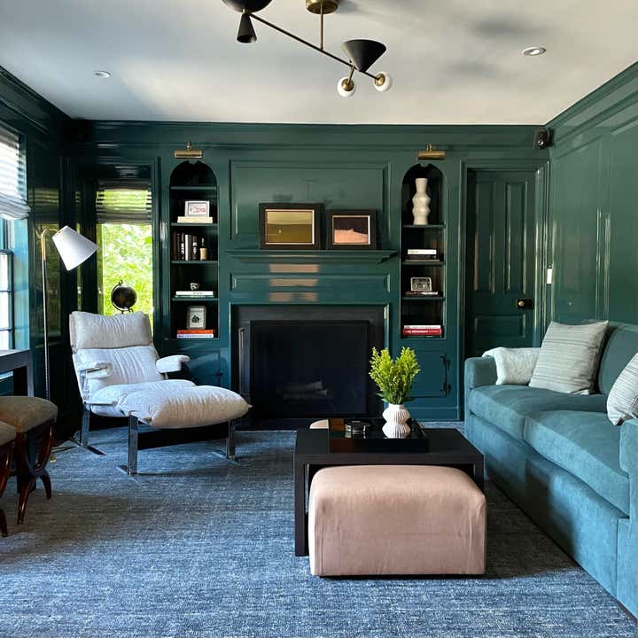 In the first stage of the home’s ongoing renovation, Studio AK addressed the traditional style den to modernize the space for its new owners, a young family. The existing crafted oak paneling and its built-ins are carried into the 21st century with a high gloss finish of Benjamin Moore’s Yorktowne Green. Vintage furnishings from the pre-war era mingle with contemporary furnishings to honor the home’s historic charm, blending past and present. The custom-designed sofa mirrors the glossy wood paneling with calmer, teal velvet upholstery accented with Jayson Home and Hackner Home pillows. The carefully selected materials, including wool and indoor/outdoor synthetic fabrics, layer additional texture with high durability to keep up with a growing family. A pillowy chair and ottoman sourced from 1stDibs are reupholstered in Kravet fabric for the utmost comfort. The near CB2 floor lamp designates a calm reading nook. Centering the room, a Maiden Home coffee table and pale leather ottomans sit atop a Loloi area rug preserving the home’s original leather floor tiles. Above a contemporary lighting fixture, an Etsy find, adds a warm flow to supplement incoming natural light incoming from tall windows. The cool, curated blend of textures and furnishings spans eras to bridge generations and set the tone for the colonial’s ongoing renovation.