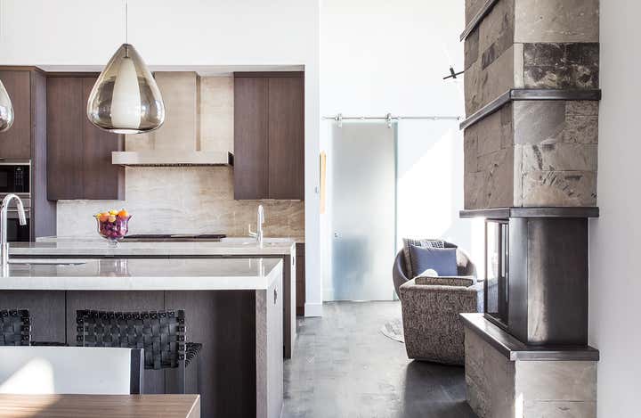 Befitting its equestrian neighborhood, this modern take on a farmhouse offers distinct spaces for three generations to enjoy each other and the great outdoors. Rustic textures and warm scents emanate throughout its 6,000 square feet – from exteriors clad in Corten steel, stone and cedar to interior closets and walls featuring barn wood. The great room lives up to its name – offering sweeping views overlooking the ski mountains – anchored by a massive kitchen featuring two islands. A double-height family room centers the lower level’s accommodations for guests and grandchildren, while the main level offers a gracious master suite for the retiree owners. Chic metal screens, cleverly connected walkways and a cozy reading nook under the staircase are among the many surprising delights in this welcoming home.