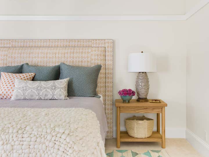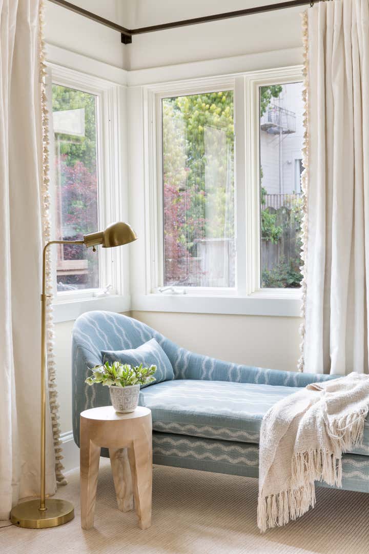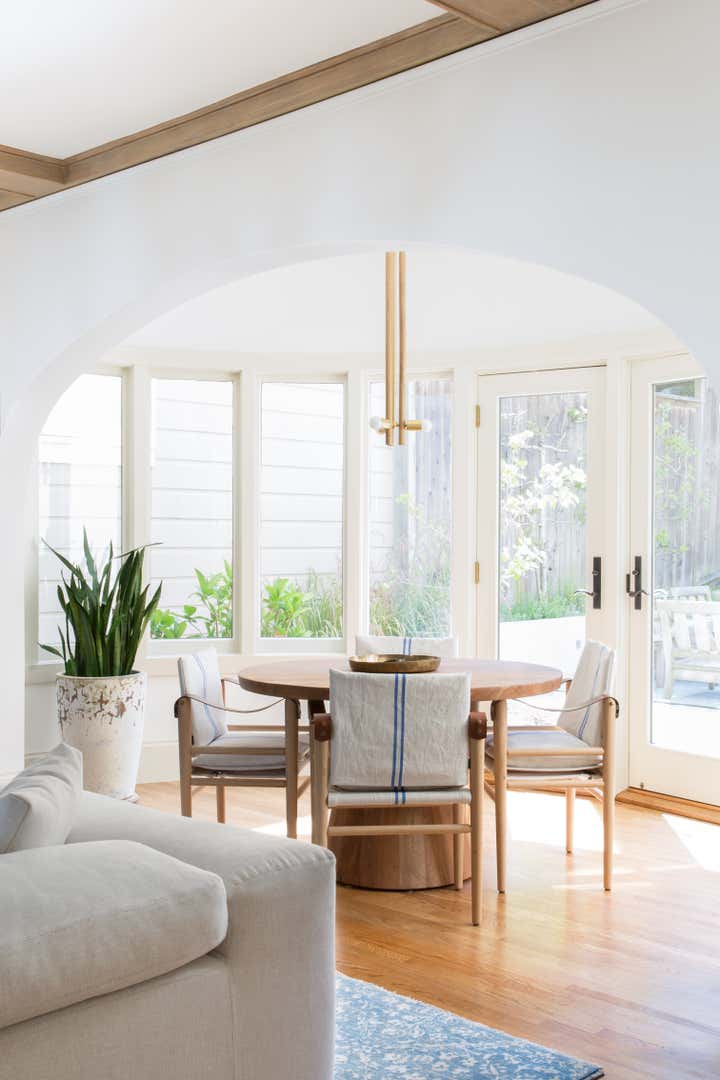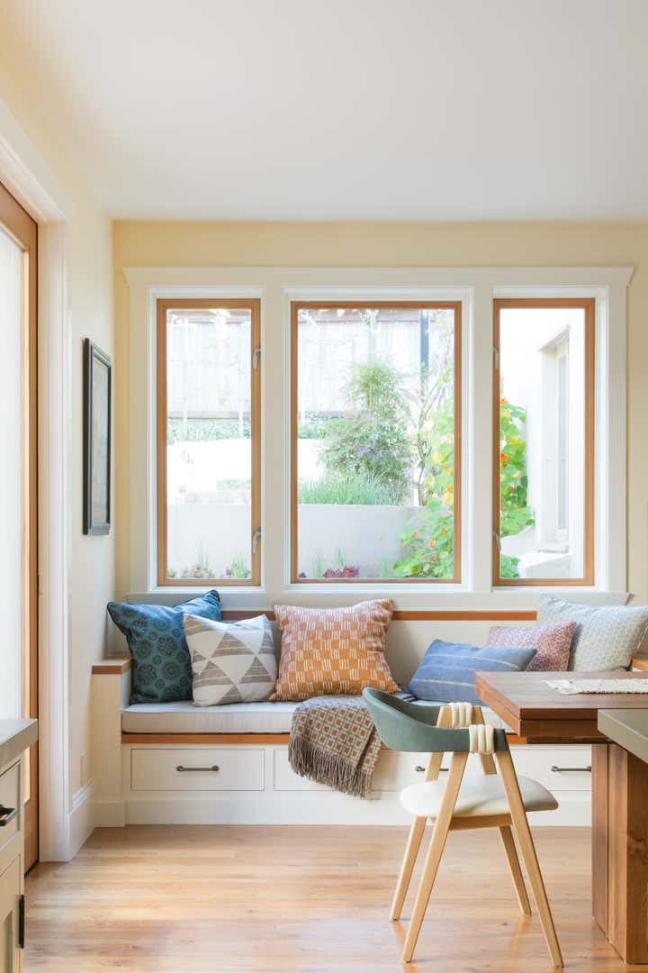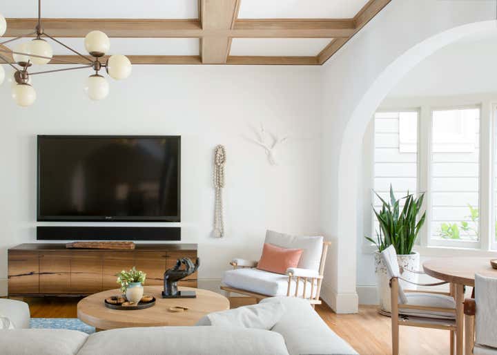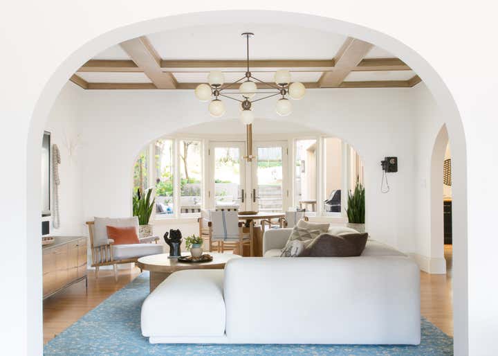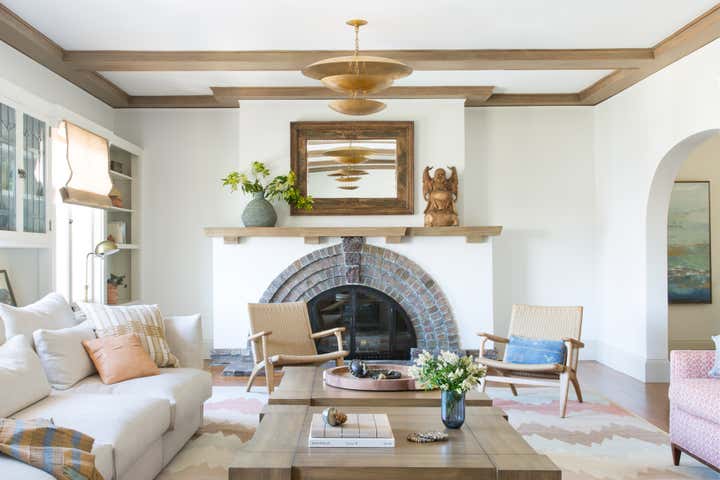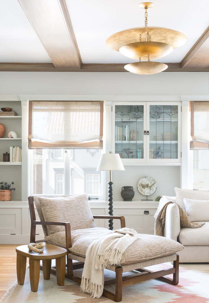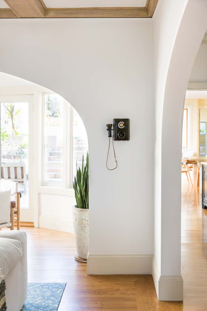 Our well-traveled clients were soon-to-be empty nesters when they approached us for help reimagining their Presidio Heights home. The expansive Spanish-Revival residence originally constructed in 1908 had been substantially renovated 8 year prior, but needed some adaptations to better suit the needs of a family with three college-bound teens. We evolved the space to be a bright, relaxed reflection of the family’s time together, revising the function and layout of the ground-floor rooms and filling them with casual, comfortable furnishings and artifacts collected abroad. One of the key changes we made to the space plan was to eliminate the formal dining room and transform an area off the kitchen into a casual gathering spot for our clients and their children. The expandable table and coffee/wine bar means the room can handle large dinner parties and small study sessions with similar ease. The family room was relocated from a lower level to be a more central part of the main floor, encouraging more quality family time, and freeing up space for a spacious home gym. In the living room, lounge-worthy upholstery grounds the space, encouraging a relaxed and effortless West Coast vibe. Exposed wood beams recall the original Spanish-influence, but feel updated and fresh in a light wood stain. Throughout the entry and main floor, found artifacts punctate the softer textures—ceramics from New Mexico, religious sculpture from Asia, and a quirky wall-mounted phone that belonged to our client’s grandmother.