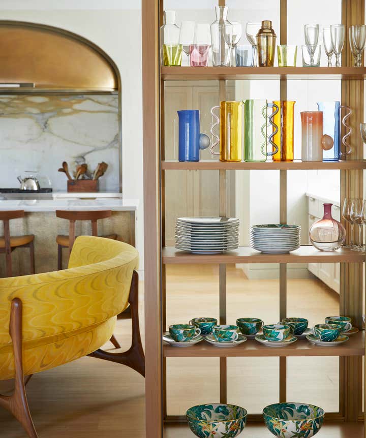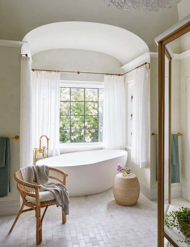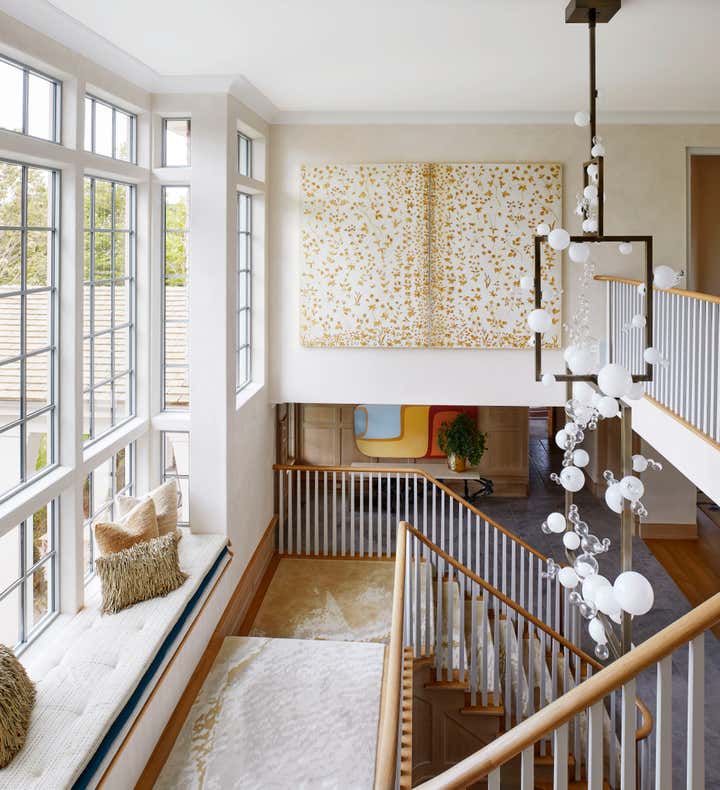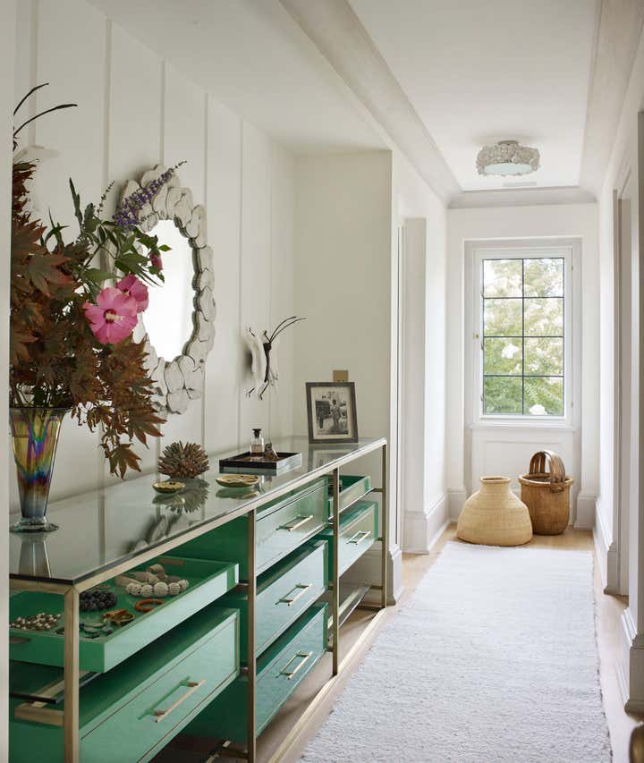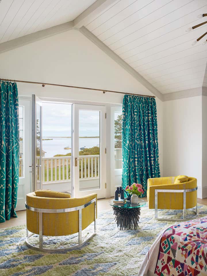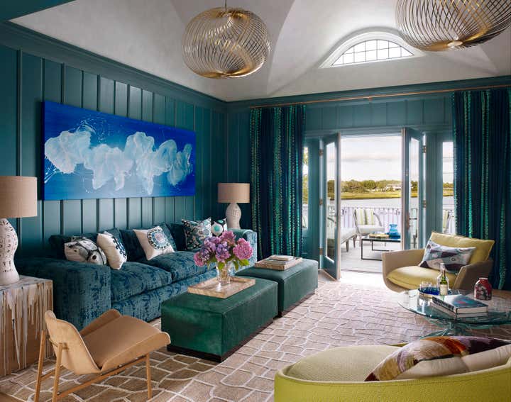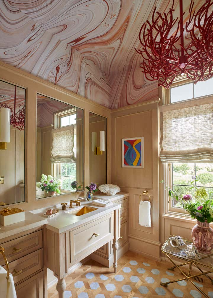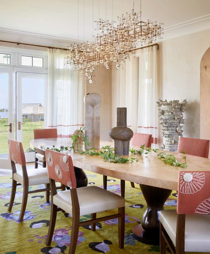 Once inside, you are transported to a melange of our client’s most cherished places, both real and literary in inspiration. With each new room employing layers of the weird and wild; nature, history, and, art combine to defy the traditional Hamptons all-white palate, creating a sort of deep summer color-soaked fever dream. One where flowers bloom from chandeliers, butterflies alight as sconces, rugs become fishing nets or ocean floors, and the walls and windows dance in their dressings.